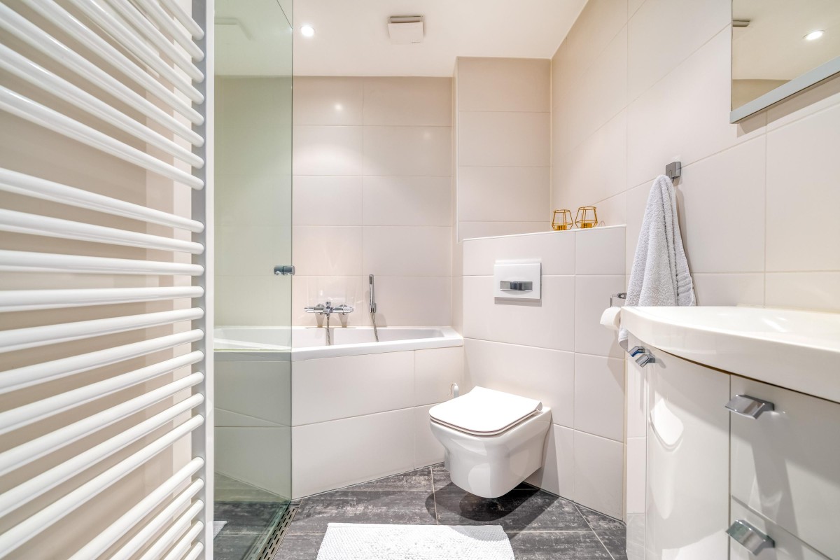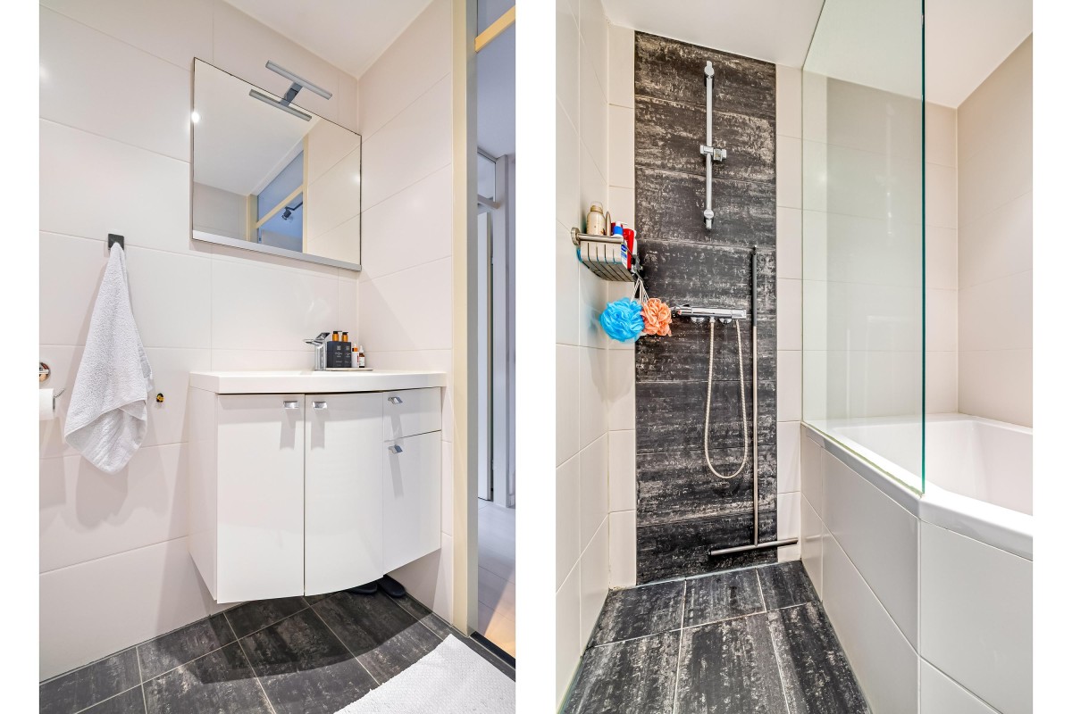 De badkamer is een oase van rust, met een bad, inloopdouche, toilet en wastafelmeubel.