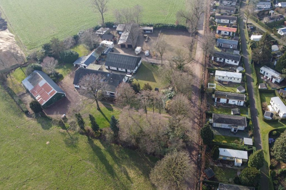 Achter de woning ligt een keurige berging met aangebouwde carport. Afmeting: circa 4,69 x 6,74 meter.