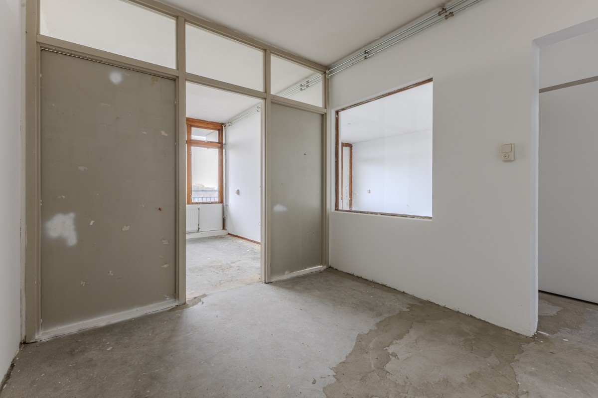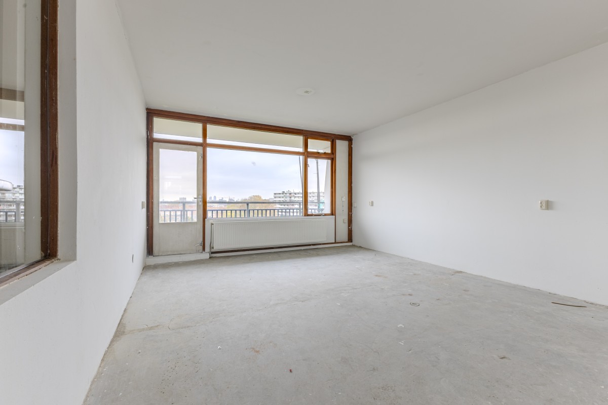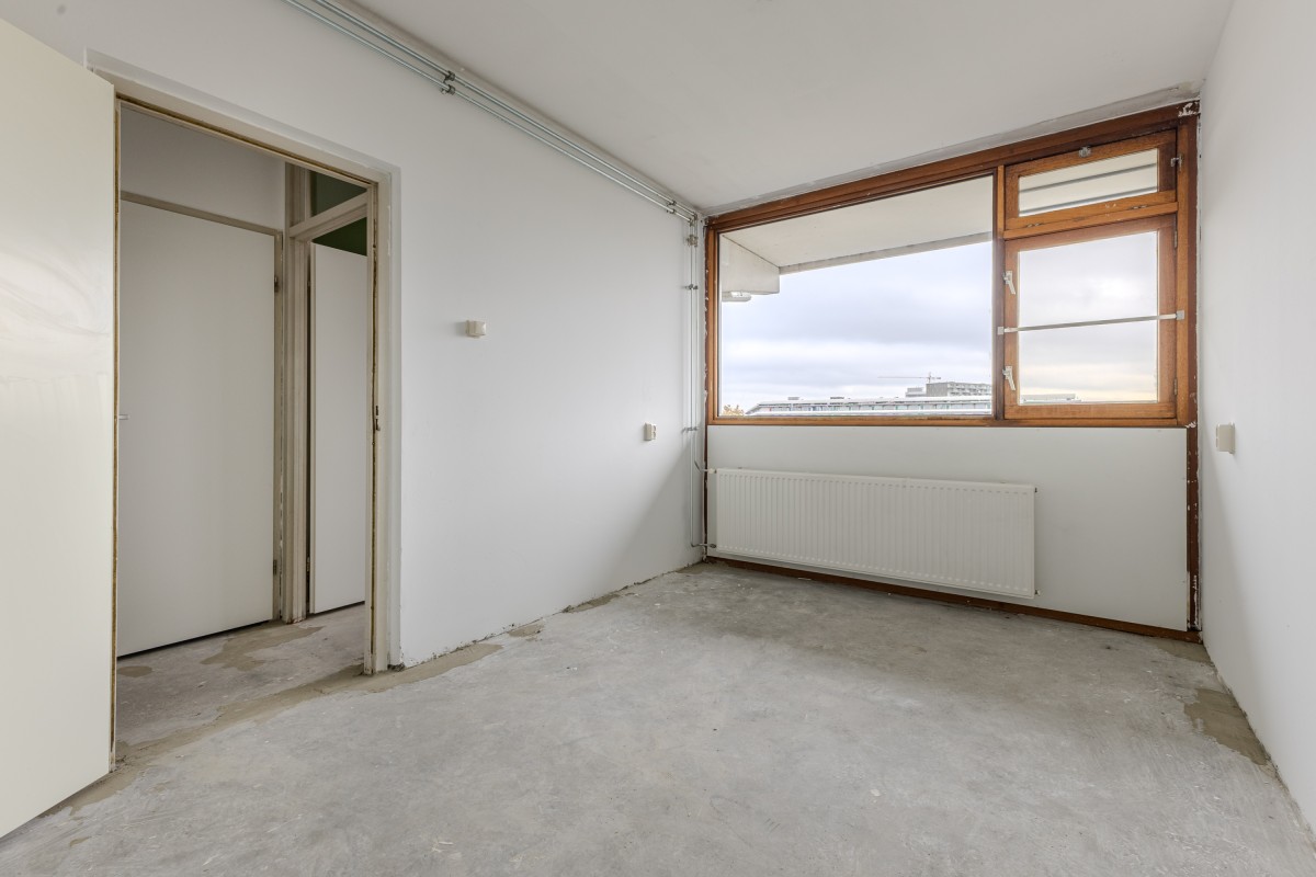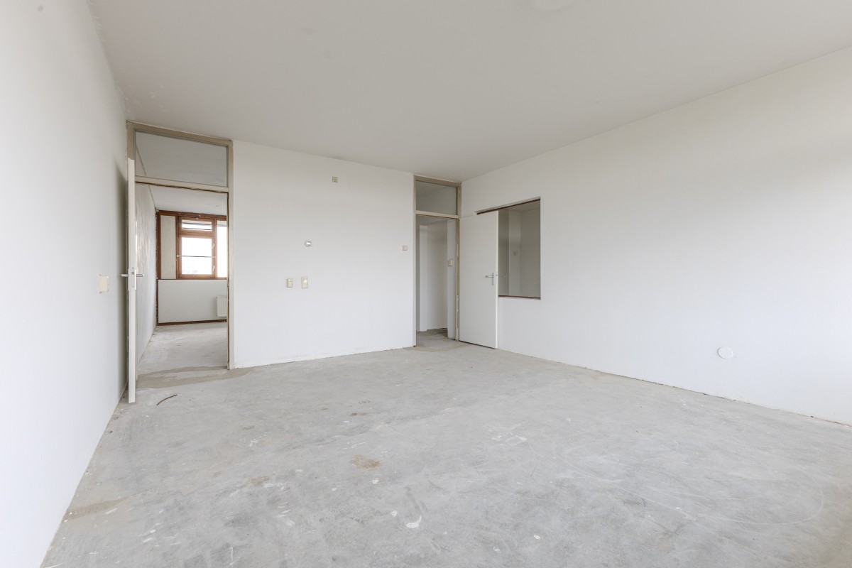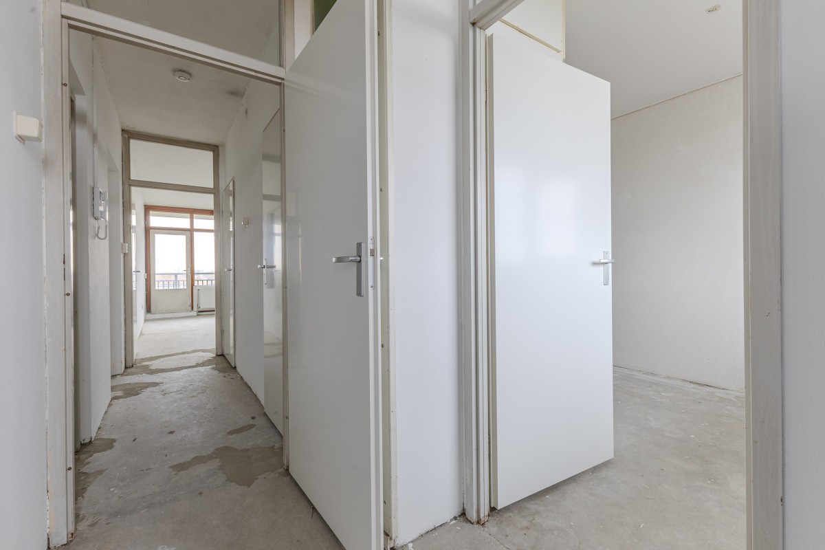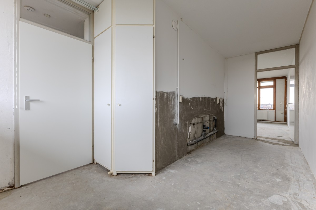 Via het gemeenschappelijke trappenhuis neemt u de lift naar de zevende verdieping, waarna u via een gedeelde galerij bij uw appartement komt. Bij binnenkomst komt u in een hal die toegang biedt tot de meterkast, de keuken en de rest van de woning. Aan de voorzijde bevindt zich de eerste goed bemeten slaapkamer, evenals de keuken, die nog naar eigen smaak kan worden afgewerkt.
