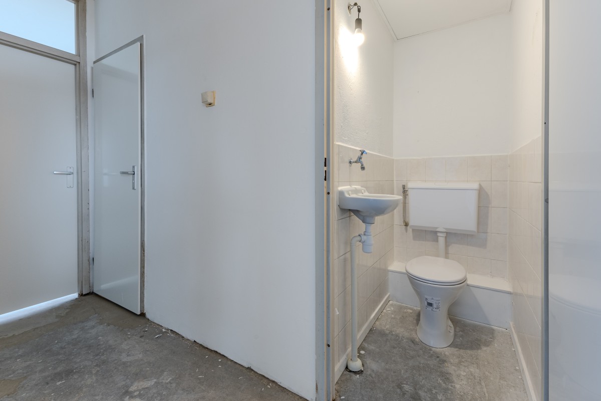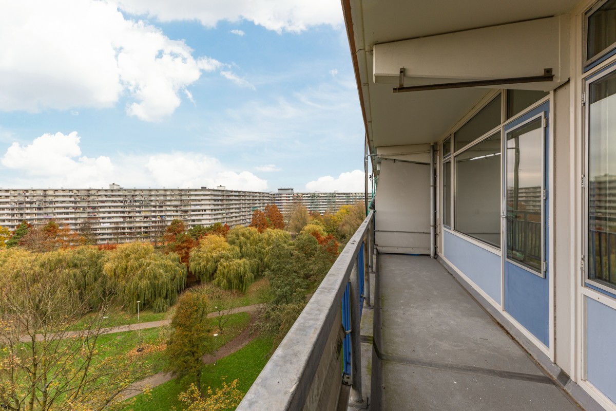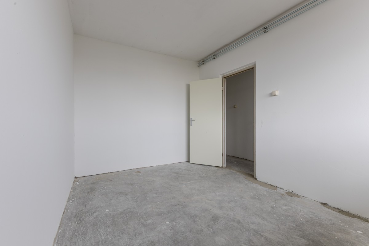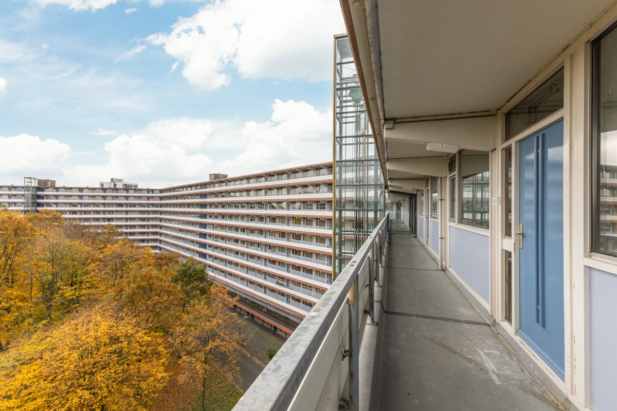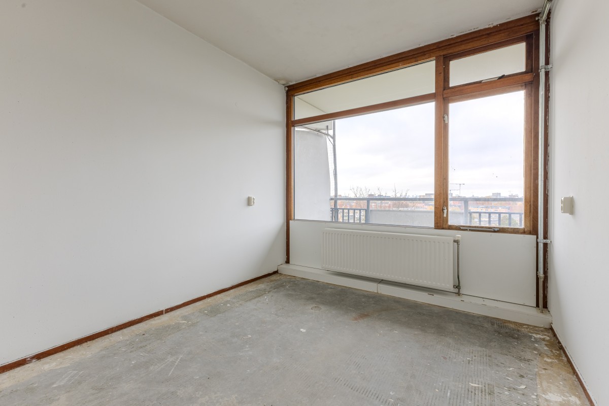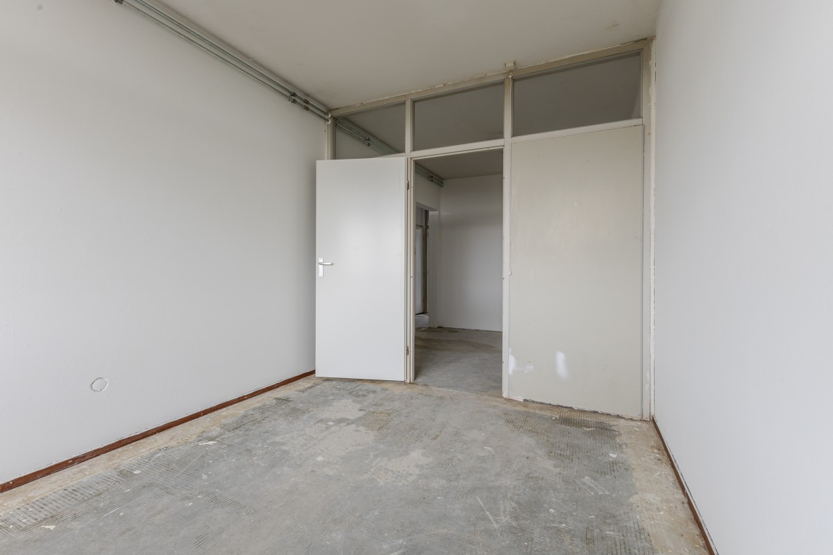 Via het gemeenschappelijke trappenhuis neemt u de lift naar de zevende verdieping, waarna u via een gedeelde galerij bij uw appartement komt. Bij binnenkomst komt u in een hal die toegang biedt tot de meterkast, de keuken en de rest van de woning. Aan de voorzijde bevindt zich de eerste goed bemeten slaapkamer, evenals de keuken, die nog naar eigen smaak kan worden afgewerkt.