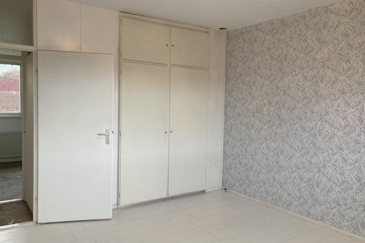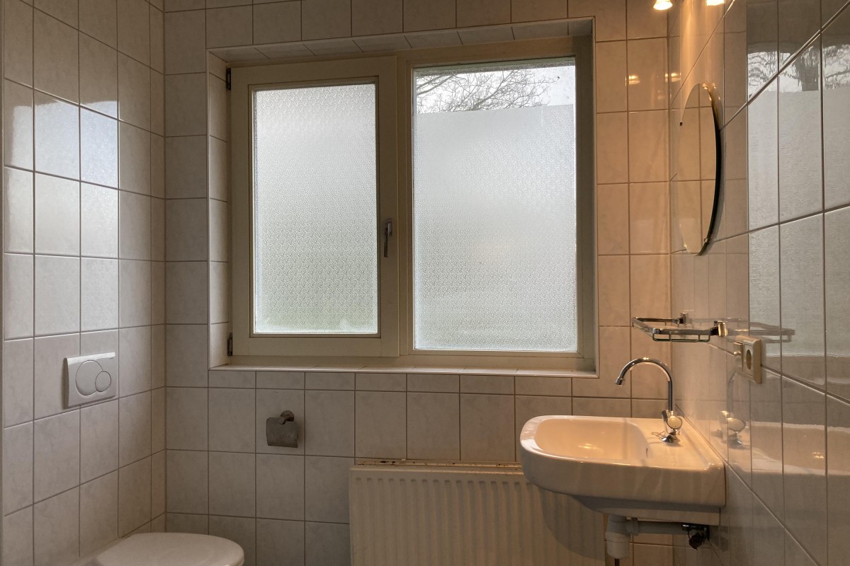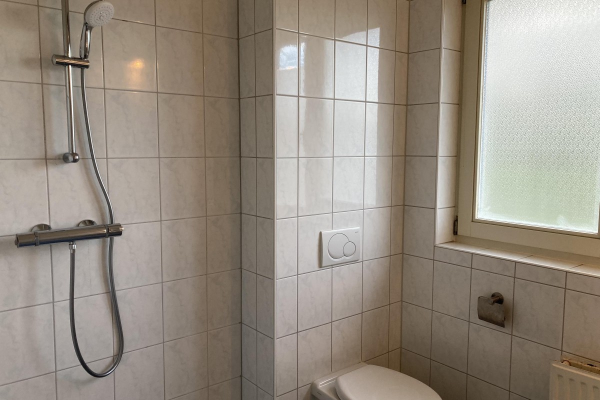 1e verdieping: overloop met een vaste kast en aangrenzend 3 mooie slaapkamers, waarvan 2 slaapkamers voorzien zijn van vaste kasten. De ruime badkamer is voorzien van een douche, een radiator, een hangcloset en een wastafel.