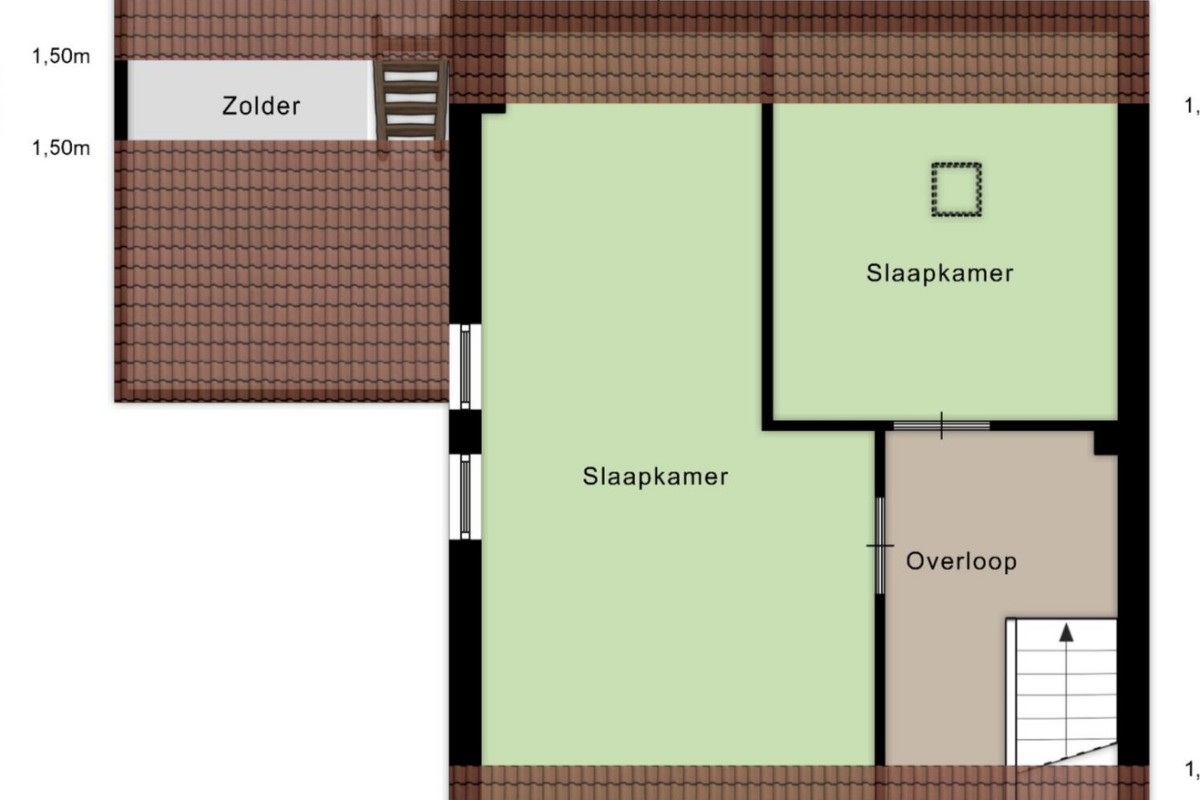 Ruime overloop; in totaal treft u twee slaapkamers op deze verdieping. Door de grootte van de verdieping bestaat er de mogelijkheid om hier meerdere kamers te creëren.