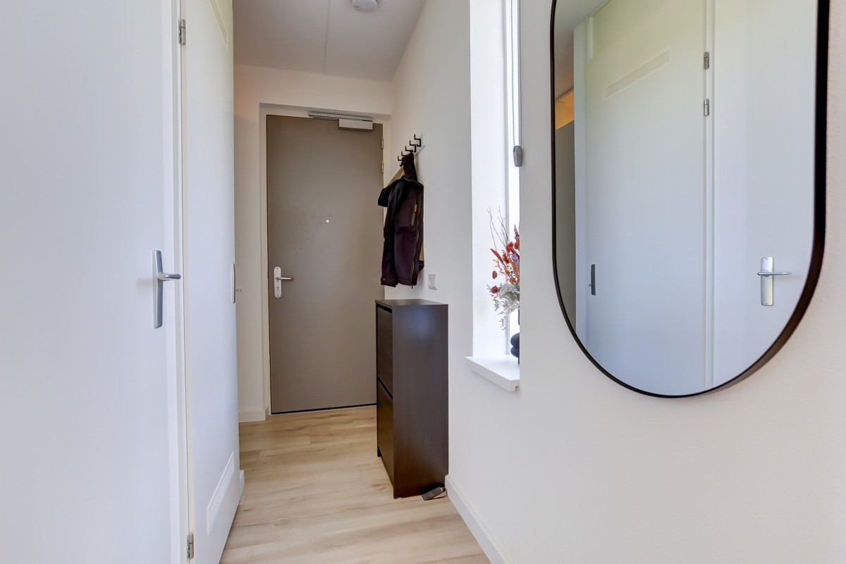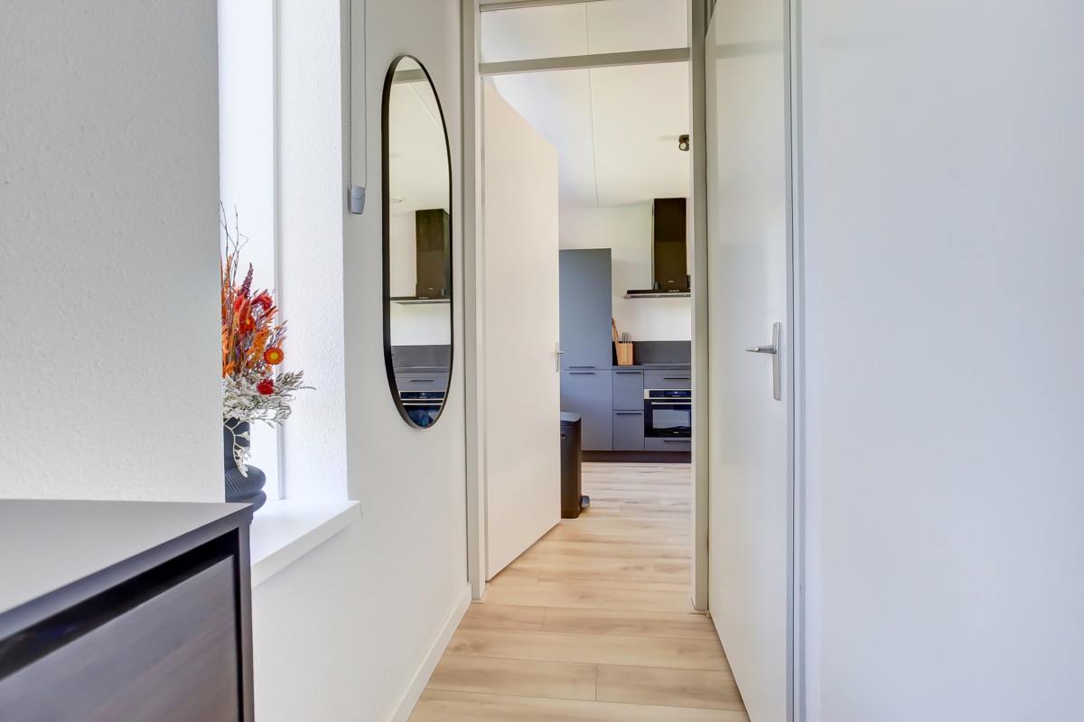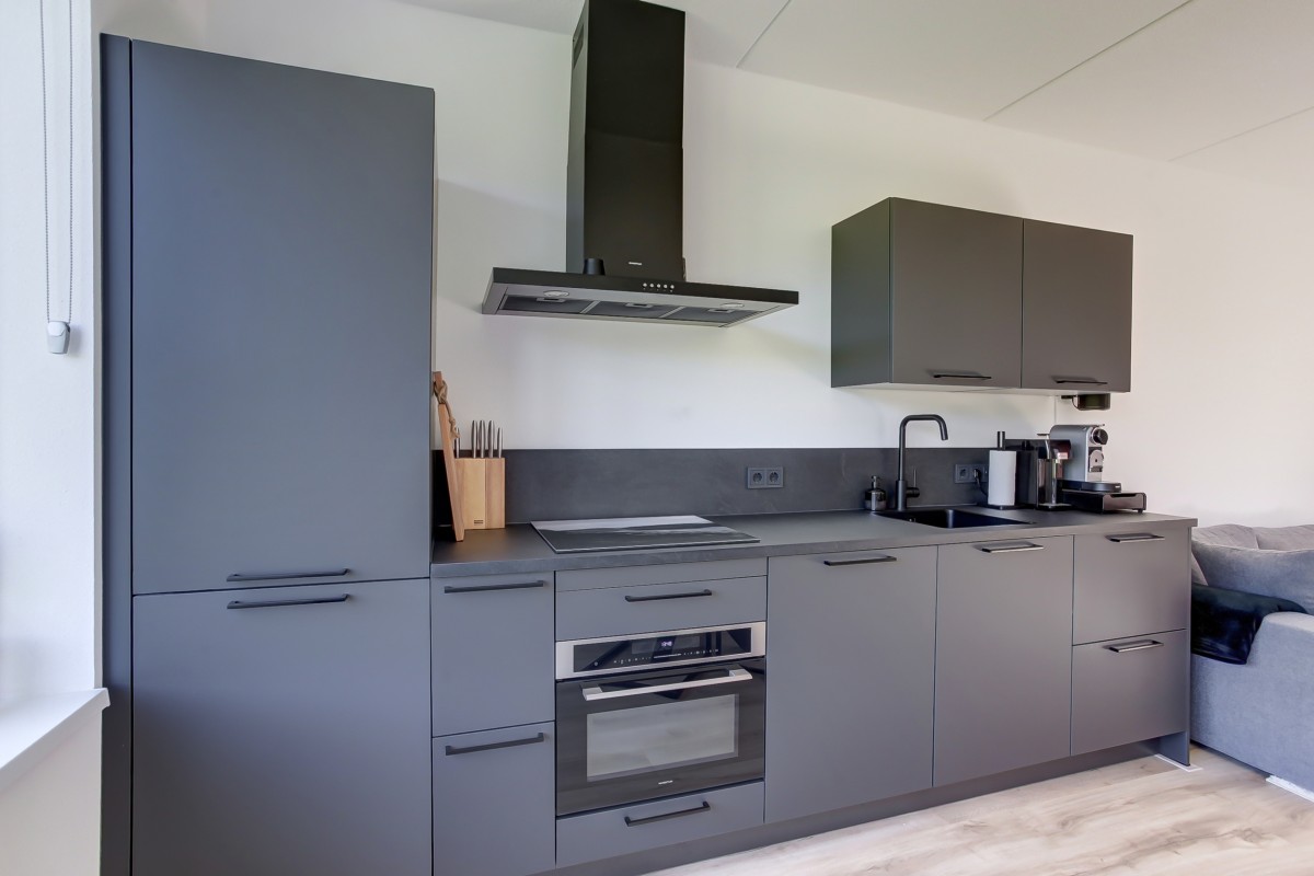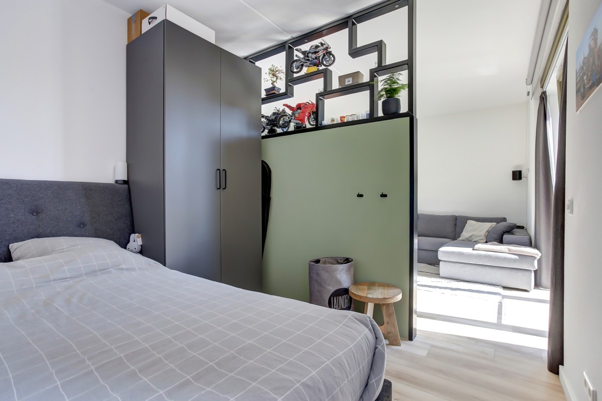 Lees verderEntree naar de hal met garderobe, uitgebreide meterkast en een ruime berging waar de warmtepomp, unit voor de vloerverwarming, omvormer voor de zonnepanelen, mv-unit en aansluiting voor de wasmachine gesitueerd zijn. De badkamer is voorzien van moderne betegeling, een hangcloset, inloopdouche met glazen wand en wastafel met meubel. De woonkamer betreft een mooie ruimte met Frans balkon op het zuiden en uitzicht over het binnenterrein alsmede groen voorziening aan de voorzijde van het complex. Deze ruimte is door een slimme wand gesplitst van het slaapgedeelte en de keuken. Het slaapgedeelte heeft eveneens een te openen raam met uitzicht op het binnenterrein. De luxe keuken is in moderne kleurstelling uitgevoerd en voorzien van veel kastruimte alsmede een ingebouwde combi-oven, inductiekookplaat met recirculatiekap, vaatwasser, koelkast en vrieskast. De studio is volledig voorzien van een comfortabele vloerverwarming en gecombineerd met een moderne laminaatvloer.