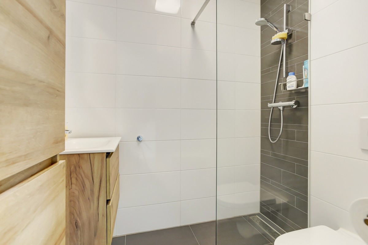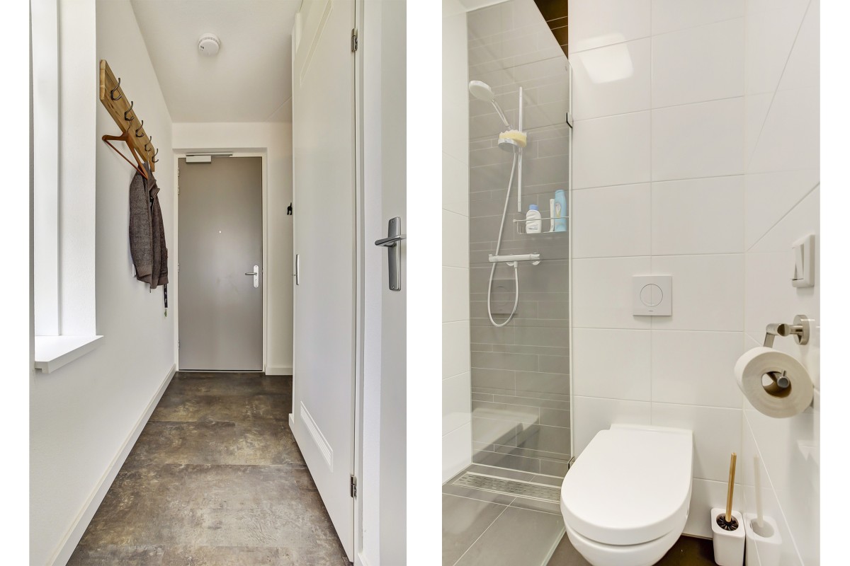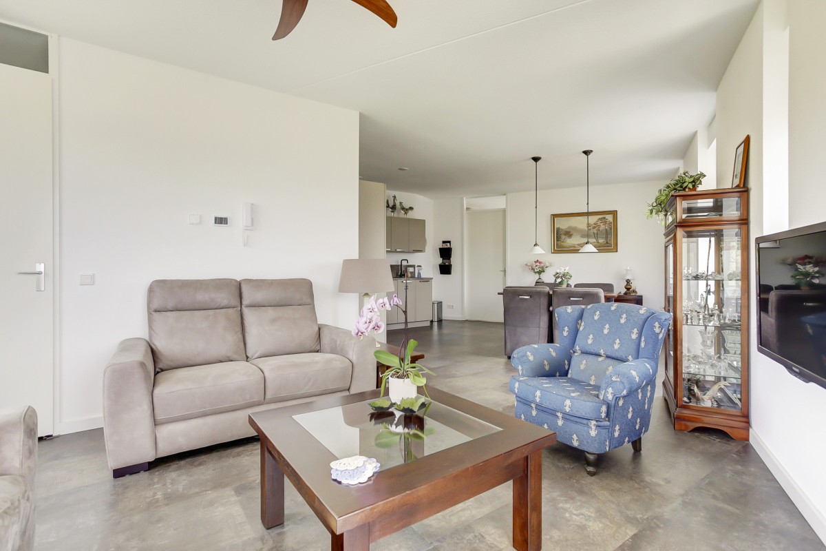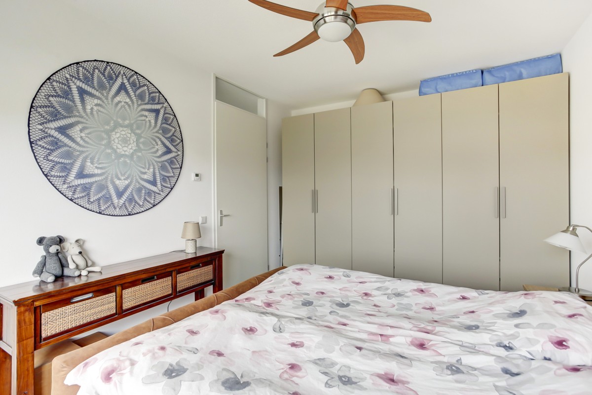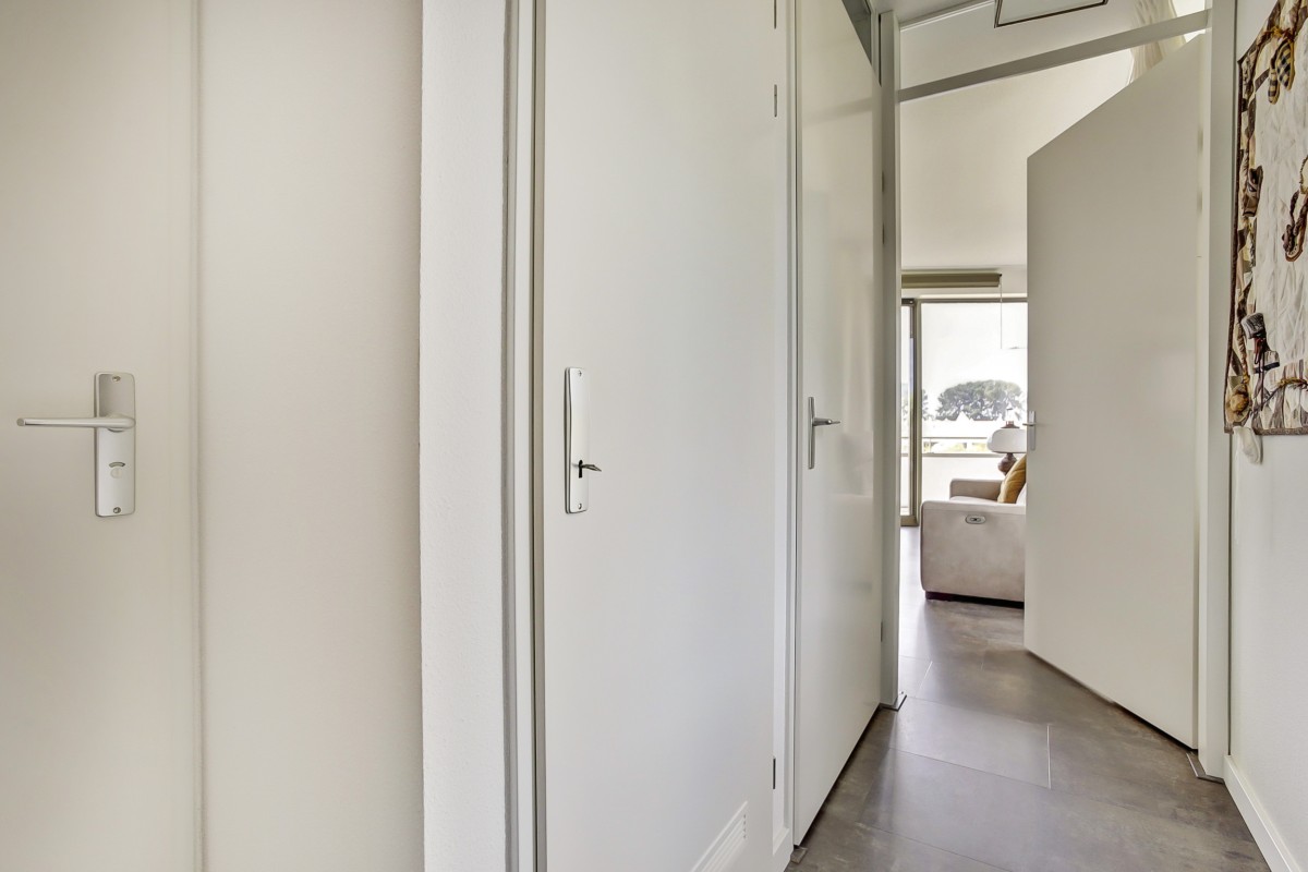 Appartement: entree naar de hal met garderobe, uitgebreide meterkast (3-fase) en een ruime berging waar de warmtepomp, unit voor de vloerverwarming, omvormer voor de 3 zonnepanelen, mv-unit en aansluiting voor de wasmachine en droger gesitueerd zijn. De badkamer is voorzien van moderne betegeling, een hangcloset, inloopdouche met glazen scherm, een hangkast en wastafel met meubel. De brede woonkamer betreft een mooie lichte ruimte met een schuifpui naar het balkon op het westen en vrij uitzicht over "Veldryck". De woonkamer heeft veel ramen en daarmee een heerlijke lichtinval. De moderne keuken is uitgevoerd met fronten in een taupe kleurstelling met marmerlook werkblad en is in een hoek opgesteld. De keuken biedt veel kastruimte en een groot werkblad. Tevens is de keuken voorzien van een ingebouwde koel-/vriescombinatie, vaatwasser, combimagnetron en 4-pits inductiekookplaat met rvs afzuigkap. Aangrenzend aan de woonkamer is de mooie grote slaapkamer gelegen met eveneens uitzicht op het westen.