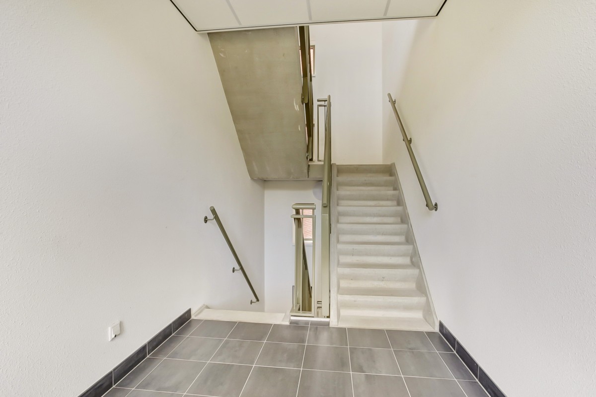 Begane grond: centrale ingang met het bellentableau en brievenbussen naar de gemeenschappelijke hal waar het trappenhuis toegang biedt tot het appartement op de eerste verdieping. Een separate ingang geeft toegang
