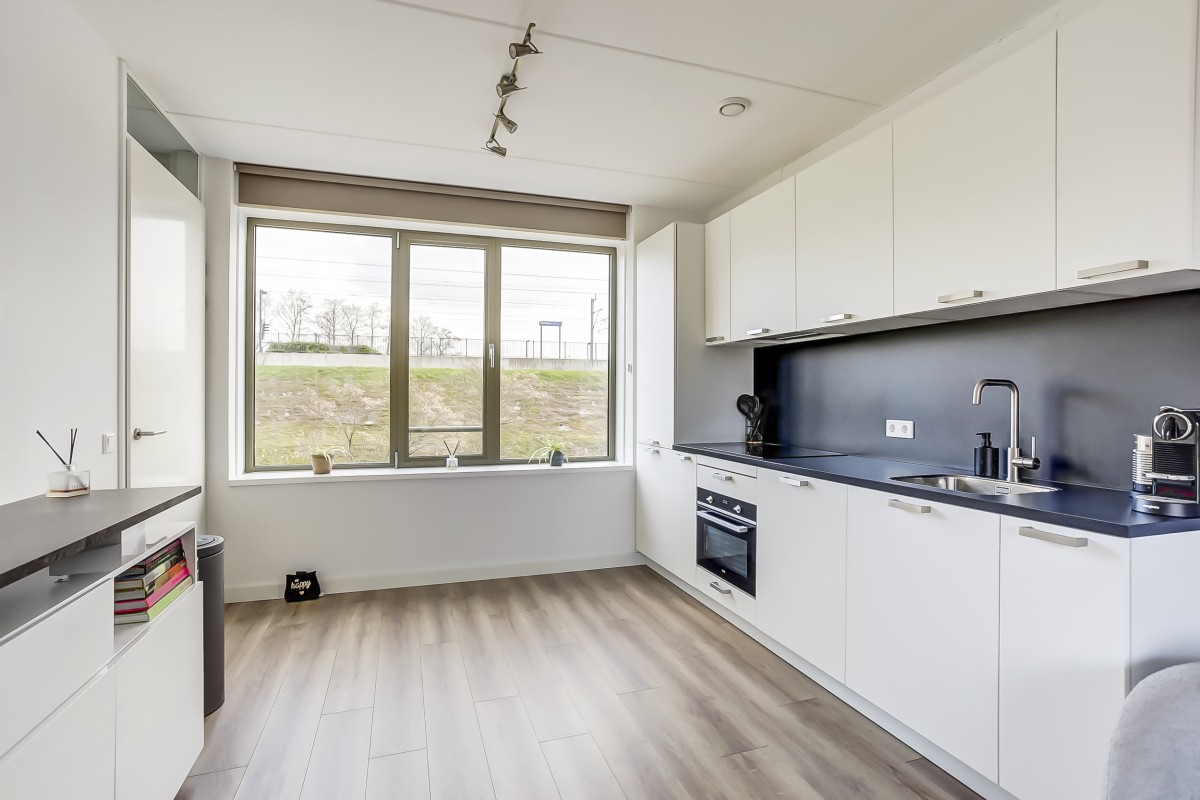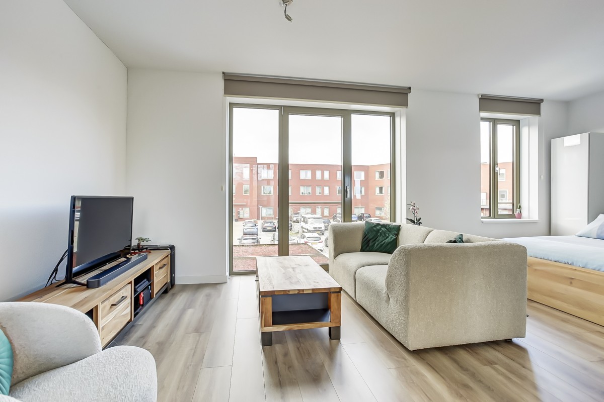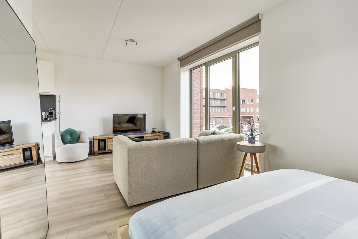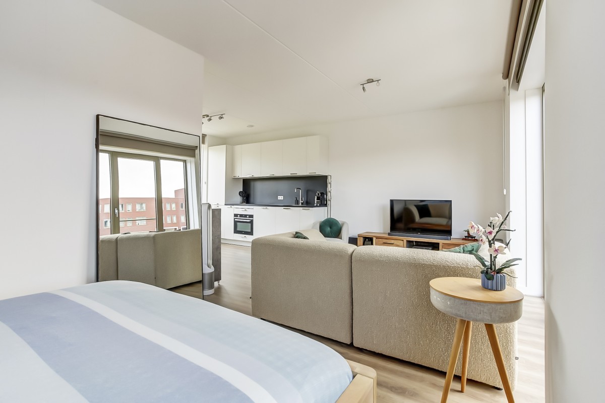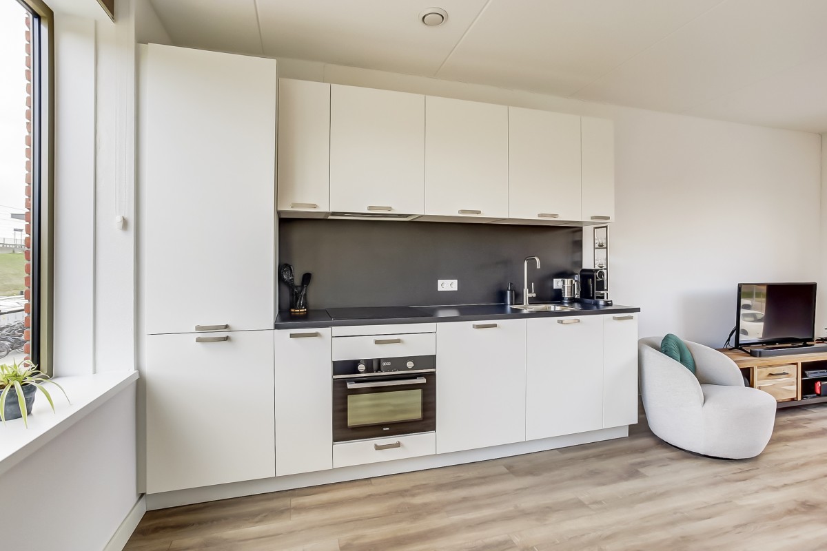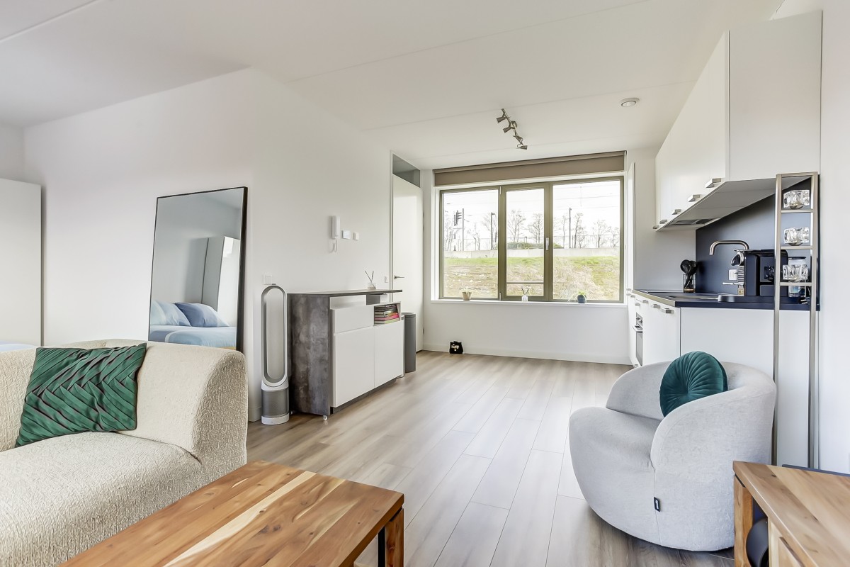 Lees verderEntree naar de hal met garderobe, uitgebreide meterkast en een ruime berging waar de warmtepomp, unit voor de vloerverwarming, omvormer voor de zonnepanelen, mv-unit en aansluiting voor de wasmachine gesitueerd zijn. De badkamer is voorzien van moderne betegeling, een hangcloset, inloopdouche met glazen wand en wastafel met meubel. De woonkamer betreft een open ruimte met frans balkon en uitzicht over het binnenterrein alsmede groen voorziening aan de voorzijde van het complex. Deze open ruimte biedt tevens een ruim slaapgedeelte. De luxe keuken is in moderne kleurstelling uitgevoerd en voorzien van een ingebouwde combimagnetron, inductiekookplaat met inbouw-afzuiging, vaatwasser, apothekerskast en koel-/vriescombinatie. De studio is volledig voorzien van een comfortabele vloerverwarming en op de badkamer na gecombineerd met een moderne laminaatvloer.