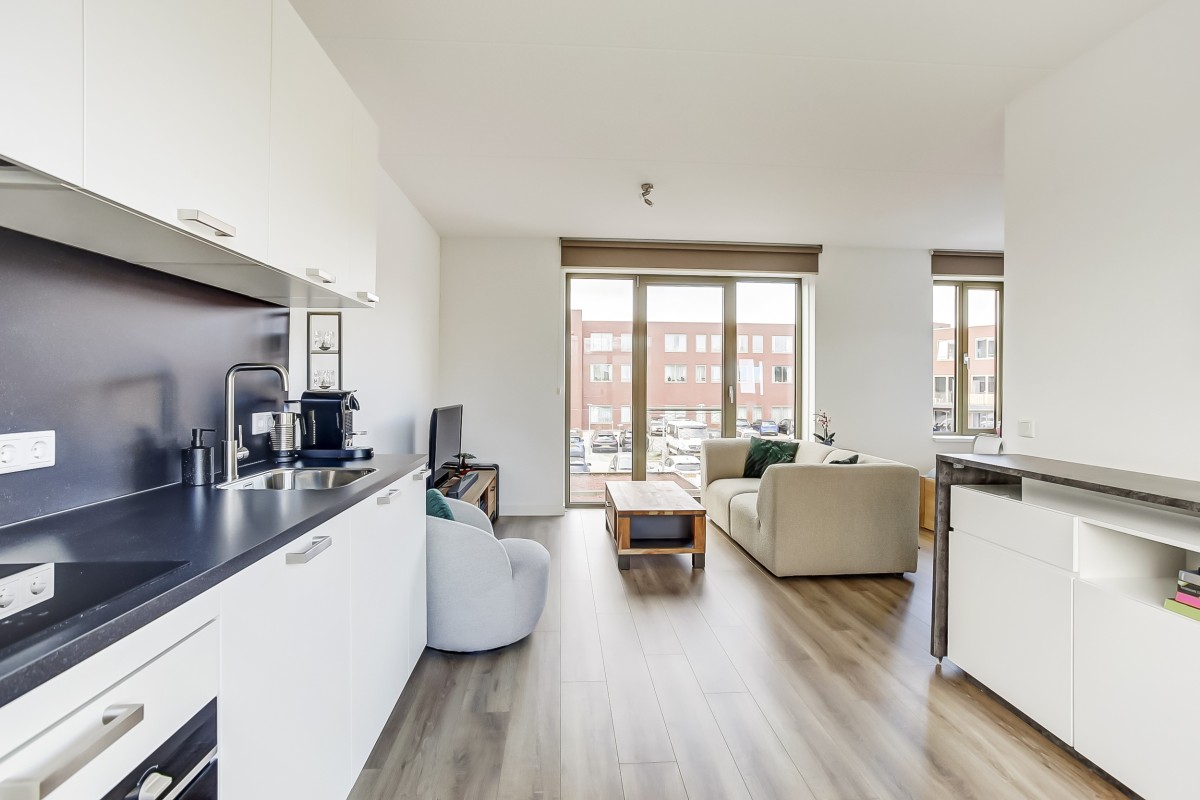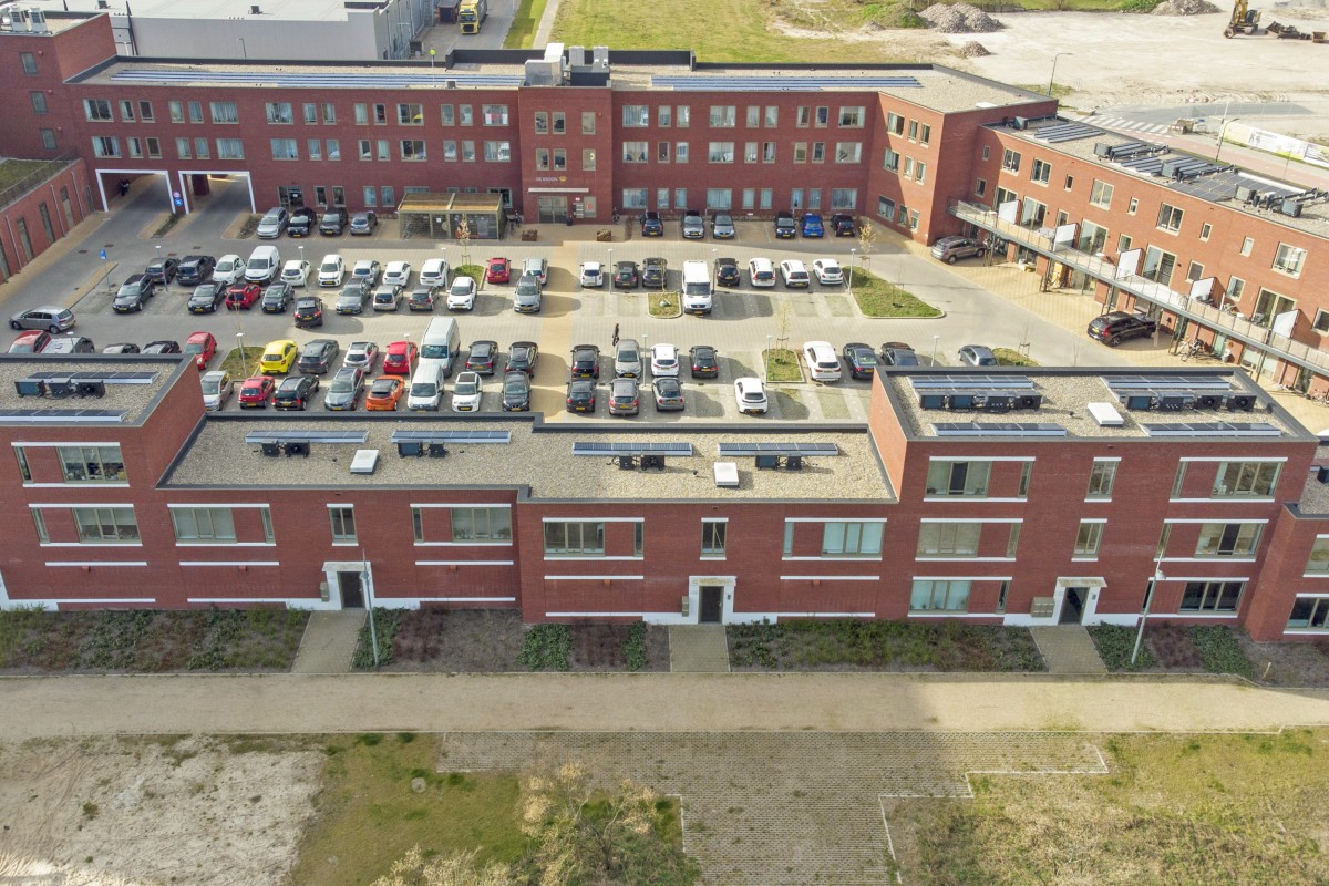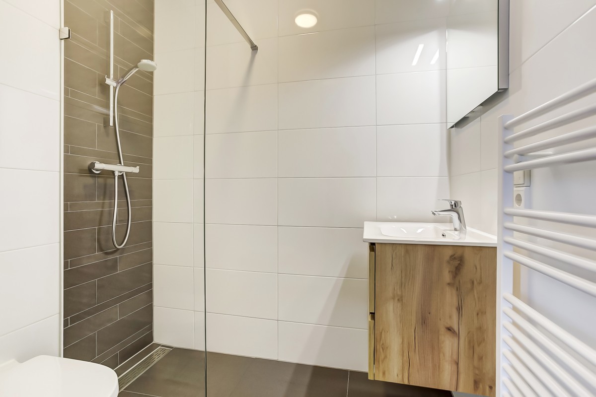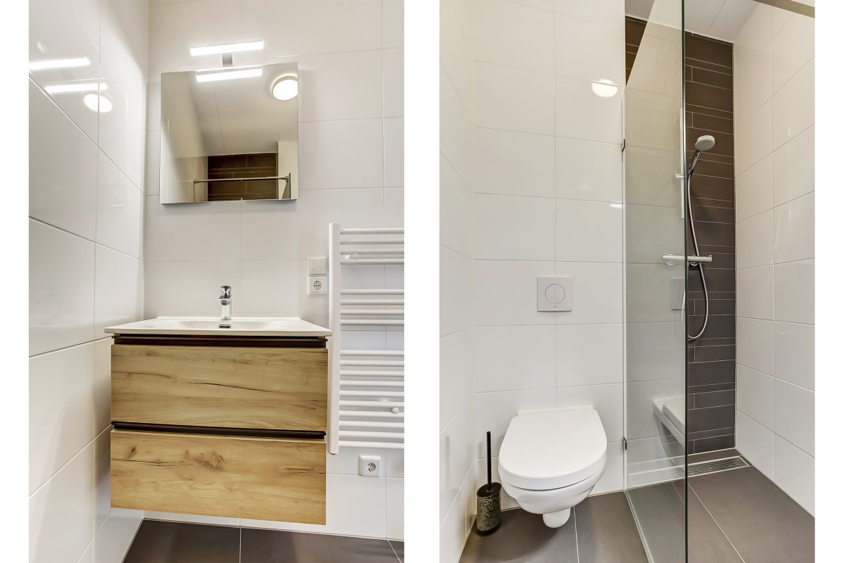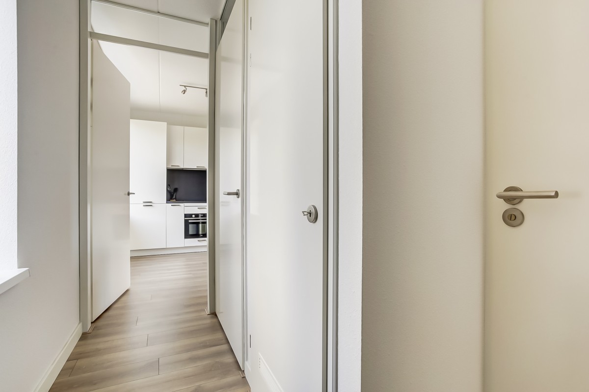 Lees verderEntree naar de hal met garderobe, uitgebreide meterkast en een ruime berging waar de warmtepomp, unit voor de vloerverwarming, omvormer voor de zonnepanelen, mv-unit en aansluiting voor de wasmachine gesitueerd zijn. De badkamer is voorzien van moderne betegeling, een hangcloset, inloopdouche met glazen wand en wastafel met meubel. De woonkamer betreft een open ruimte met frans balkon en uitzicht over het binnenterrein alsmede groen voorziening aan de voorzijde van het complex. Deze open ruimte biedt tevens een ruim slaapgedeelte. De luxe keuken is in moderne kleurstelling uitgevoerd en voorzien van een ingebouwde combimagnetron, inductiekookplaat met inbouw-afzuiging, vaatwasser, apothekerskast en koel-/vriescombinatie. De studio is volledig voorzien van een comfortabele vloerverwarming en op de badkamer na gecombineerd met een moderne laminaatvloer.