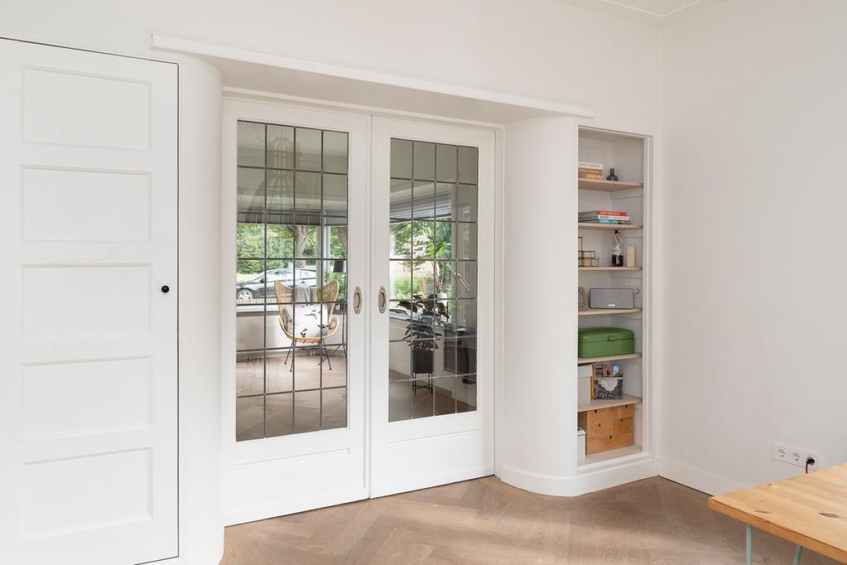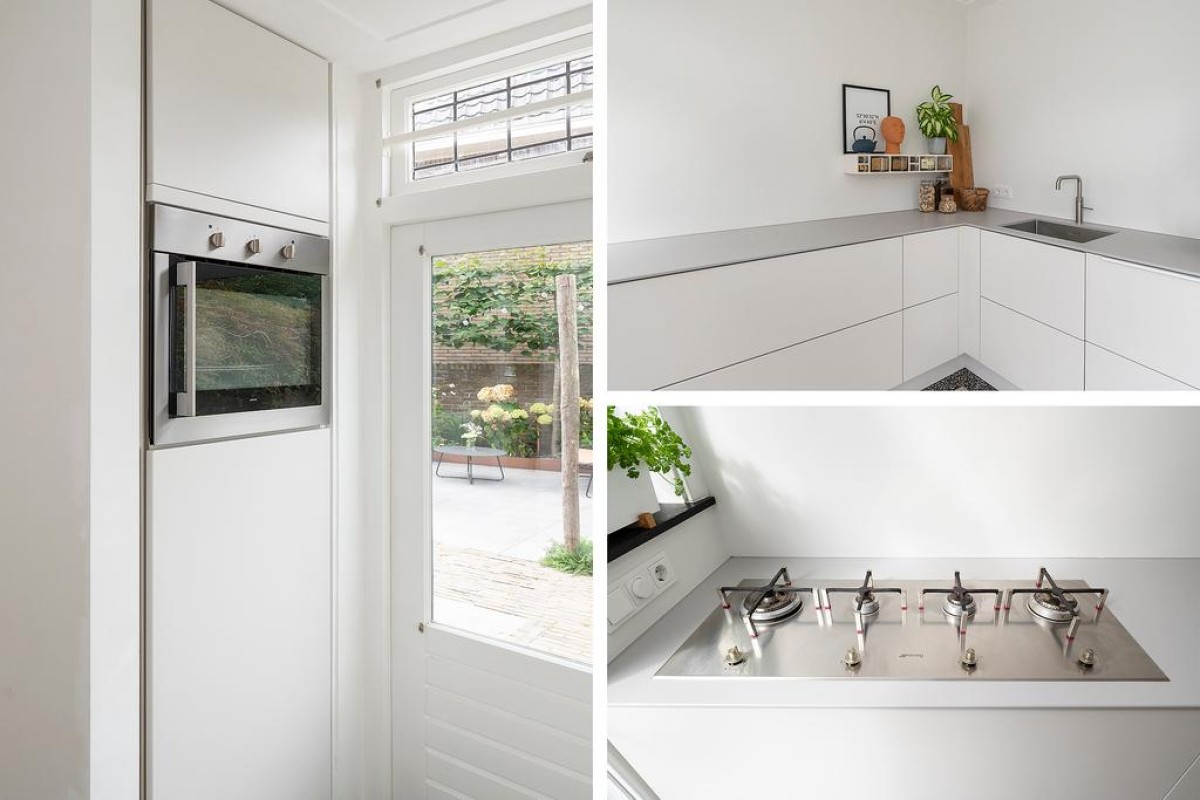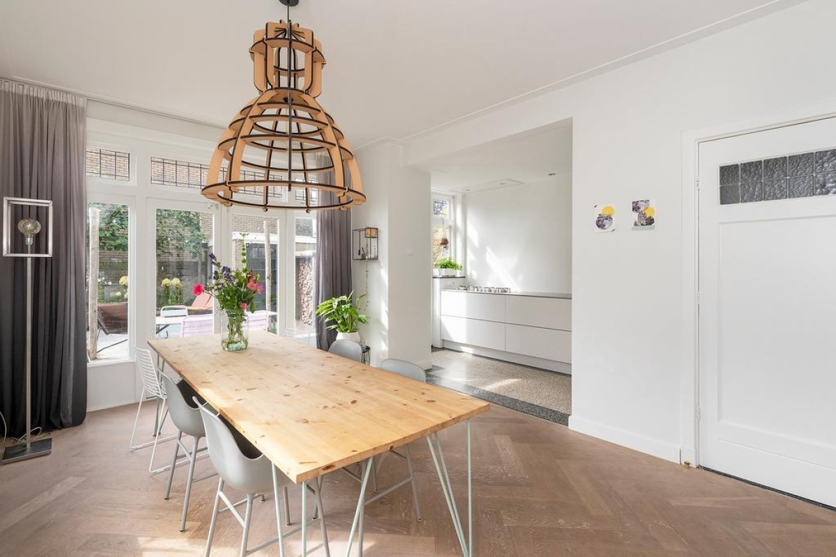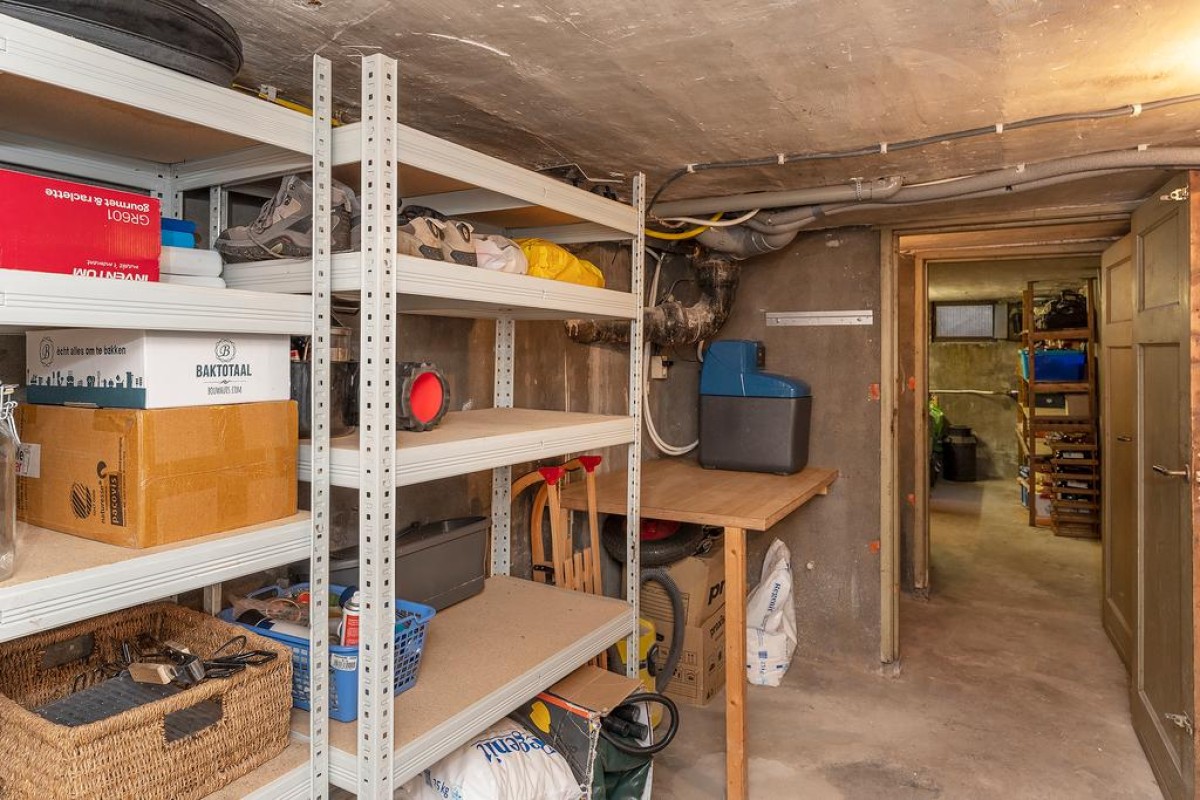 Begane grond: entree, vestibule met authentieke details, hal, trapopgang naar eerste verdieping, toegang tot de bijzonder royale kelder van circa 20 m2 waar de huidige eigenaar zijn klusruimte van heeft weten te maken. Vanuit de hal toegang tot het toilet en vervolgens de sfeervolle woonkamer en-suite met erker aan de voorzijde, voorzien van een Jotul houtkachel, vaste kasten en een massieve eikenhouten visgraat vloer. Aan de achterzijde bevindt zich de royale eetkamer met veel lichtinval. De openslaande deuren geven toegang tot de achtergelegen tuin. Moderne strakke open keuken met veel bergruimte in de korfladen en voorzien van een design kookplaat, afzuiginstallatie, gootsteen, Quooker en uiteraard mag een vaatwasser niet ontbreken. Aan de andere kant bevindt zich nog de ingebouwde koelkast en een oven.