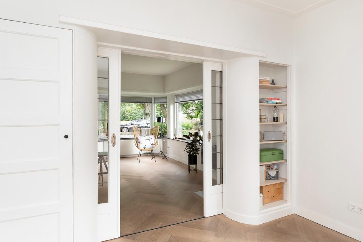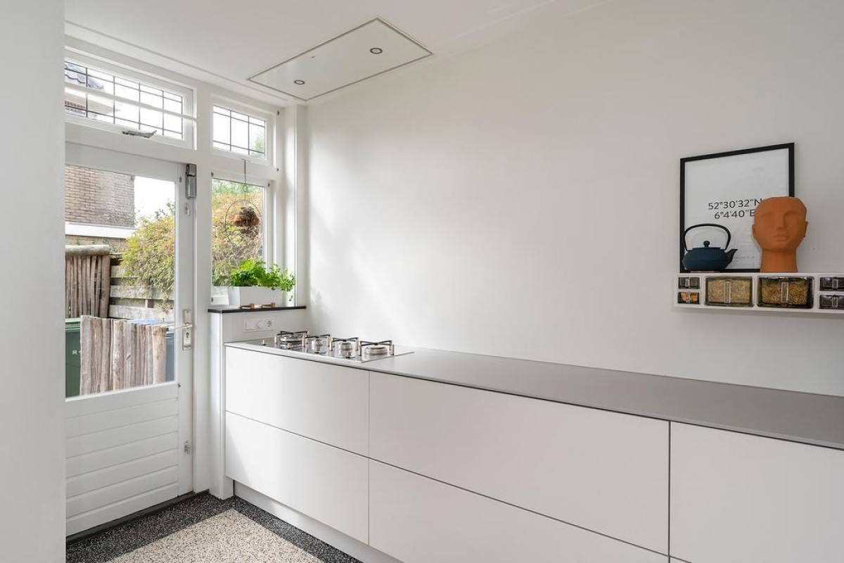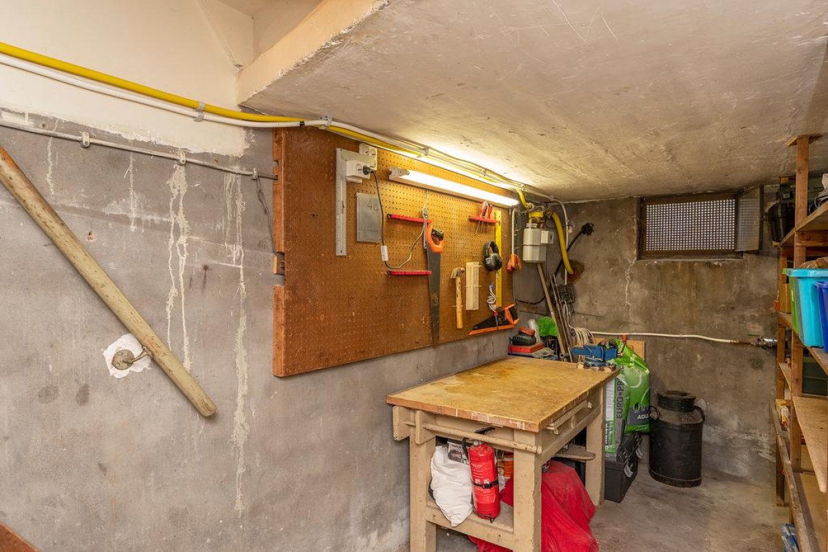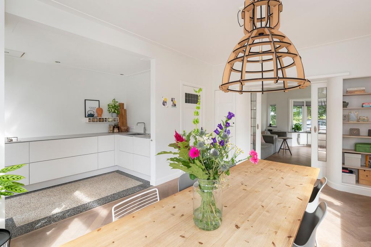 Begane grond: entree, vestibule met authentieke details, hal, trapopgang naar eerste verdieping, toegang tot de bijzonder royale kelder van circa 20 m2 waar de huidige eigenaar zijn klusruimte van heeft weten te maken. Vanuit de hal toegang tot het toilet en vervolgens de sfeervolle woonkamer en-suite met erker aan de voorzijde, voorzien van een Jotul houtkachel, vaste kasten en een massieve eikenhouten visgraat vloer. Aan de achterzijde bevindt zich de royale eetkamer met veel lichtinval. De openslaande deuren geven toegang tot de achtergelegen tuin. Moderne strakke open keuken met veel bergruimte in de korfladen en voorzien van een design kookplaat, afzuiginstallatie, gootsteen, Quooker en uiteraard mag een vaatwasser niet ontbreken. Aan de andere kant bevindt zich nog de ingebouwde koelkast en een oven.
