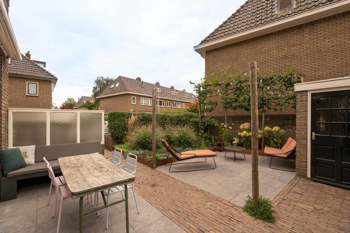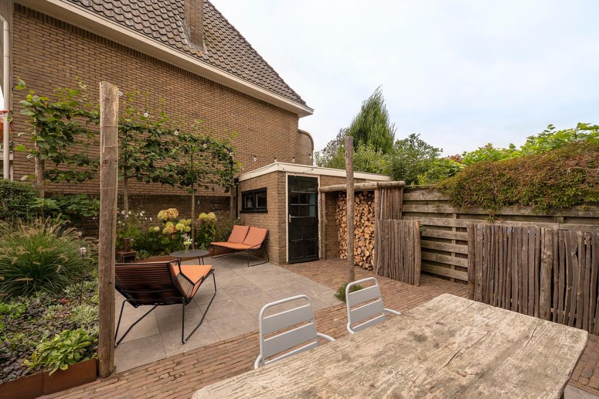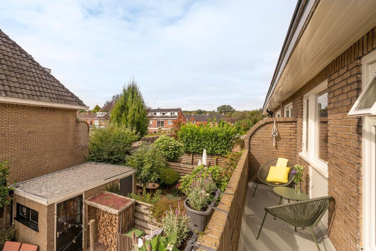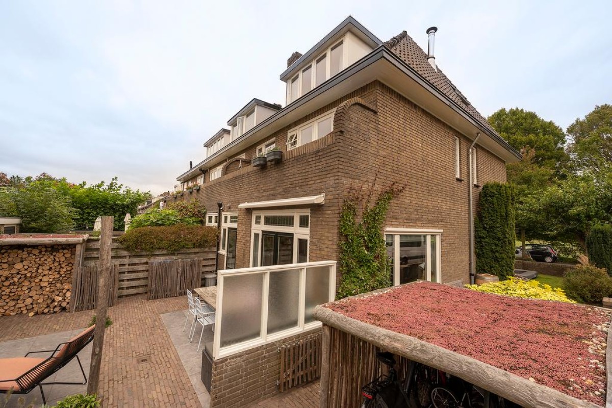 In de recent aangelegde tuin staat een vrijstaande stenen berging, een houtopslag, ruimte voor containers en een praktische fietsenberging met een sedumdak en een stopcontact voor het eventueel opladen van uw elektrische auto. Aan de overkant van de straat is geen bebouwing waardoor je vanuit de erker een vrij uitzicht hebt.