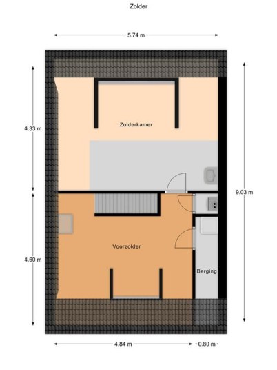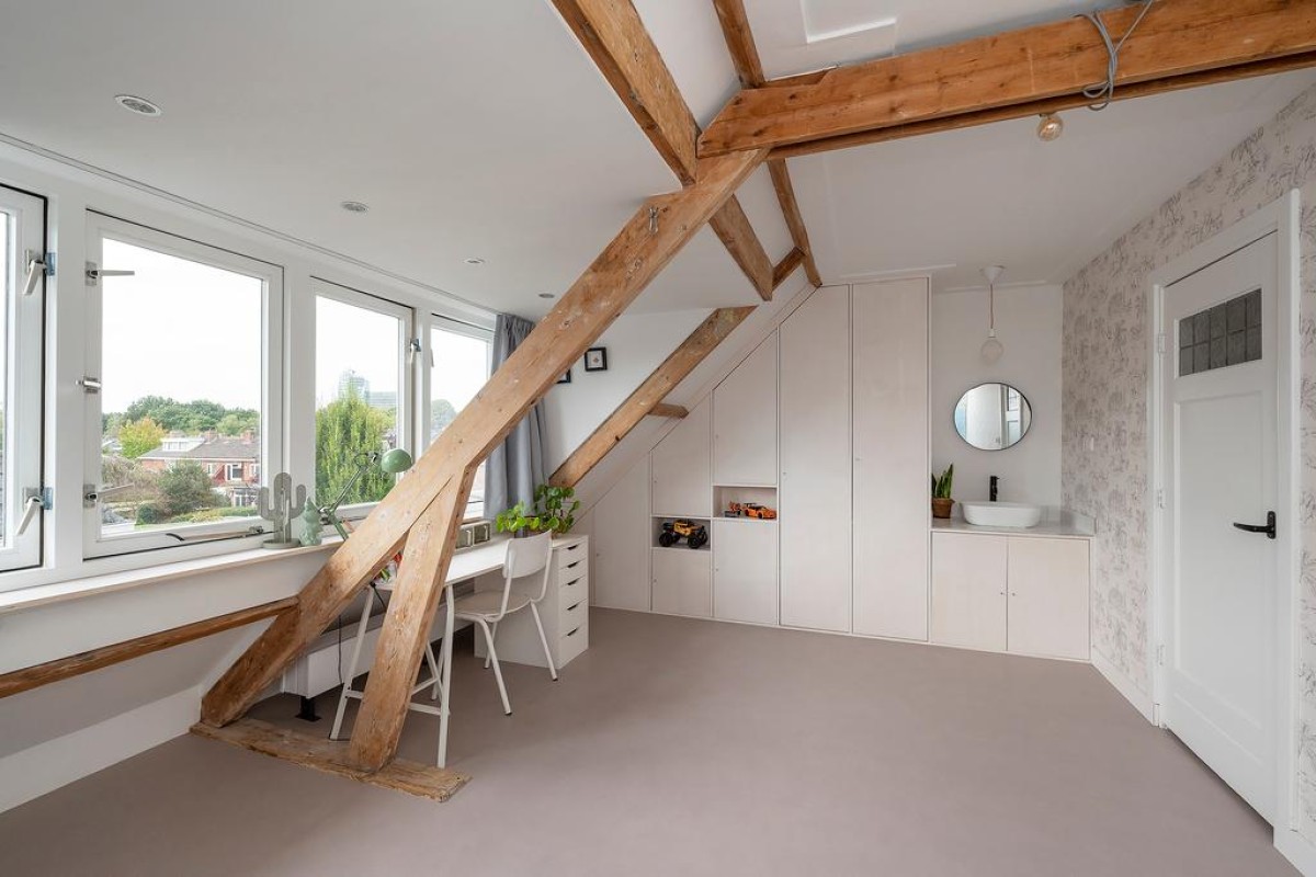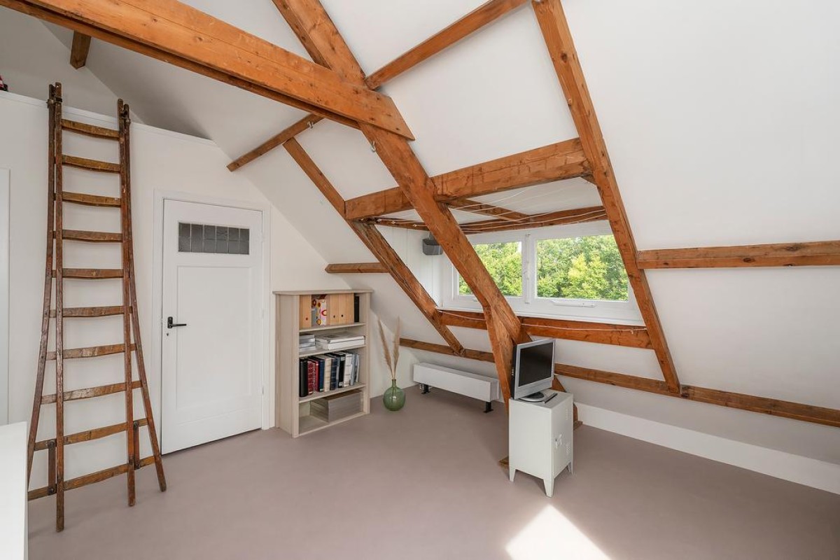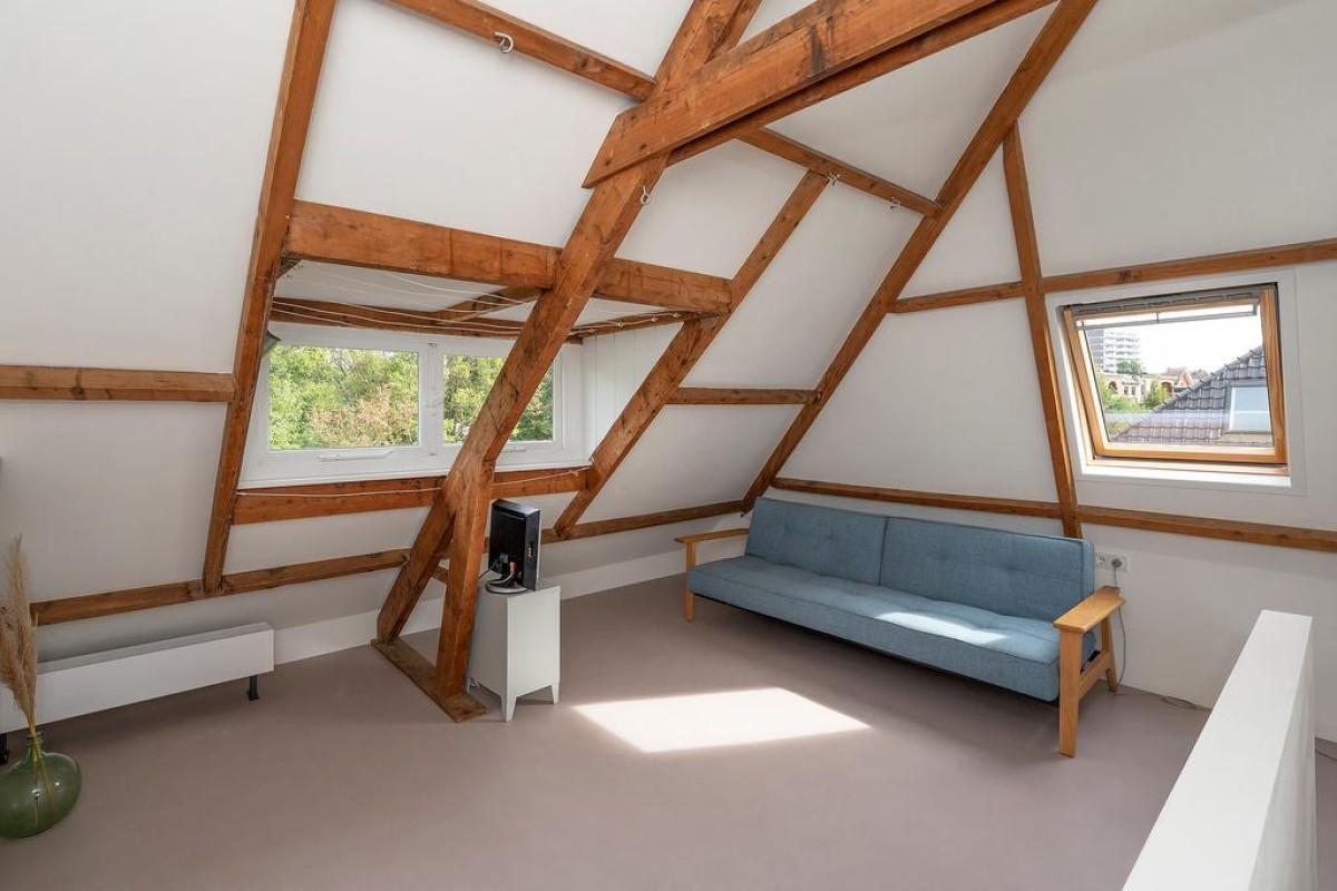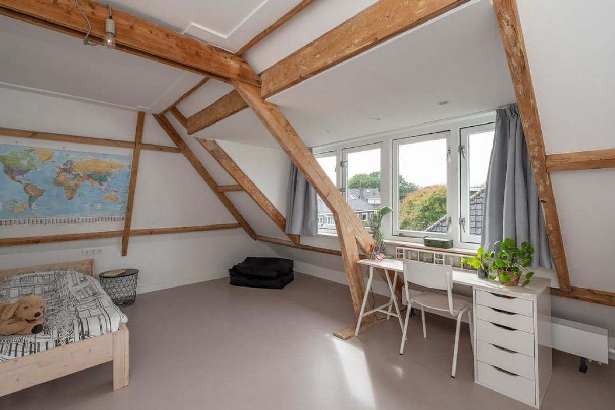Tweede verdieping: bijzonder ruime voorzolder met vaste kasten met c.v.-opstelling en opstelling voor het witgoed en bergruimte. Aan de achterzijde is een mooie royale 4e slaapkamer gecreëerd met wastafelmeubel en dakkapel.