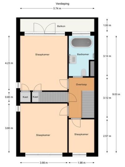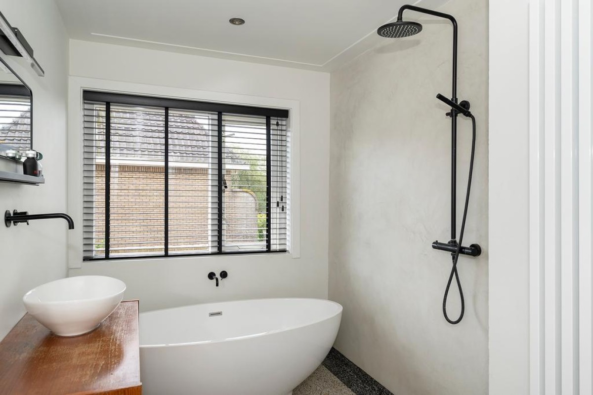 Eerste verdieping: overloop, 2 slaapkamers zijn aan de voorzijde gesitueerd en een royale 3e slaapkamer met vaste kasten en groot balkon aan de achterzijde. Ook de geheel gerenoveerde badkamer bevindt zich aan de achterzijde. Deze sfeervolle badkamer met granitovloer is voorzien van een 2e toilet, (regen)douche, wastafelmeubel en een zeer smaakvol vrijstaand ligbad.