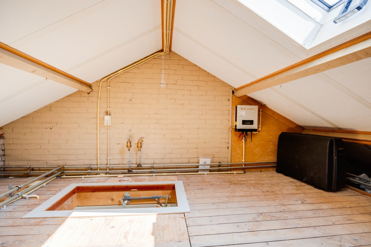 Tweede verdieping: middels een vlizotrap is de ruime bergzolder bereikbaar waar de omvormer voor de 11 zonnepanelen en de mechanische ventilatie zijn gesitueerd.
