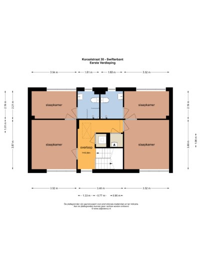 Eerste verdieping: vaste trap naar de overloop met een ruimte voor de wasmachine en en ruimte met c.v.-ketel. Aansluitend 4 kamers en 2 badkamers. De badkamers zijn voorzien van een douche, toilet en wastafel.