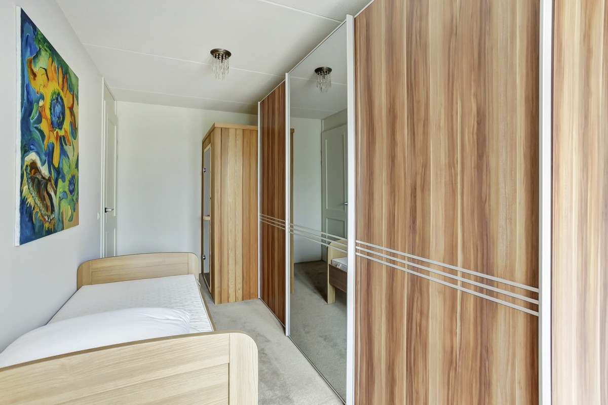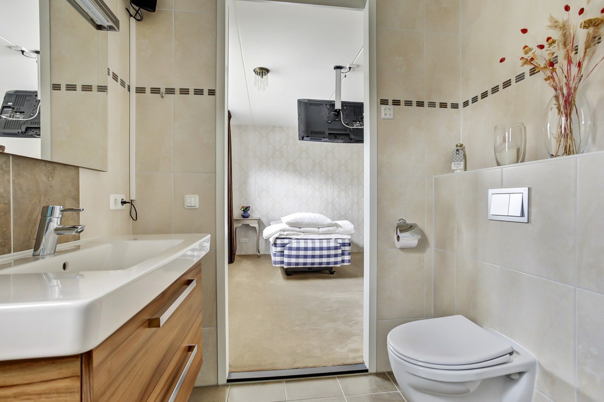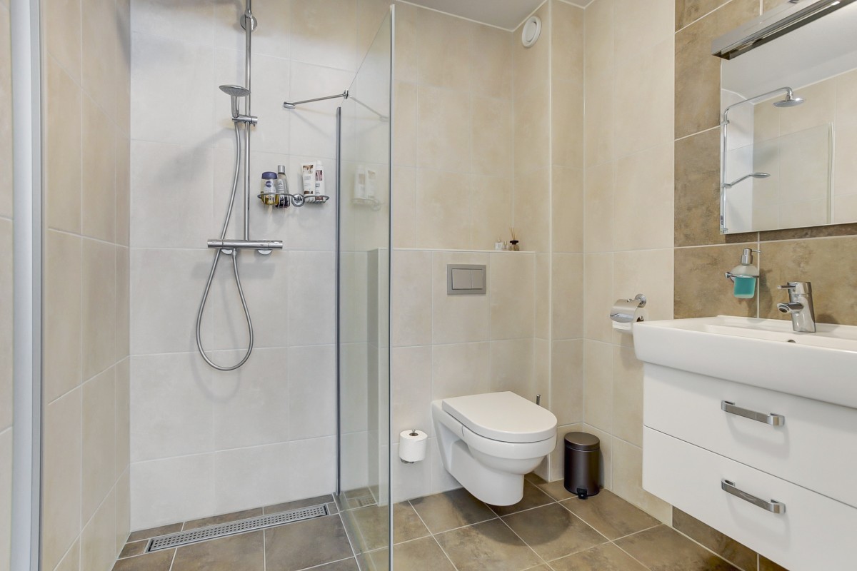 Vanuit de hal zijn tevens de twee slaapkamers op de begane grond te bereiken. Aan de voorzijde van de woning is een ruime slaapkamer met en-suite badkamer gesitueerd. De badkamer beschikt over een hangcloset, een douchecabine, designradiator en een wastafel met meubel. Aan de achterzijde is de 2e slaapkamer gelegen welke is voorzien van een sauna en een deur naar het terras. De begane grond is voorzien van laminaatvloeren waarbij de slaapvertrekken zijn voorzien van tapijt.