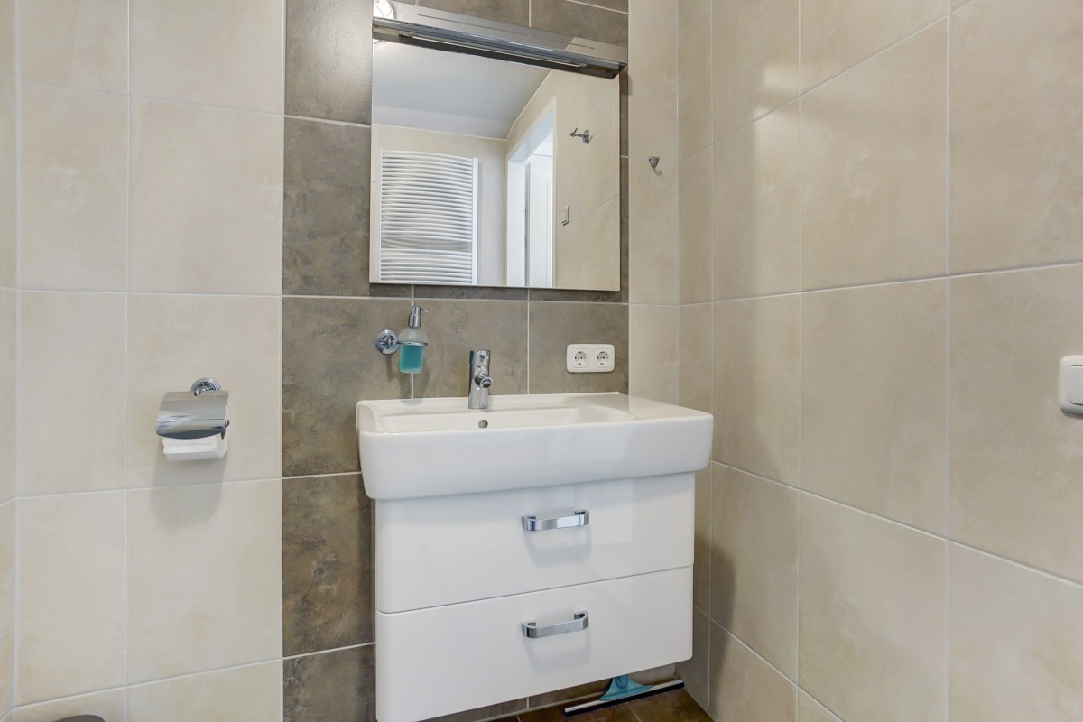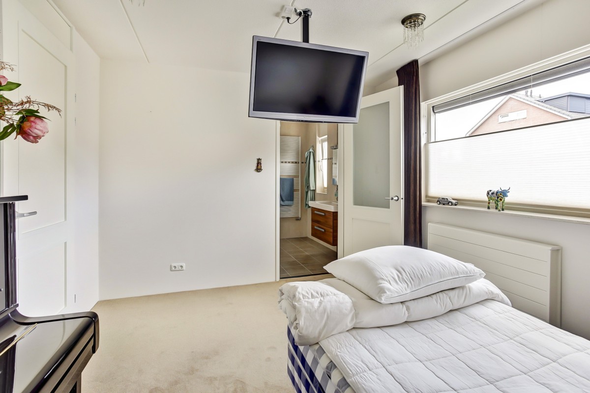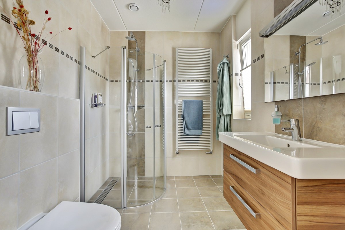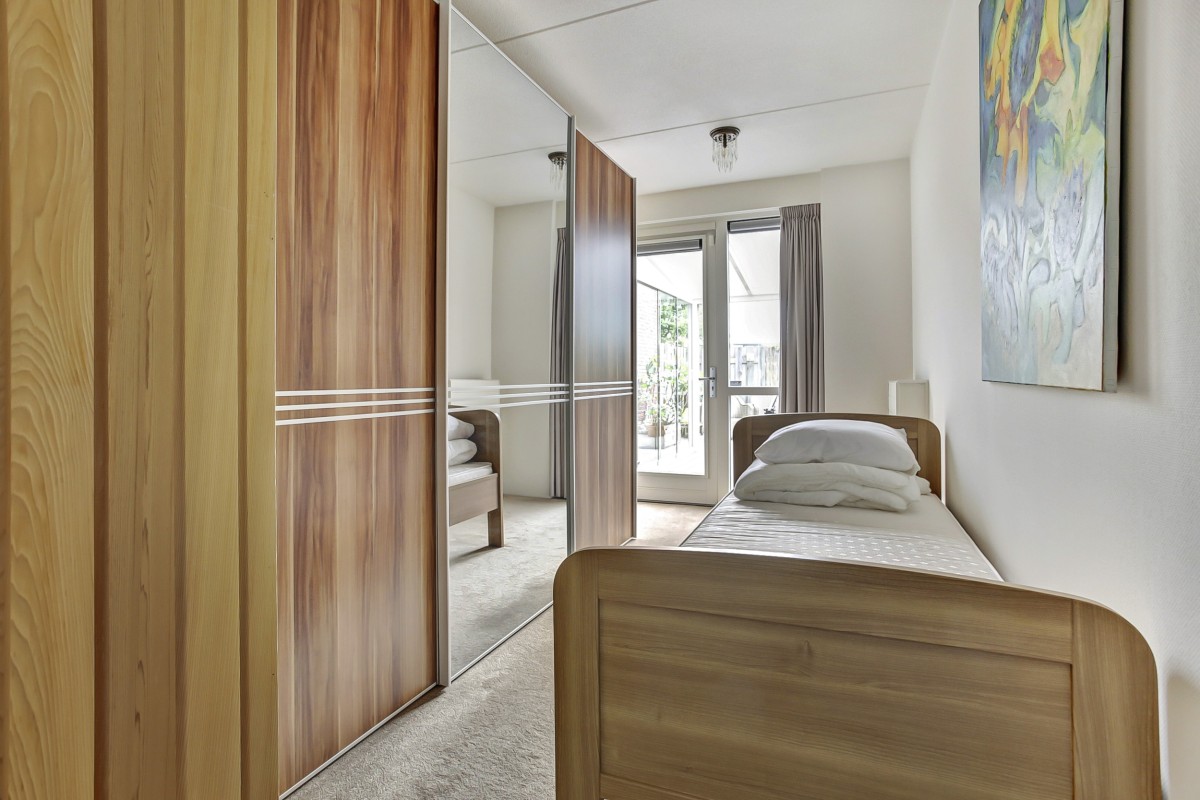 Vanuit de hal zijn tevens de twee slaapkamers op de begane grond te bereiken. Aan de voorzijde van de woning is een ruime slaapkamer met en-suite badkamer gesitueerd. De badkamer beschikt over een hangcloset, een douchecabine, designradiator en een wastafel met meubel. Aan de achterzijde is de 2e slaapkamer gelegen welke is voorzien van een sauna en een deur naar het terras. De begane grond is voorzien van laminaatvloeren waarbij de slaapvertrekken zijn voorzien van tapijt.