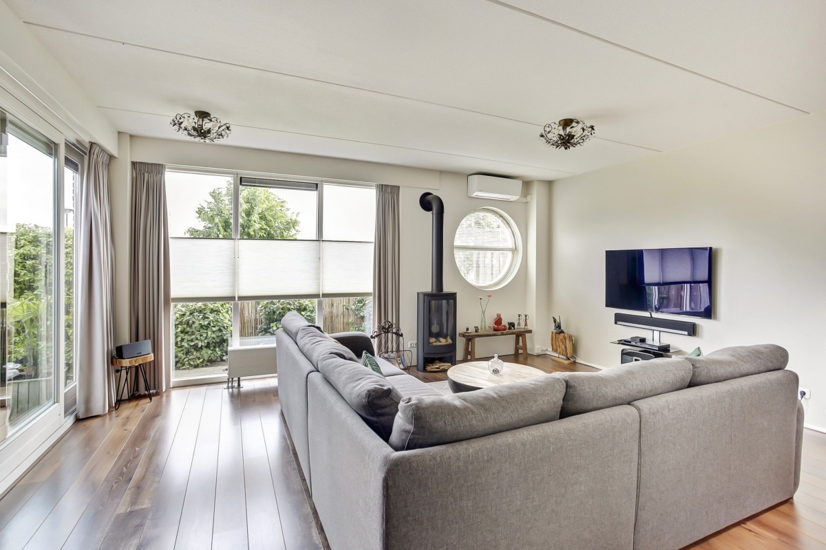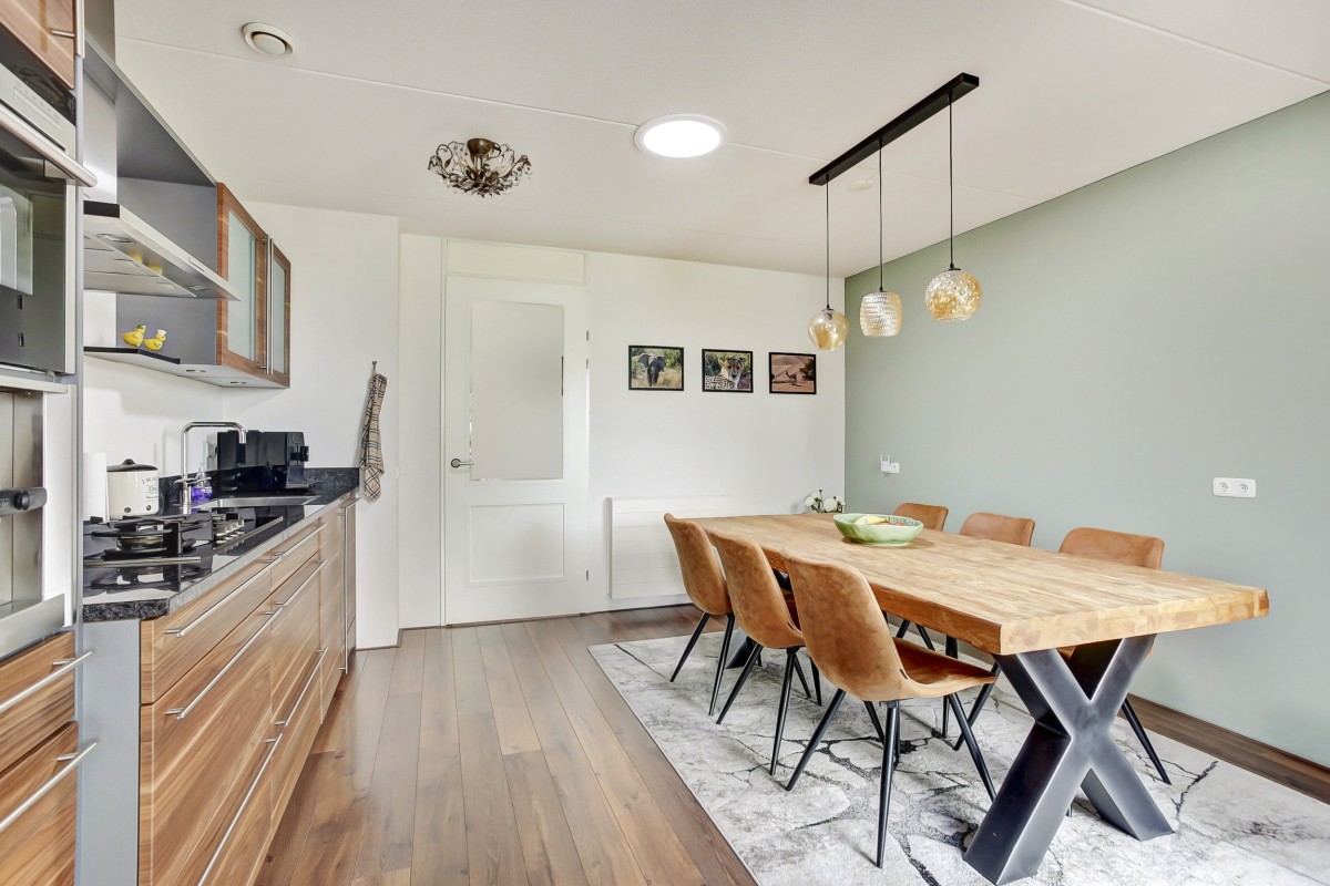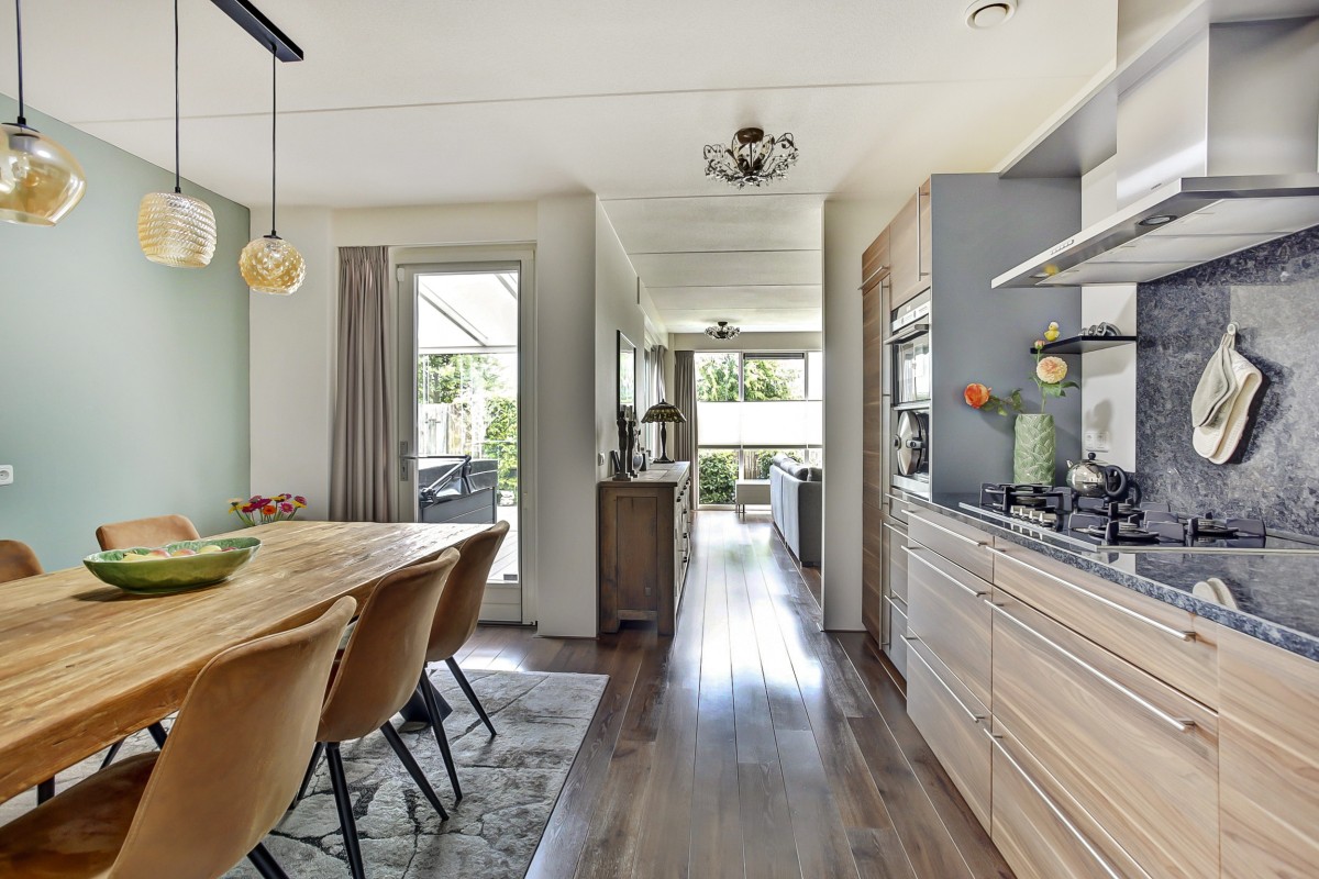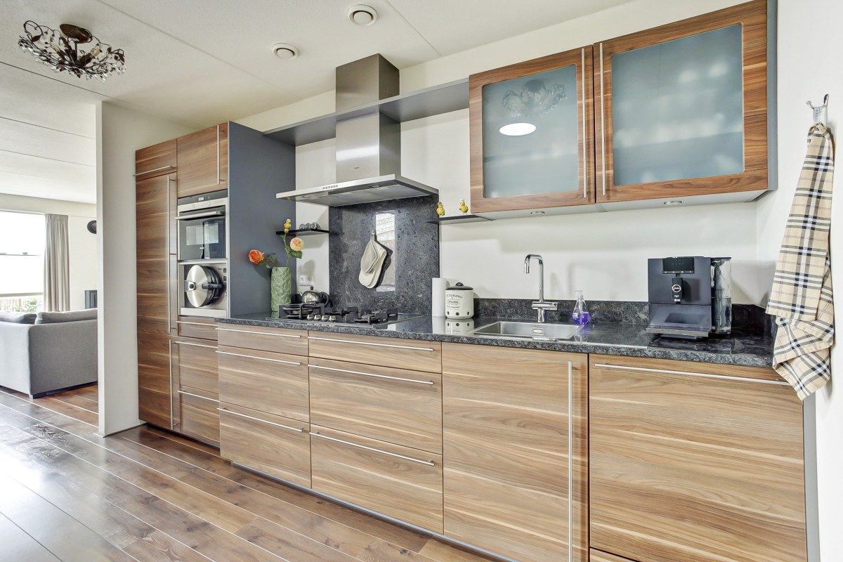 Vanuit de hal kom je in de luxe moderne open keuken met aangrenzend de eethoek en doorgang naar de woonkamer. De keuken is voorzien van veel kastruimte en beschikt over een ingebouwde koel/vriescombinatie, hoge druk stoom oven, vaatwasser, combimagnetron, 5 pits gas-op-glas kookplaat en een rvs afzuigkap en een loopdeur naar de tuin. De tuingerichte woonkamer is ruim van opzet en heerlijk licht door de grote raampartijen en geeft een prachtig blijvend vrij uitzicht over groen en water. De woonkamer is voorzien van een airconditioning, een vaste trap naar de etage en een schuifpui naar het terras en de tuin.