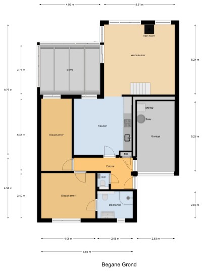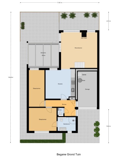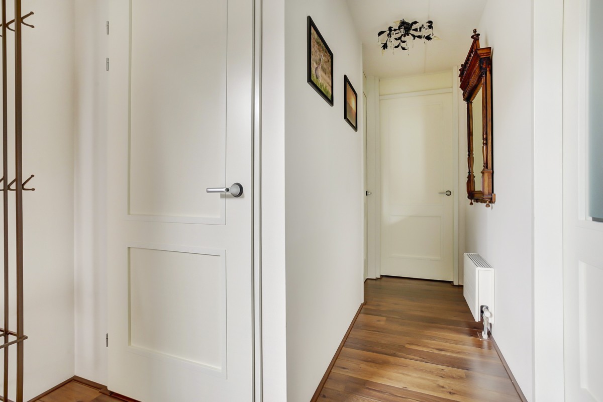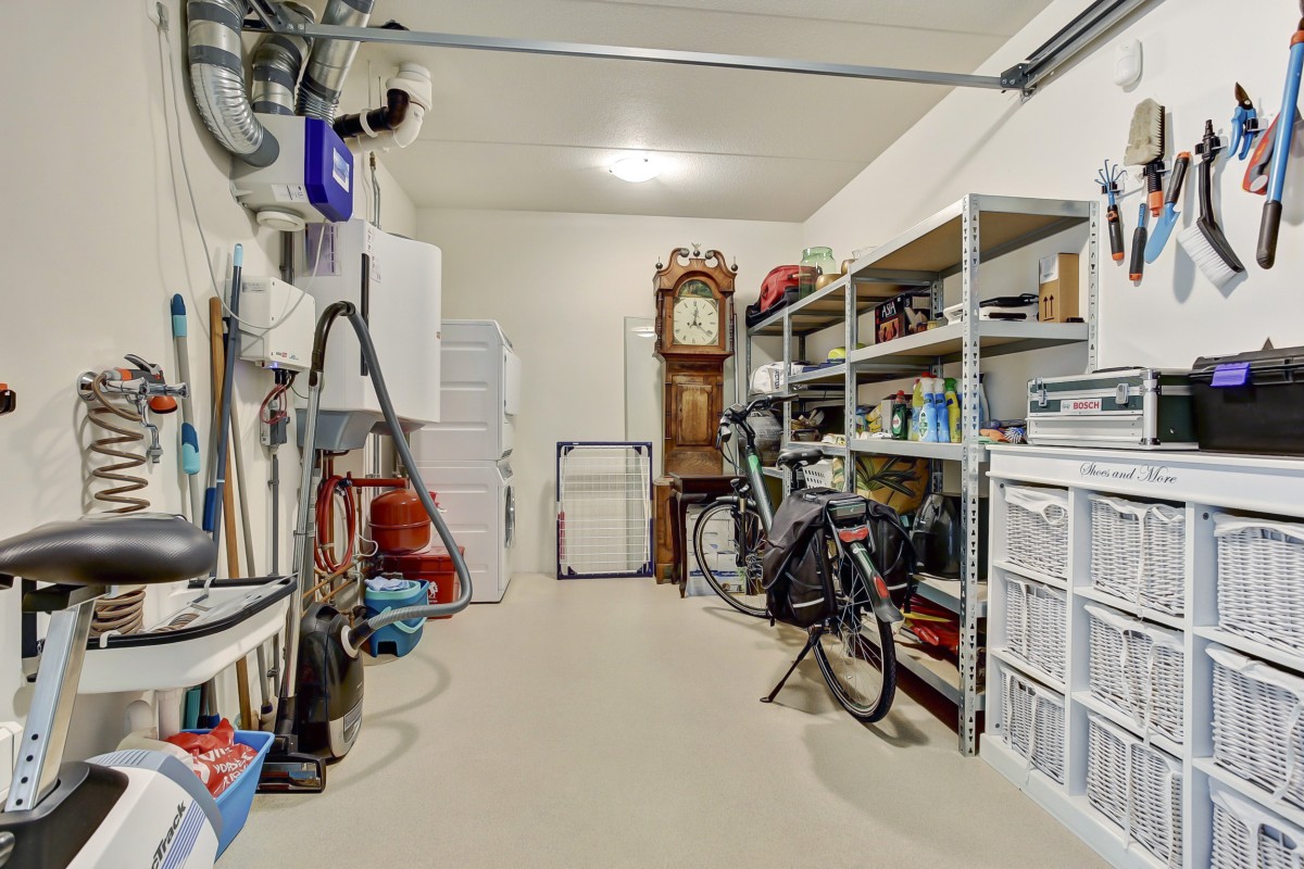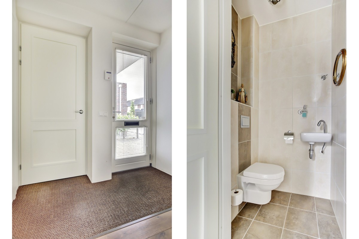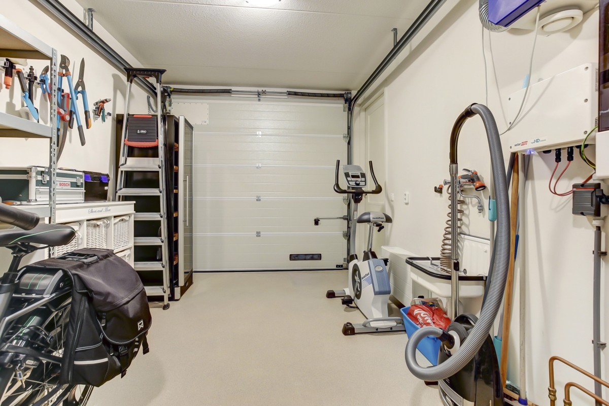 Begane grond: overdekt entree, hal met garderobe, toiletruimte met hangcloset en fonteintje, meterkast, binnendoor naar de aangebouwde en geïsoleerde garage welke beschikt over een betonvloer, uitstortgootsteen met warm en koud water, wasmachineaansluiting, opstelplaats van de c.v.-ketel, mechanische ventilatie unit, omvormer van de zonnepanelen en een elektrische sectionaaldeur naar de oprit.