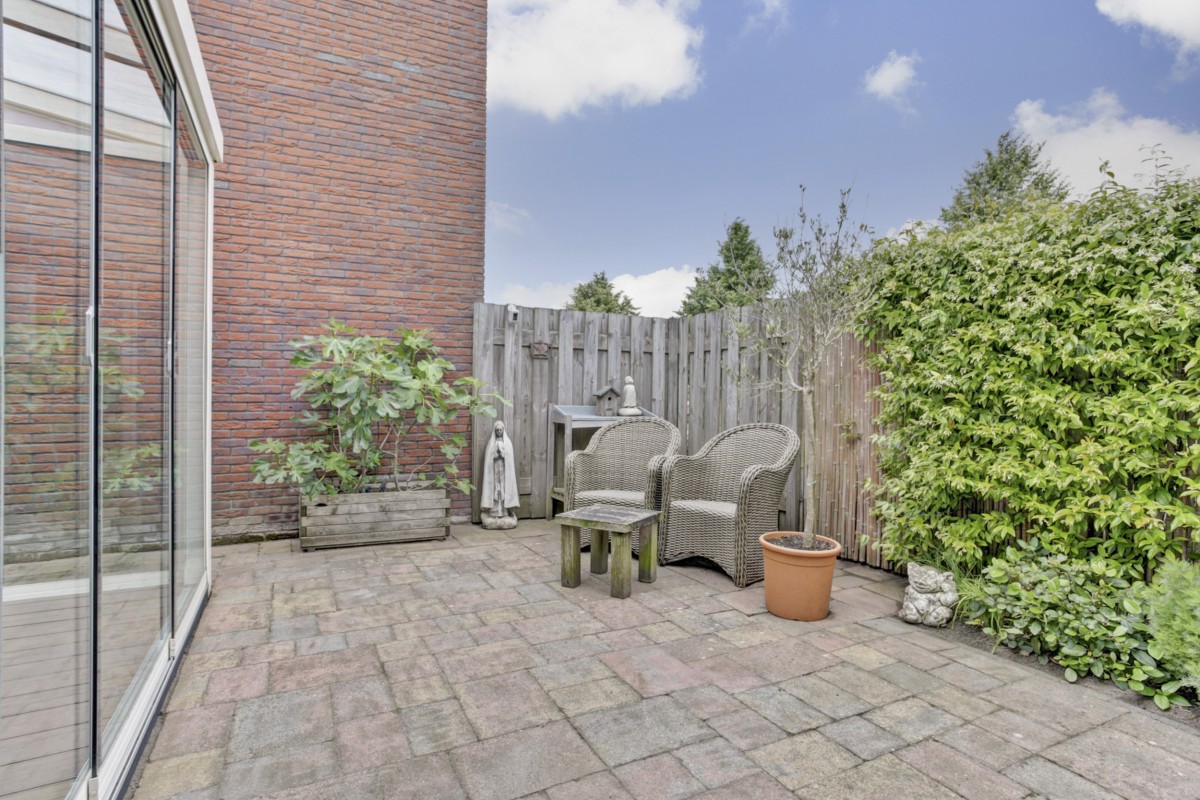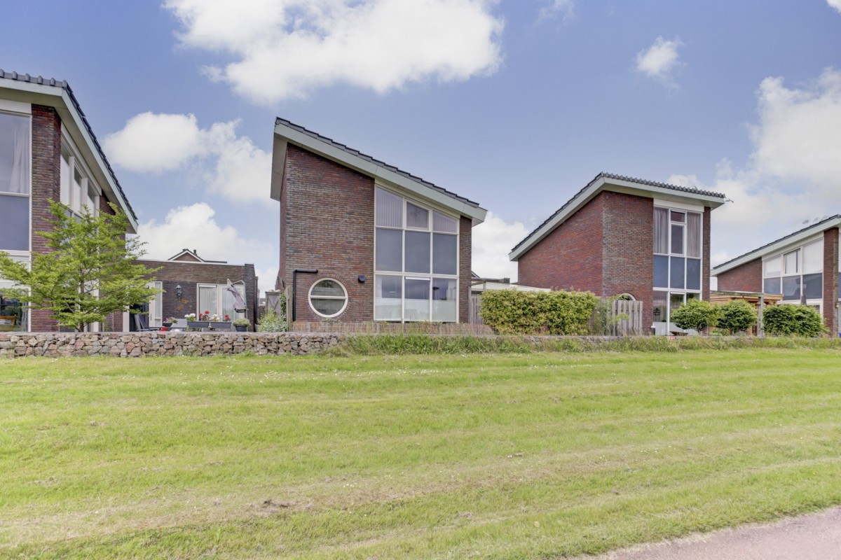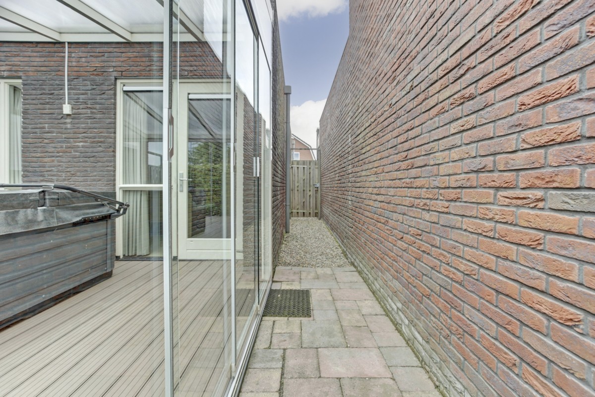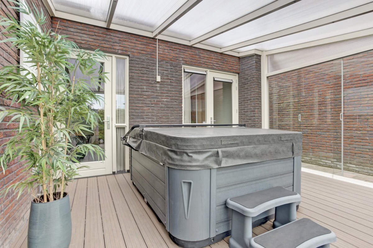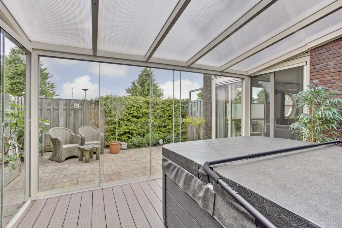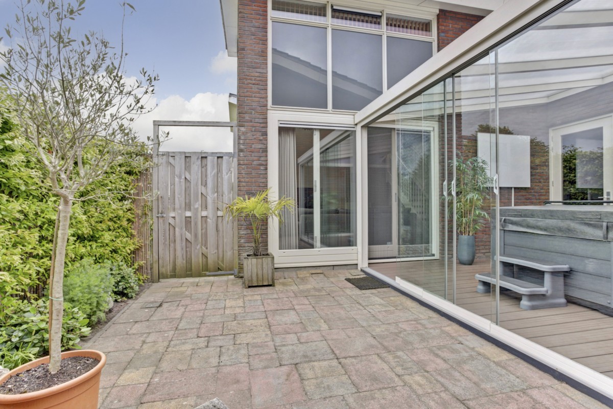 De tuin is vanuit de kleine slaapkamer en de eethoek met een loopdeur te betreden en vanuit de woonkamer middels een schuifpui met hor te betreden en is onderhoudsarme en verzorgd aangelegd. Tegen de achtergevel is een ruime aluminium overkapping gerealiseerd met vlonderterras, jacuzzi (ter overname) infra rood verwarming en is afsluitbaar middels glazen schuifdeuren. De tuin is verder voorzien van een achterom en geeft mooi vrij uitzicht over water.