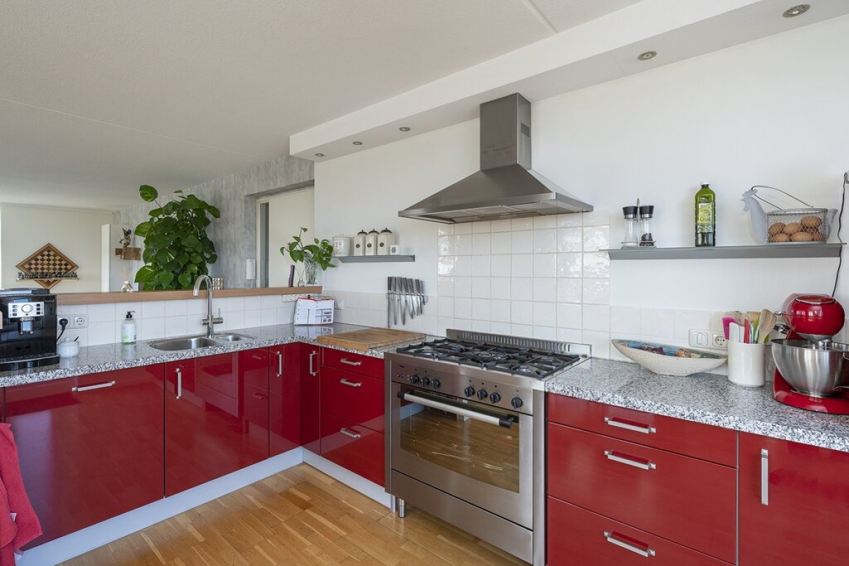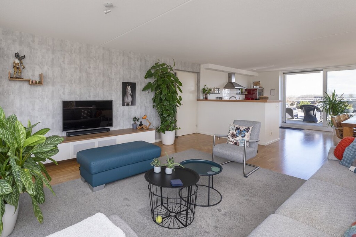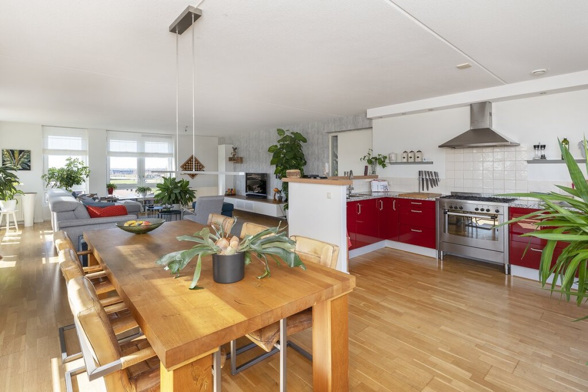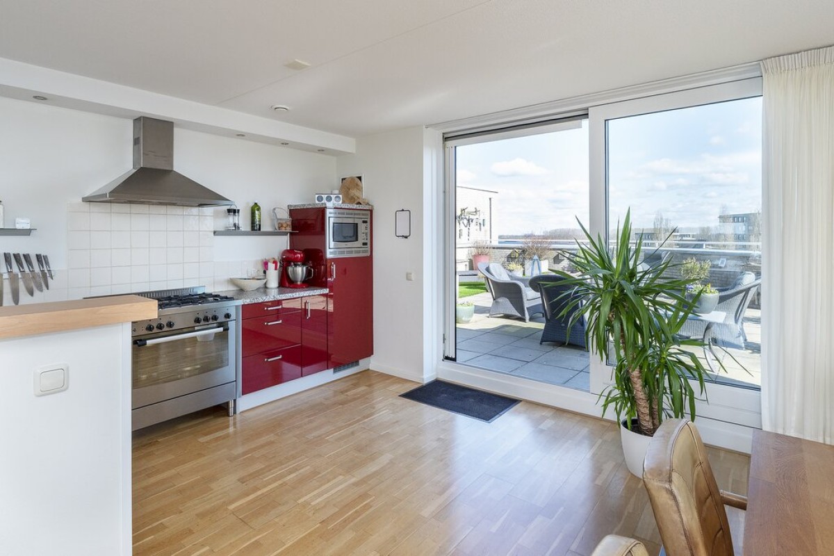 Vervolgens komt u in de riante living met veel lichtinval door de vele raampartijen en daardoor ook een vrij uitzicht. Aan de achterzijde bevindt zich de half open keuken in hoekopstelling voorzien van een 90 cm gasfornuis met oven, RVS afzuigschouw, koelkast, combimagnetron en uiteraard mag een vaatwasser niet ontbreken. Via de schuifpui bereikt u het zeer riante dakterras. Hier kunt u het vrije uitzicht en de vrijheid ervaren!