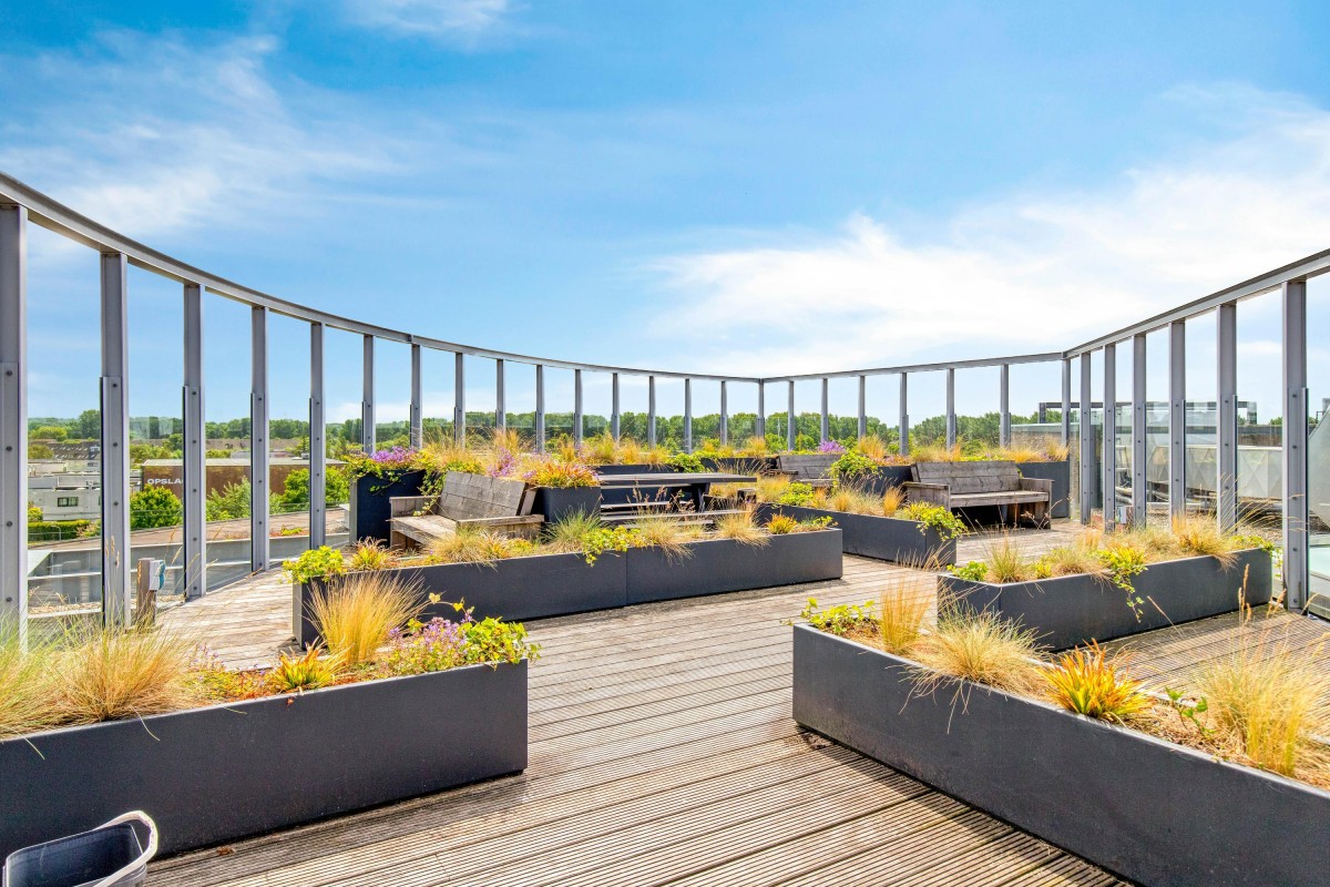 Op het dak van het appartementencomplex bevindt zich nog een gezellig en ruim dakterras. Hierin zijn genoeg mogelijkheden om heerlijk privé te relaxen, maar ook om gezellig met de nieuwe buren of met vrienden een borrel te doen.
