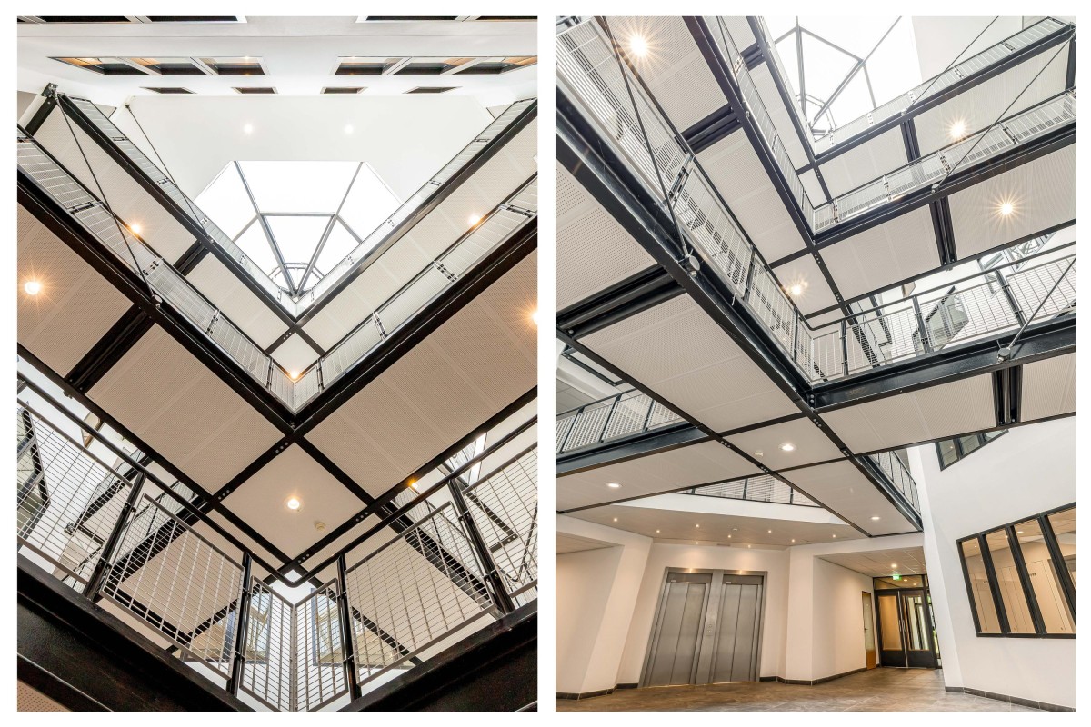 Centrale entree met bellentableau, brievenbussen en een imposante lichte hal met toegang tot de berging, gemeenschappelijk fietsenstalling en twee liften naar de bovenste woonlaag.