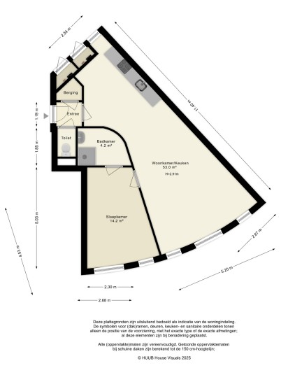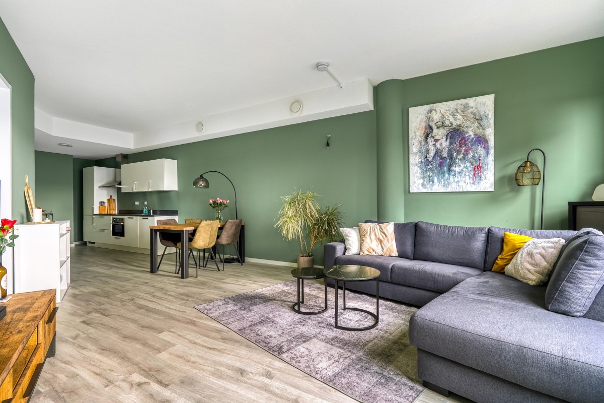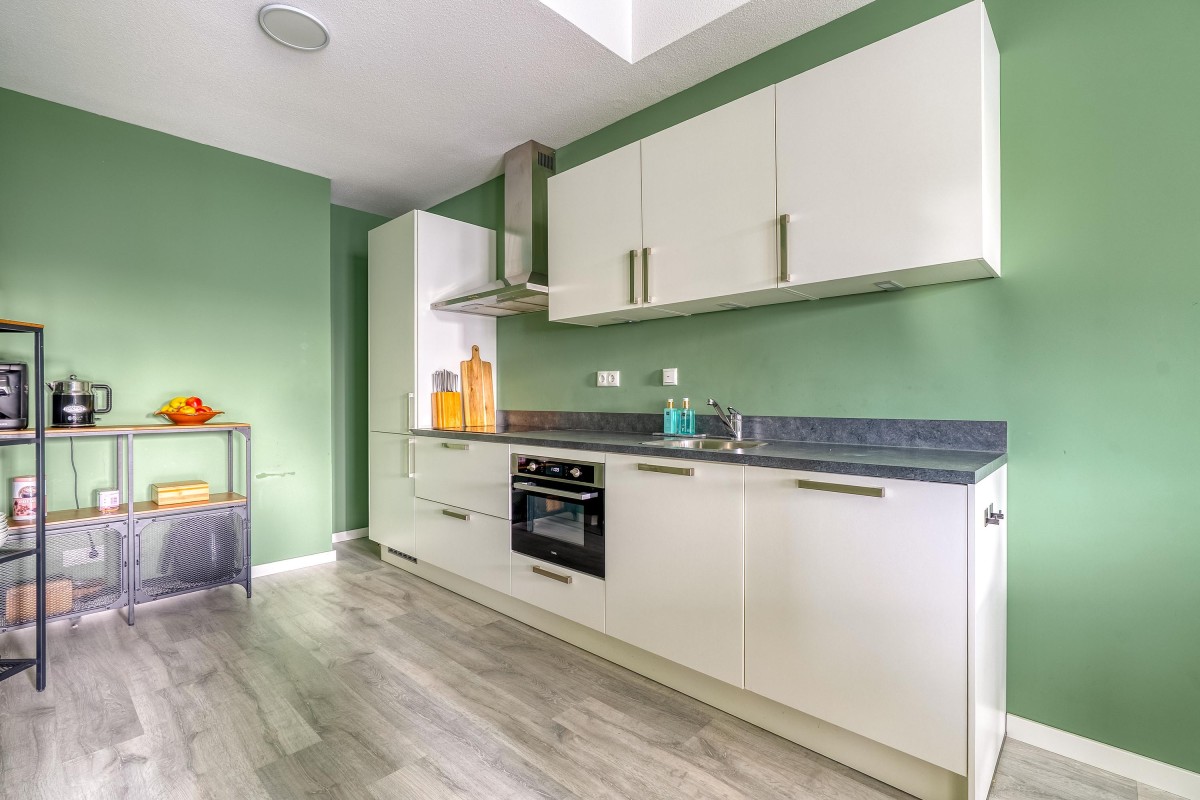 Entree met toegang tot de wasruimte, toilet en de ruime en lichte woonkamer. De woonkamer is voorzien van grote raampartijen welke zorgen voor een prettige en lichte sfeer in dit appartement. De open keuken is uitgerust met lichte fronten en diverse inbouwapparaten, te weten: vaatwasser, kookplaat, afzuigkap, combimagnetron en koel-vriescombinatie. De ruime slaapkamer heeft voldoende ruimte voor een grote kledingkast. Vanuit de slaapkamer is tevens de badkamer bereikbaar. De badkamer is voorzien van lichte betegeling tot aan het plafond, douche en wastafel. Het gehele appartement is voorzien van een nette laminaatvloer.
