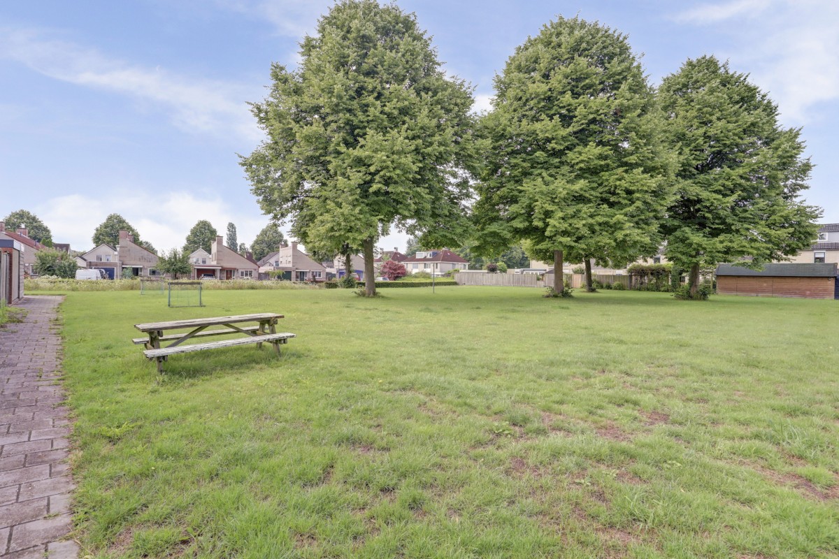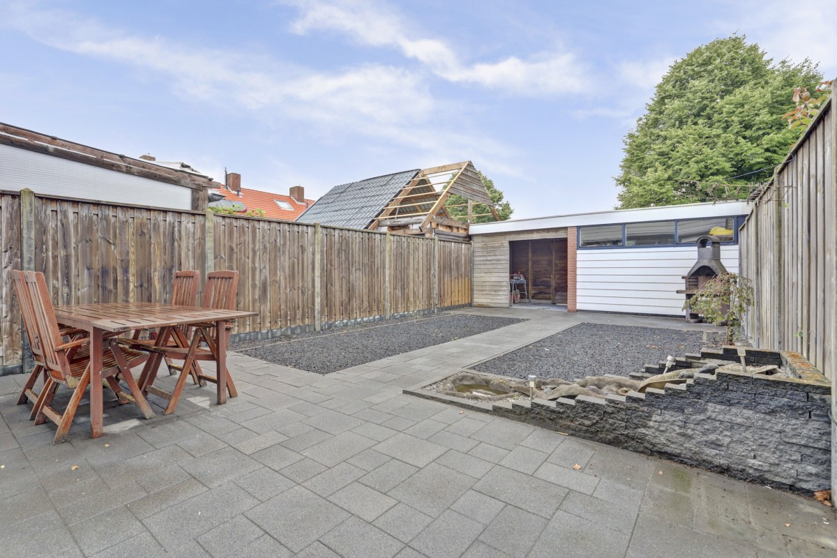 De achtertuin is fraai aangelegd met sierbestrating, beplanting en grind, en biedt veel privacy dankzij de vrije ligging aan openbaar groen. Achterin de tuin bevindt zich een stenen berging met aangebouwde overkapping en brede schuifdeur naar het achterpad – ideaal voor het stallen van fietsen én een motor, of als extra beschutte zitruimte. Aan de achtergevel is een elektrisch zonnescherm geplaatst voor extra comfort op zonnige dagen.