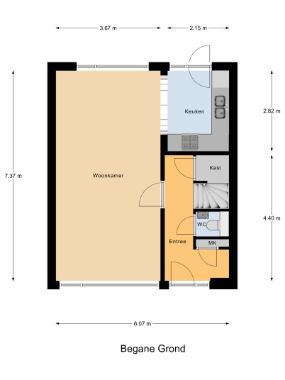 Entreehal met meterkast, trapopgang en moderne toiletruimte voorzien van hangend closet. Via een stijlvolle glazen deur is de lichte doorzonwoonkamer bereikbaar. Aan de achterzijde bevindt zich de halfopen keuken in hoekopstelling, uitgerust met diverse inbouwapparatuur: koel-vriescombinatie, combimagnetron, vaatwasser, gaskookplaat en rvs afzuigschouw. Vanuit de keuken is er directe toegang tot de achtertuin. De gehele begane grond is afgewerkt met een laminaatvloer.