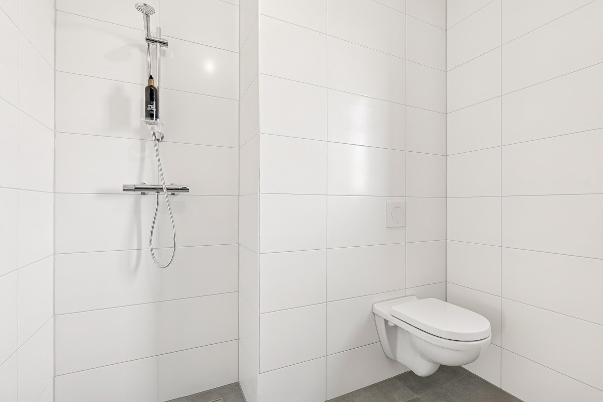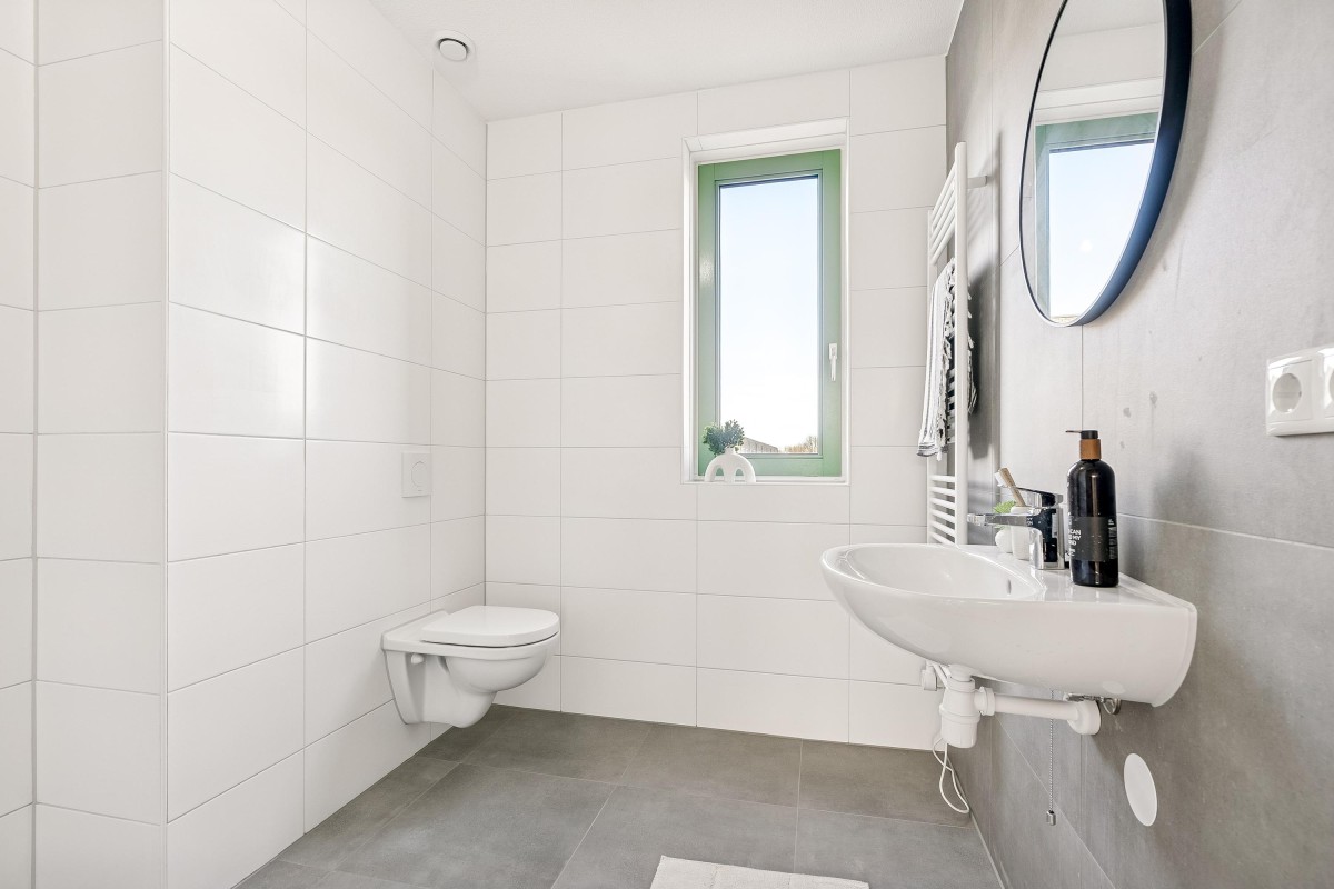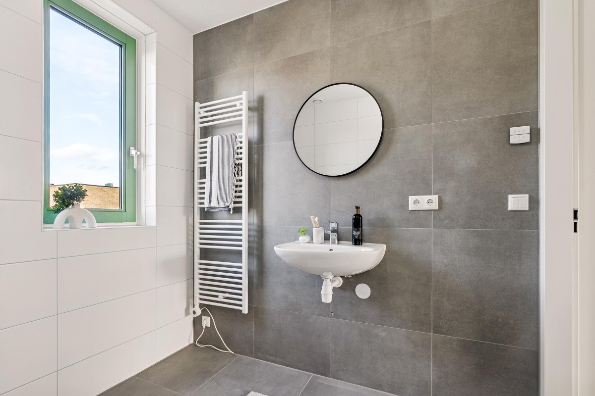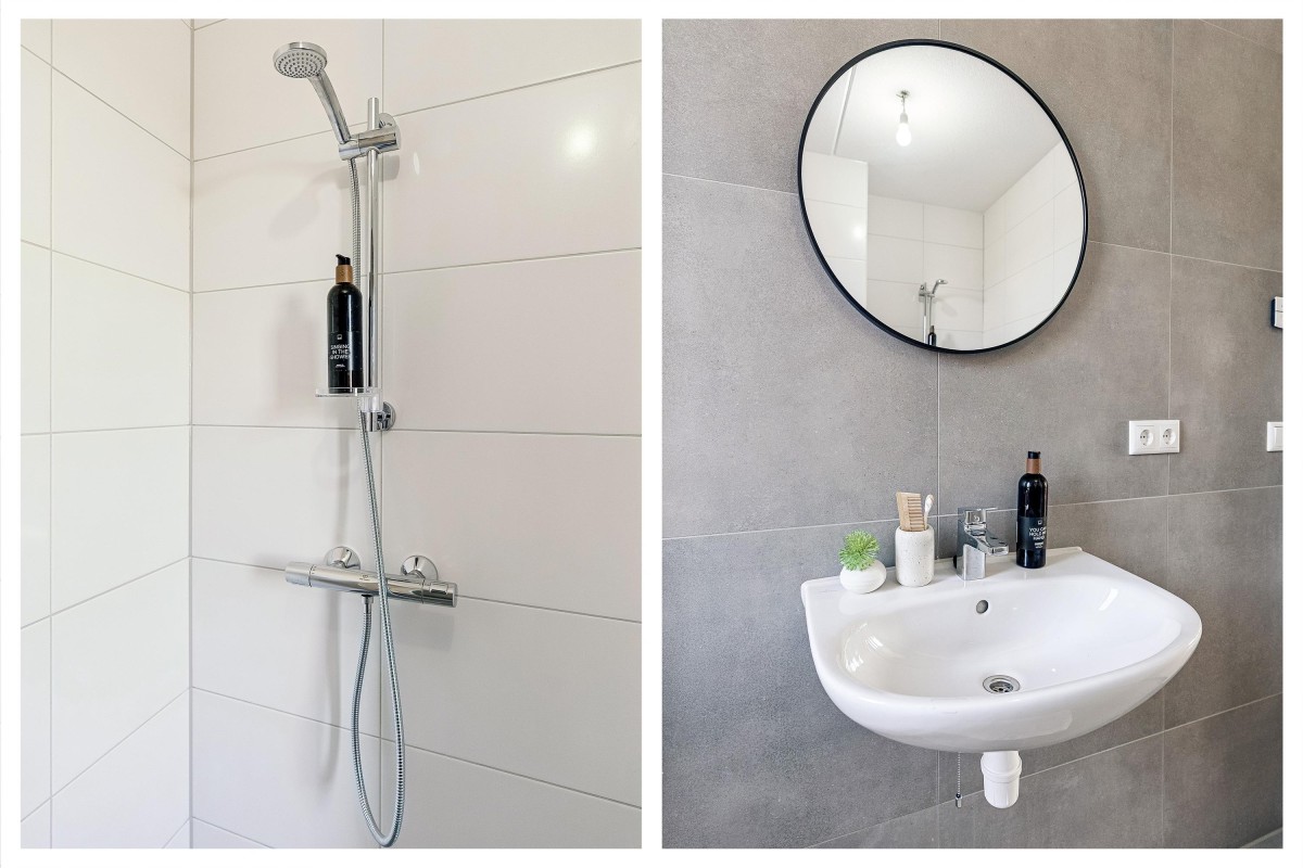 De badkamer is volledig betegeld en voorzien van een douchehoek, wastafel, toilet, vloerverwarming en elektrische handdoekradiator. Een raam zorgt voor extra frisse lucht.