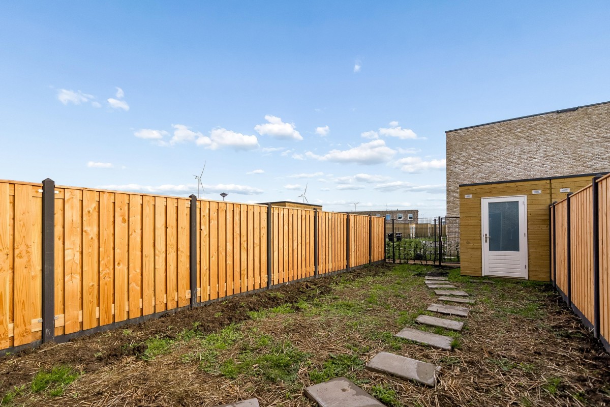 Achterin de tuin staat een houten berging voor het opbergen van fietsen en tuinmeubelen. De stevige houtbeton schuttingen zijn al geplaatst, verder kan je de tuin helemaal naar eigen wens aanleggen.