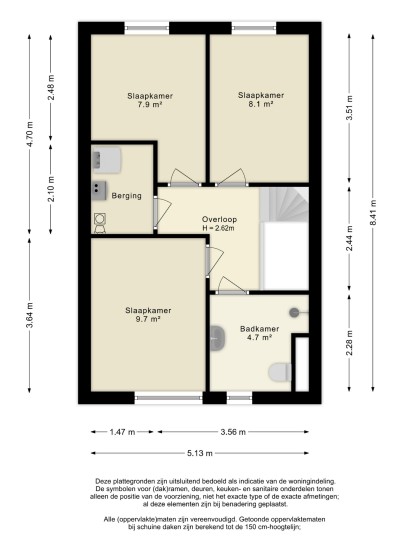 Overloop met toegang tot 3 slaapkamers, de badkamer, en een bergkast met aansluiting voor wasmachine en droger, en ruimte voor de warmtepomp unit en de omvormer.