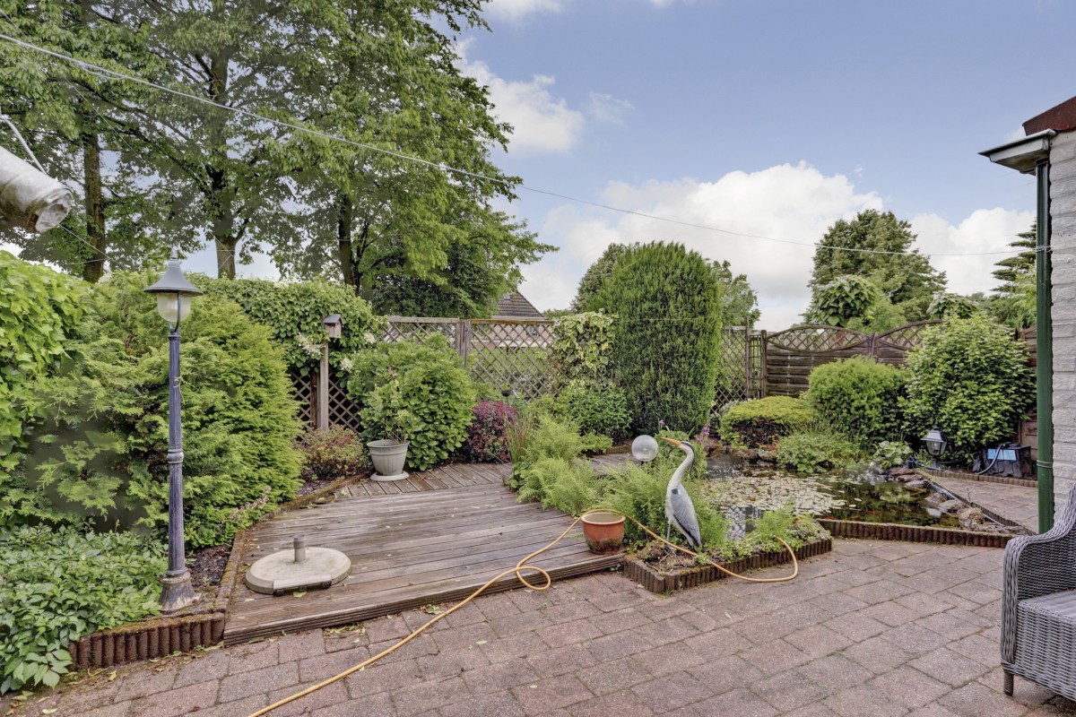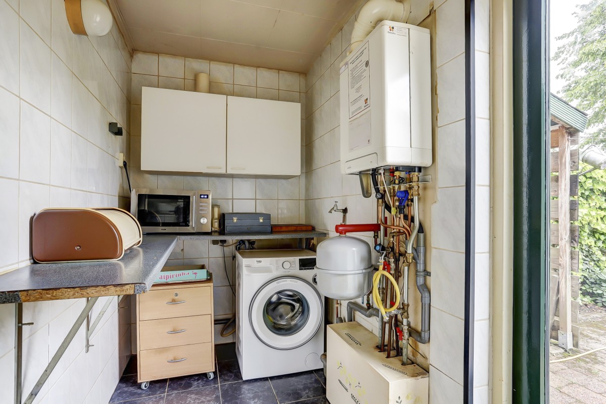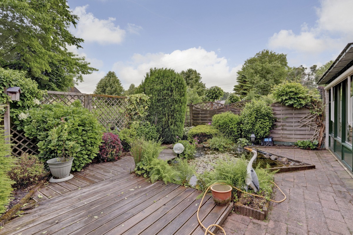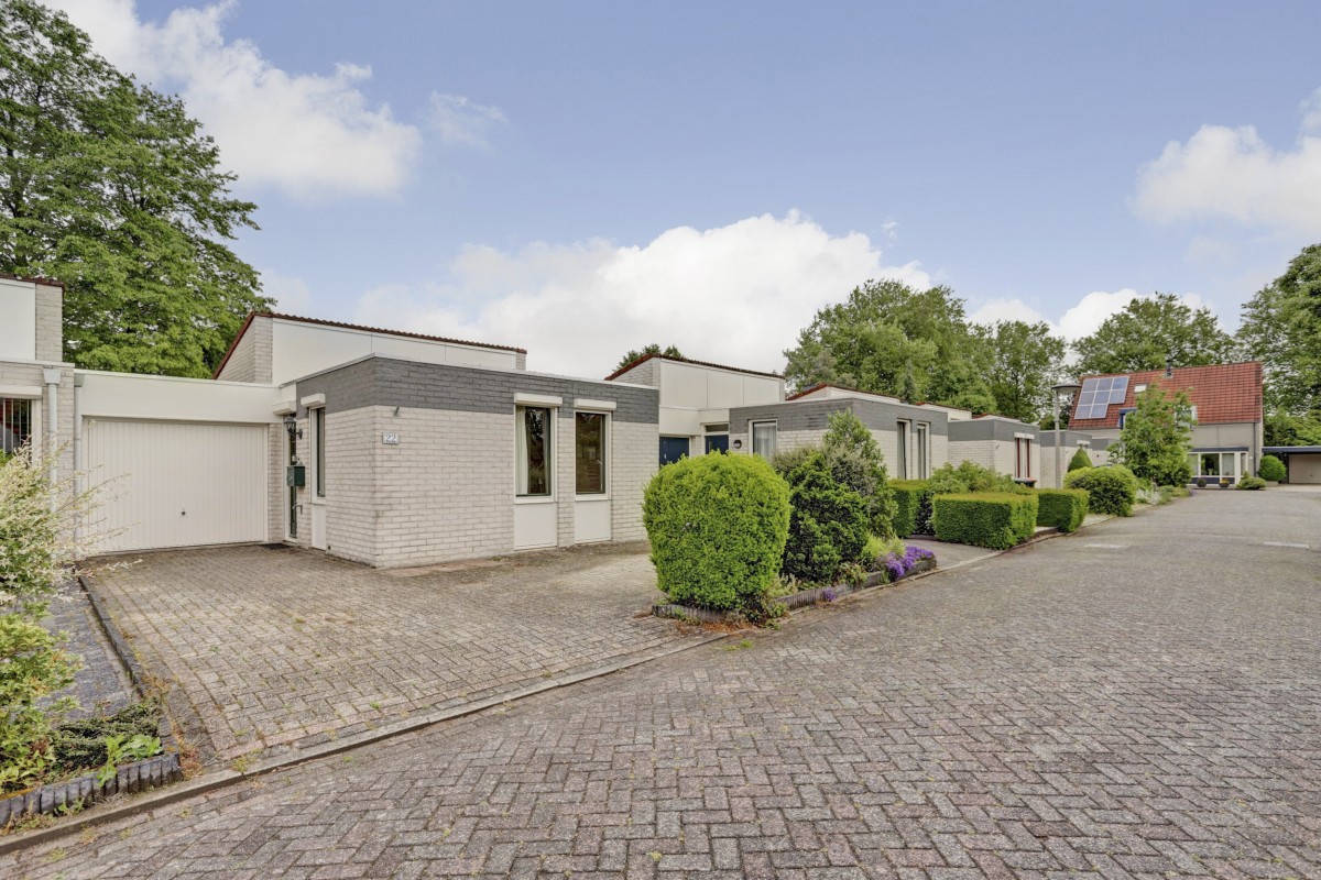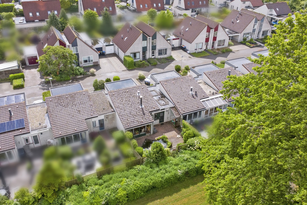 Begane grond: entree, hal met meterkast, toiletruimte met toilet en fonteintje, badkamer met ruime douche en wastafel met meubel. Aan de voorzijde van de woning zijn 2 slaapkamers gelegen. Aan de tuinzijde is de ruime lichte woonkamer gesitueerd met een sfeervolle houtkachel en een houten vloer. De woonkamer is aan de voorzijde vergroot door het bijtrekken van een werkkamer. De lichte keuken beschikt over voldoende kastruimte en een ingebouwde koelkast, combimagnetron, gaskookplaat en afzuigkap. Aangrenzend is de bijkeuken met wasmachineaansluiting en c.v.-ketel (Intergas HRE) gesitueerd, welke tevens beschikt over een binnendoor naar de stenen garage. Middels een stalen kanteldeur is de oprit te bereiken. Een loopdeur geeft vanuit de bijkeuken toegang tot de zonnige tuin welke op het westen gelegen is. De zonnige tuin grenst aan een openbare groenstrook is voorzien van een terras, een vijverpartij en vaste beplanting.