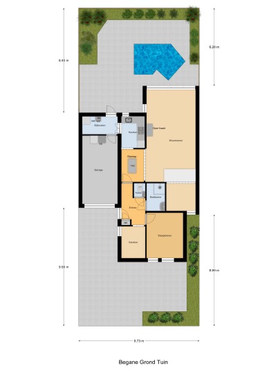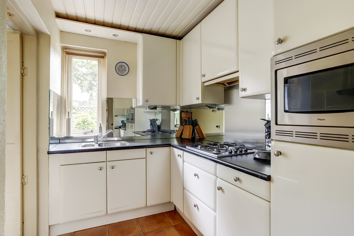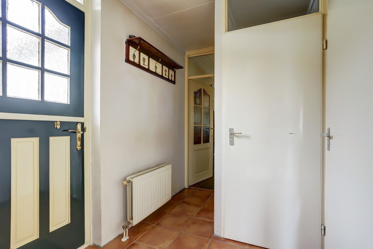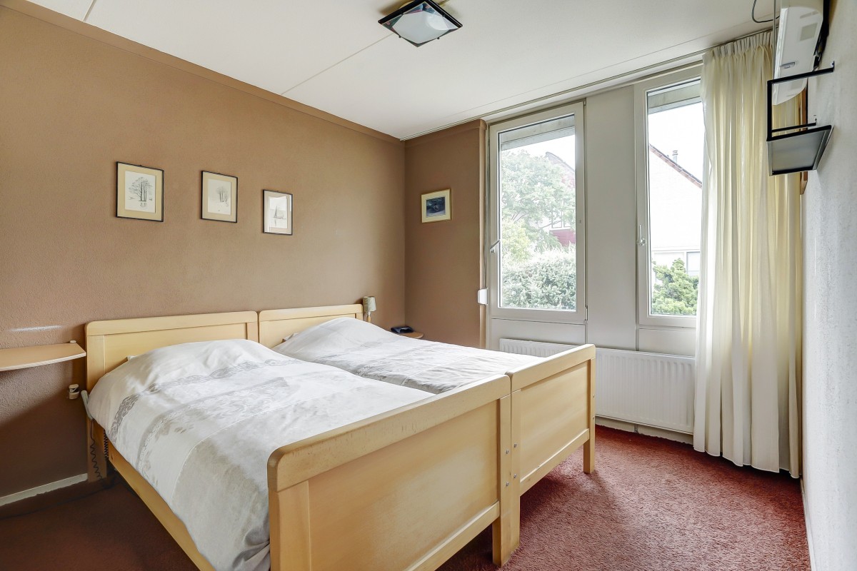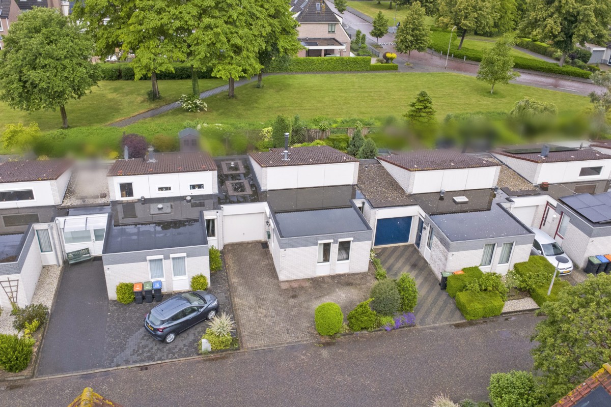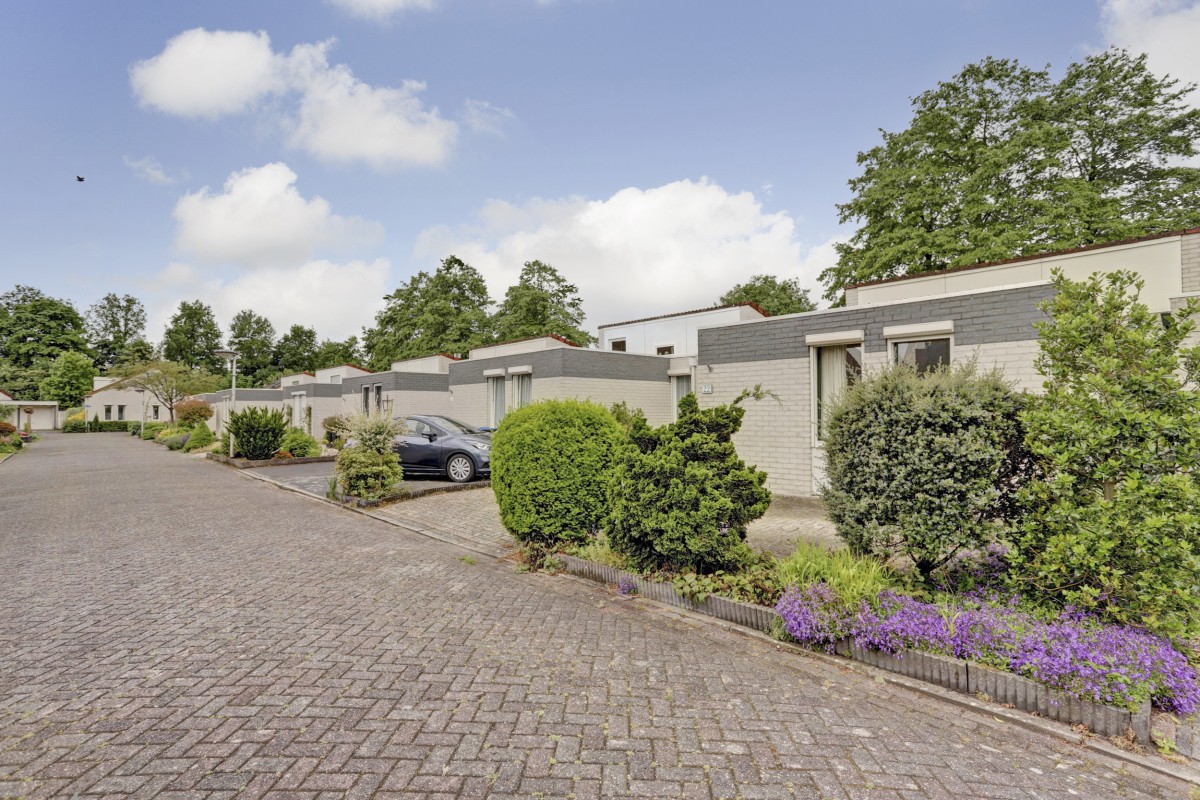 Begane grond: entree, hal met meterkast, toiletruimte met toilet en fonteintje, badkamer met ruime douche en wastafel met meubel. Aan de voorzijde van de woning zijn 2 slaapkamers gelegen. Aan de tuinzijde is de ruime lichte woonkamer gesitueerd met een sfeervolle houtkachel en een houten vloer. De woonkamer is aan de voorzijde vergroot door het bijtrekken van een werkkamer. De lichte keuken beschikt over voldoende kastruimte en een ingebouwde koelkast, combimagnetron, gaskookplaat en afzuigkap. Aangrenzend is de bijkeuken met wasmachineaansluiting en c.v.-ketel (Intergas HRE) gesitueerd, welke tevens beschikt over een binnendoor naar de stenen garage. Middels een stalen kanteldeur is de oprit te bereiken. Een loopdeur geeft vanuit de bijkeuken toegang tot de zonnige tuin welke op het westen gelegen is. De zonnige tuin grenst aan een openbare groenstrook is voorzien van een terras, een vijverpartij en vaste beplanting.