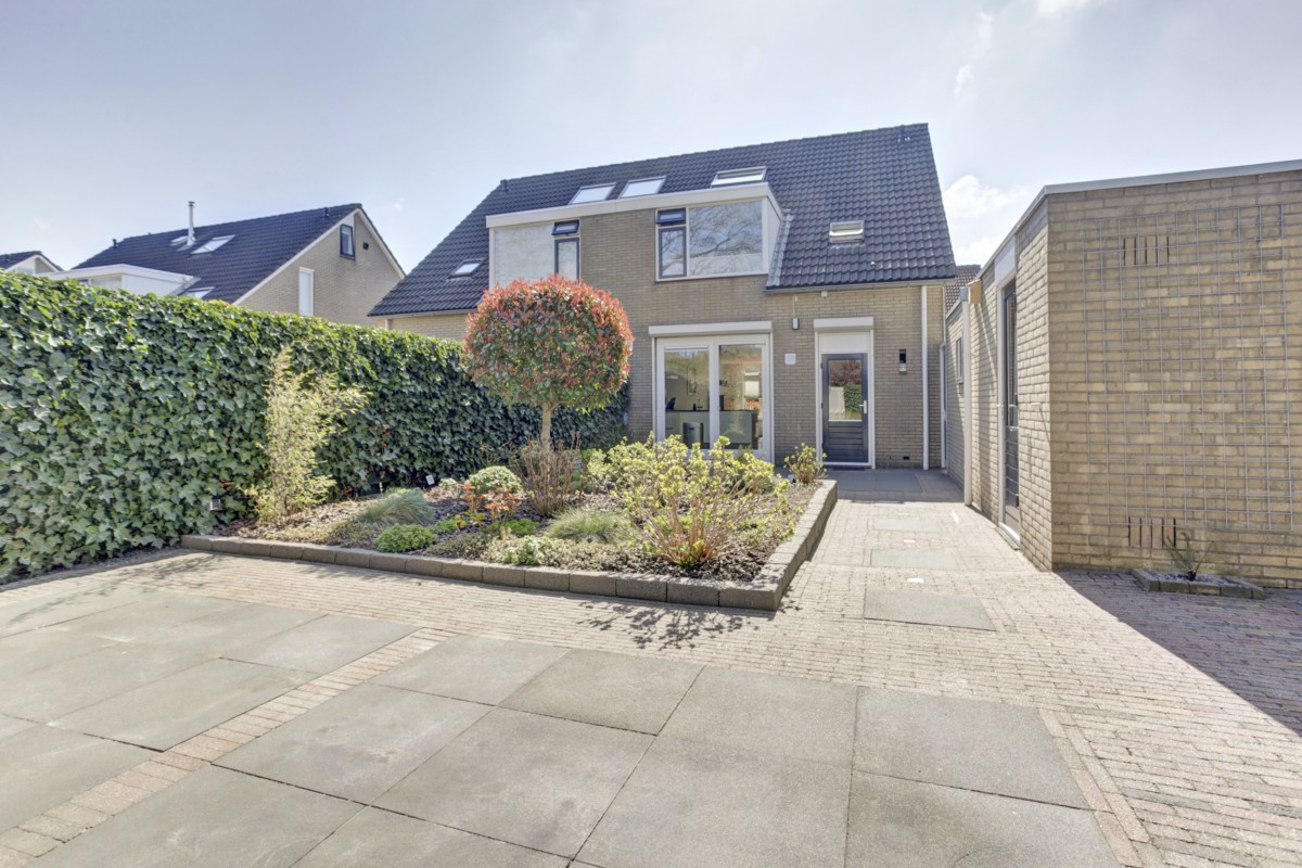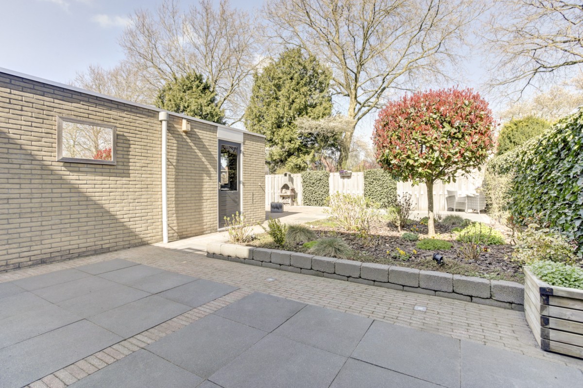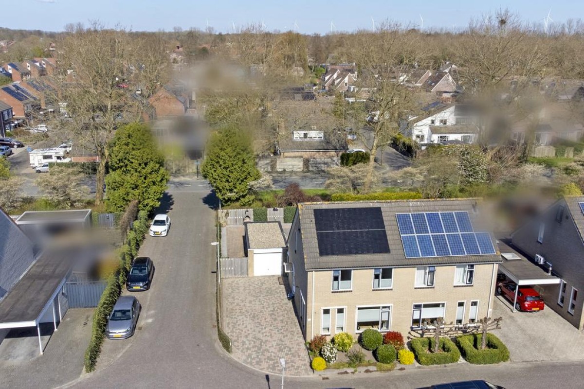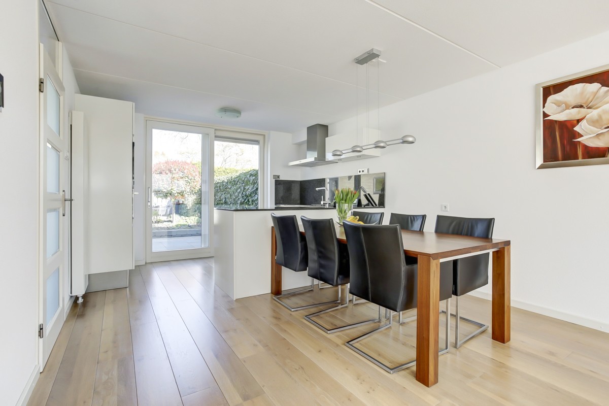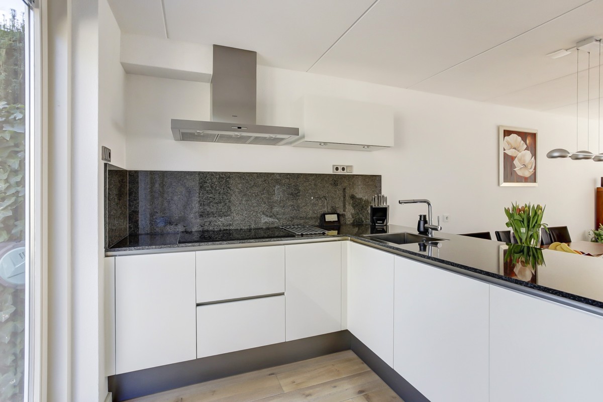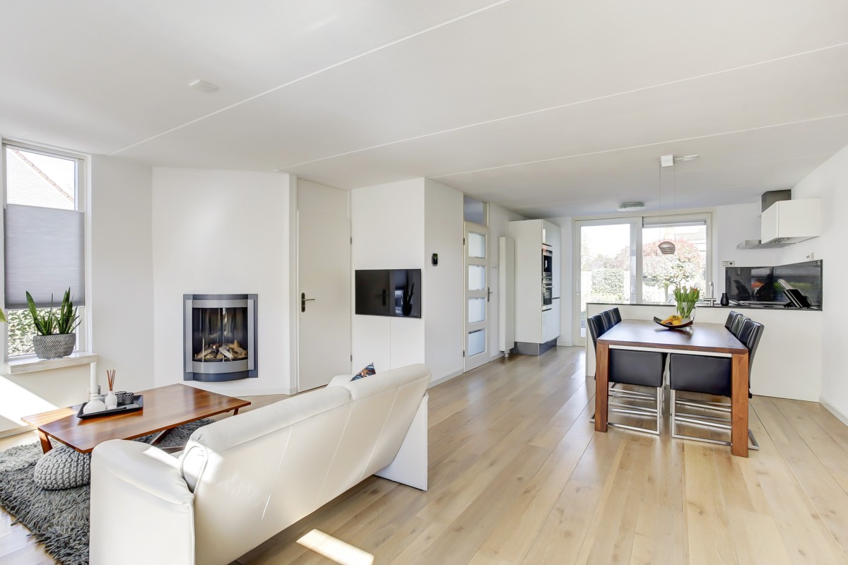 Begane grond: ruime oprit met vrijstaande stenen garage en overdekt entree, lichte ontvangsthal met garderobe, toiletruimte met hangcloset en fonteintje, uitgebreide meterkast en glasdeur naar de straatgerichte woonkamer. Aan de achterzijde van de woning is de luxe keuken gesitueerd welke beschikt over veel kastruimte, een groot granieten werkblad en een ingebouwde koffieautomaat, combi-oven, koel-/vrieskast, vaatwasser (2024), inductiekookplaat en afzuigkap. Aansluitend is de eethoek gesitueerd en aan de voorzijde van de woning een brede woonkamer met veel ramen, een provisiekast en gashaard. De tuin is middels een loopdeur vanuit de hal alsmede een schuifpui vanuit de keuken te betreden en onderhoudsarm aangelegd. De brede achtertuin heeft een poort langs de vrijstaande stenen garage en meerdere zonneterrassen.