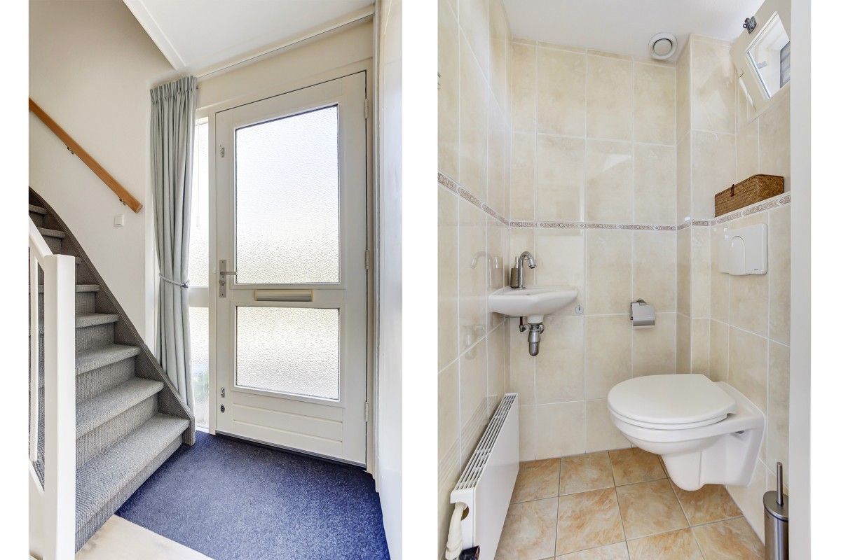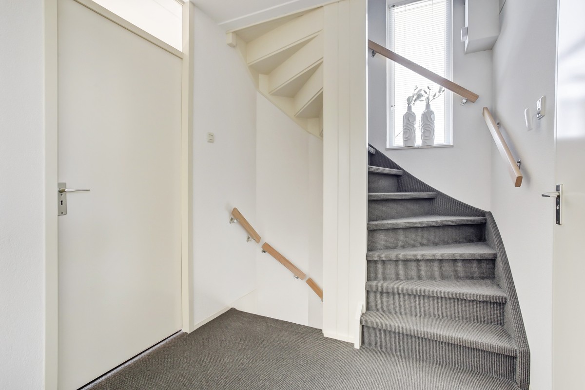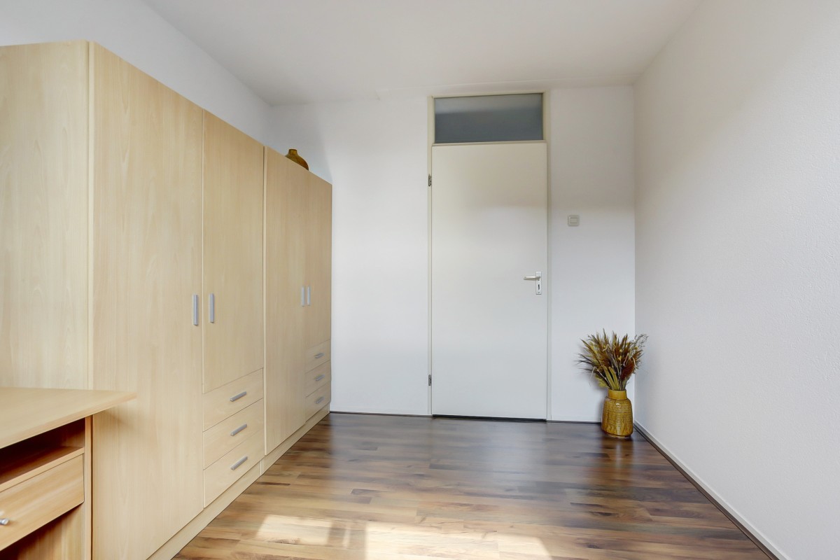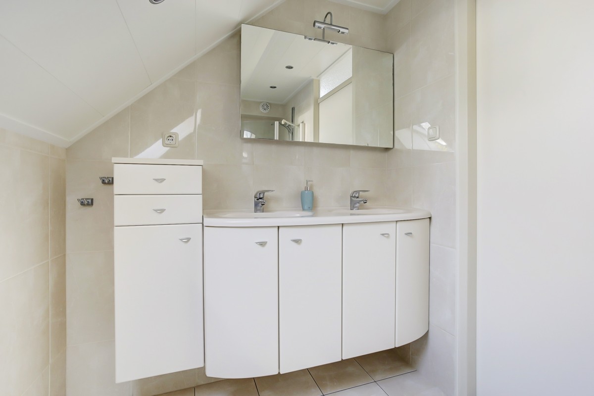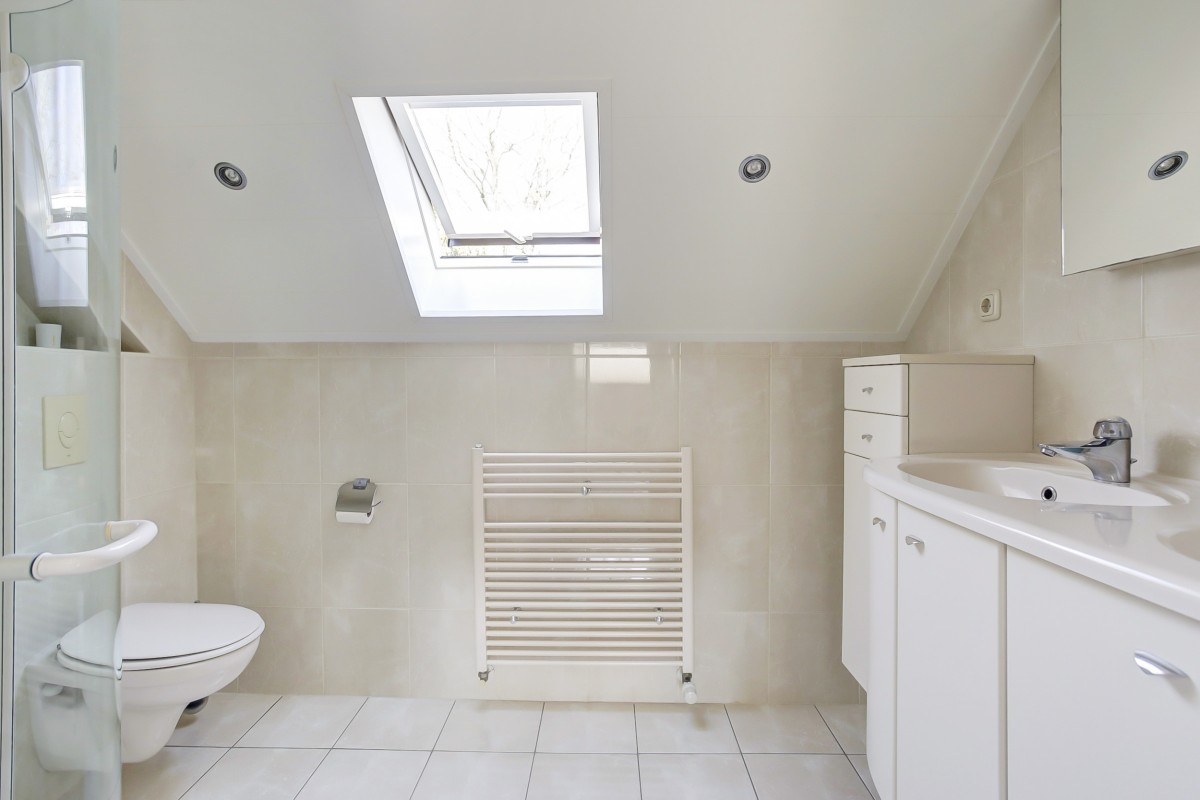 Eerste verdieping: vaste trap naar de overloop met aansluitend een drie slaapkamers en de badkamer. De slaapkamer aan de achterzijde is voorzien van een dakkapel en de overloop en slaapkamers beschikken over een laminaatvloer. De badkamer heeft een dakraam, meubel met dubbele wastafel, 2e hangcloset en douche met glasdeuren.
