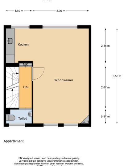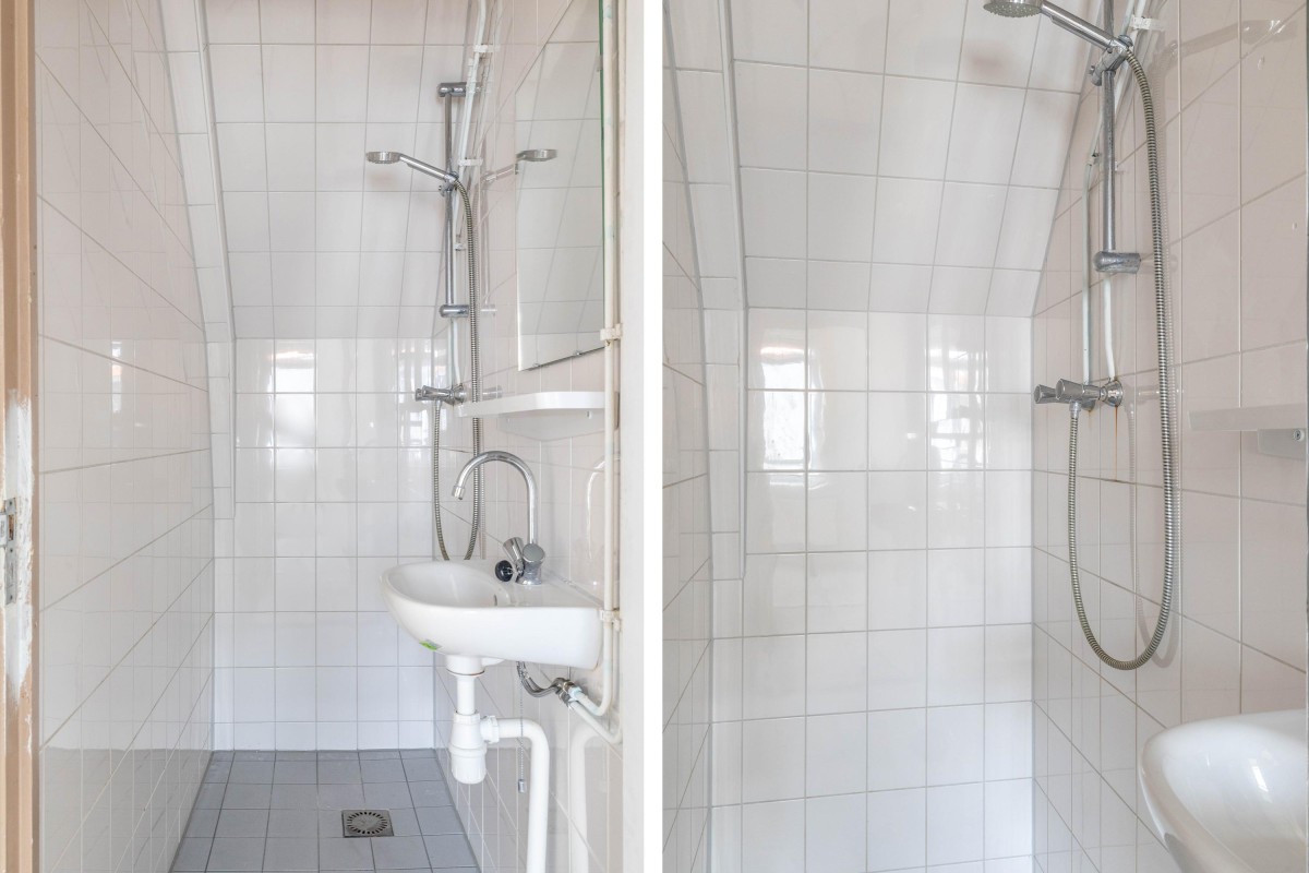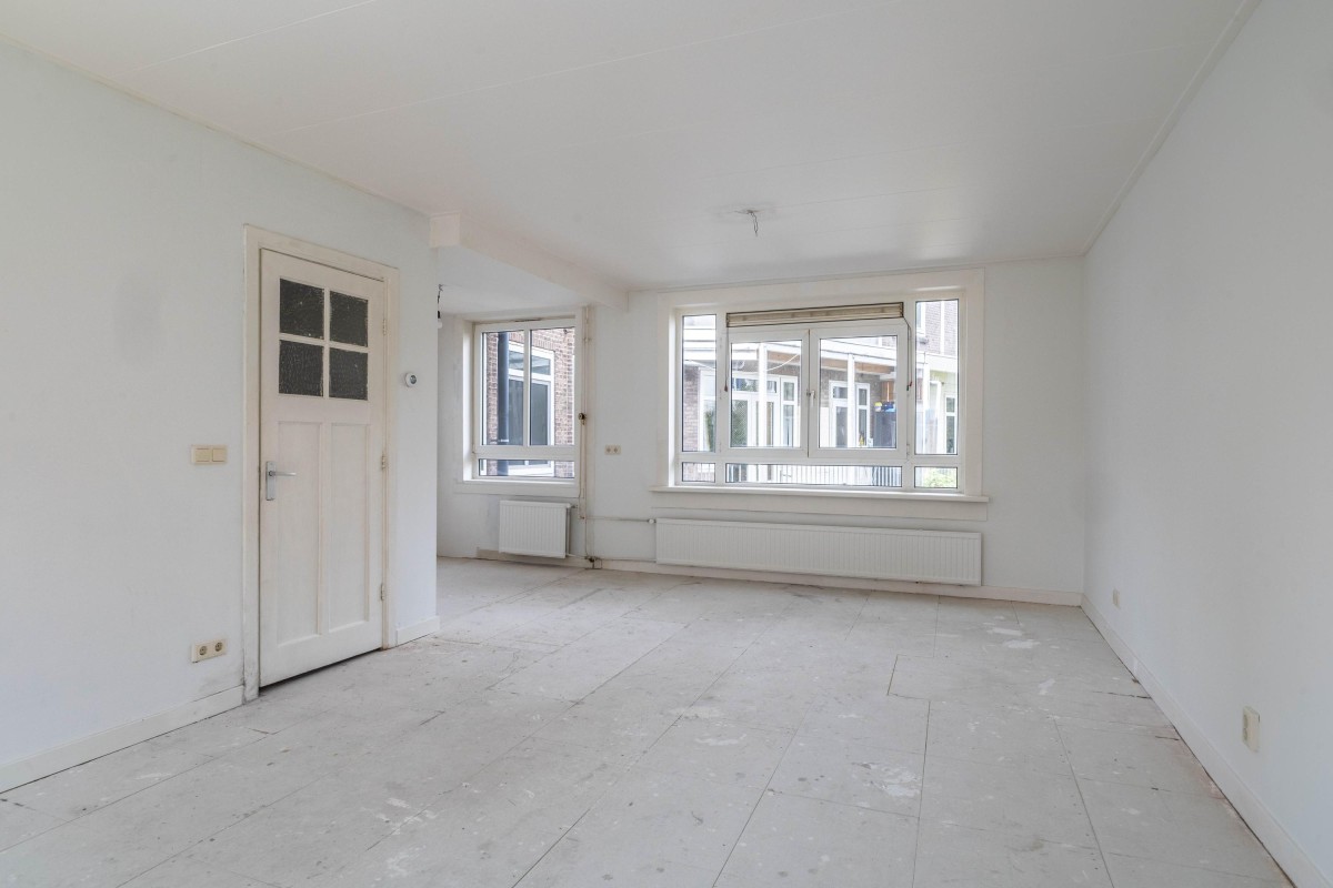 Via your own private entrance, you reach the staircase leading to the first floor where the home is located. From the hallway, you enter the spacious through-living room, which benefits from abundant natural daylight thanks to windows on both sides. The open kitchen is in shell condition, allowing you to finish it entirely to your liking. From the hallway, you also have access to a separate toilet with a small sink, or you can take the stairs up to the second floor.