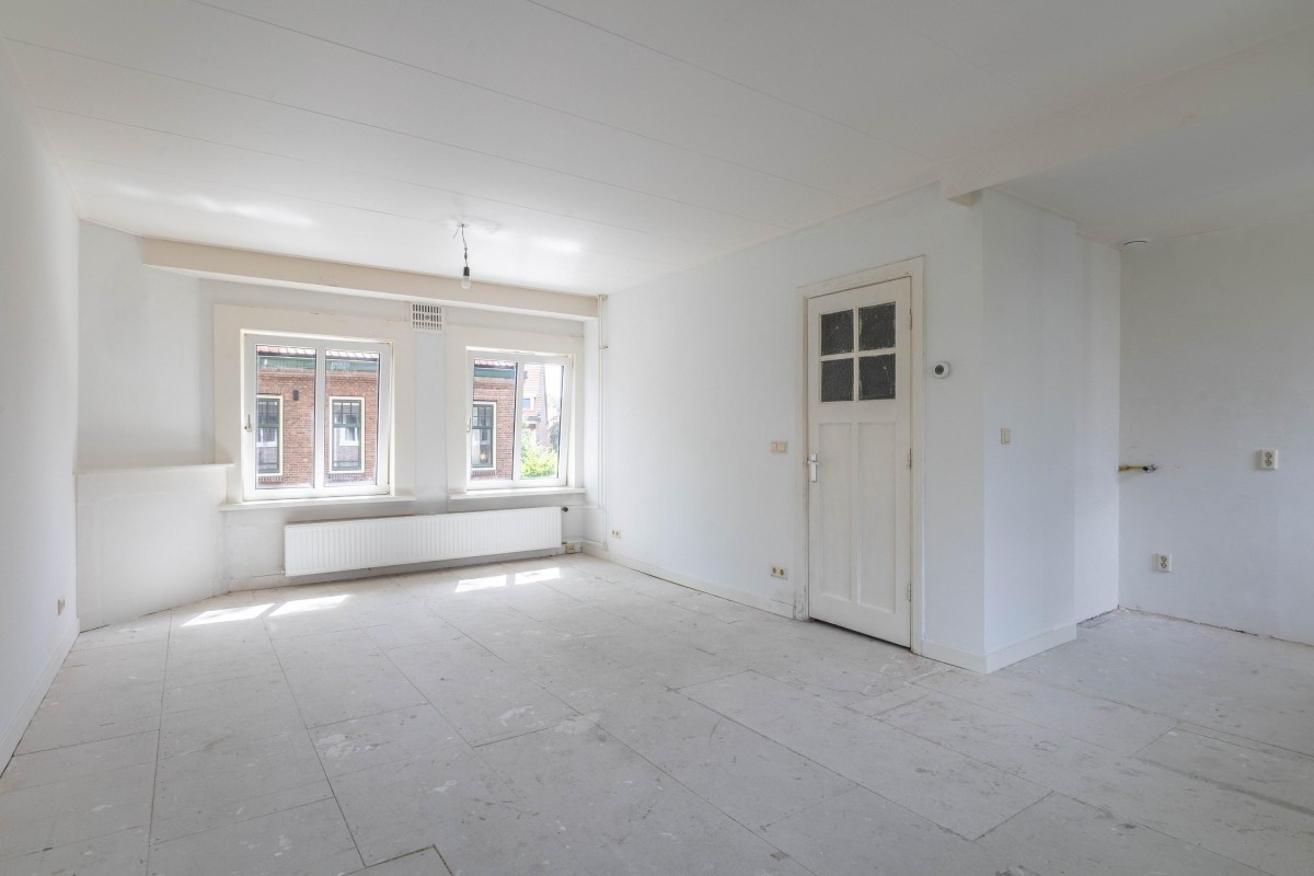 Via uw eigen voordeur bereikt u de trap die leidt naar de eerste verdieping, waar deze woning is gelegen. Vanuit de hal stapt u de ruime doorzonwoonkamer binnen, die profiteert van veel natuurlijk daglicht dankzij raampartijen aan twee zijden.