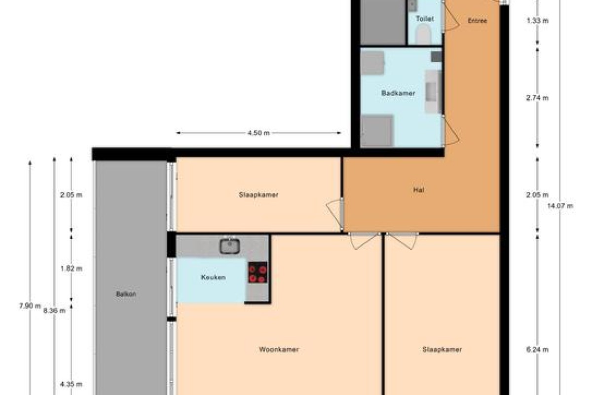 Entree, gang met toegang tot de ruime, lichte woonkamer met grote raampartijen voorzien van openslaande deuren en zonwering. Aansluitend is er een half open keukenruimte ingericht v.v inbouwapparatuur en deur naar het ruime balkon.