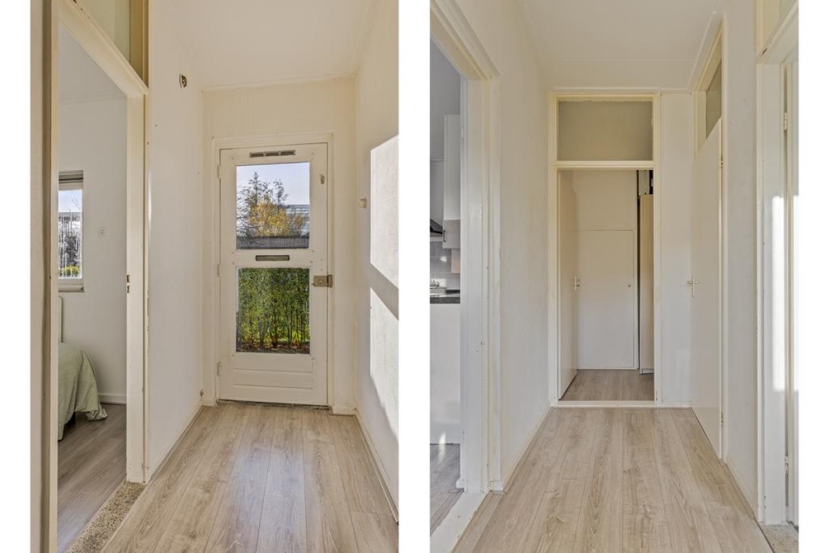 Entree, hal, gezellige woonkamer met open keukenopstelling voorzien van inbouwapparatuur.