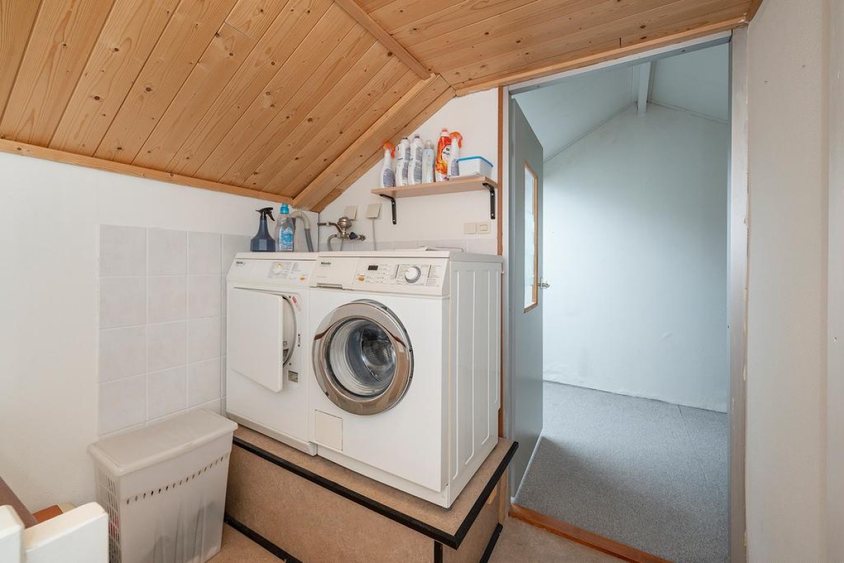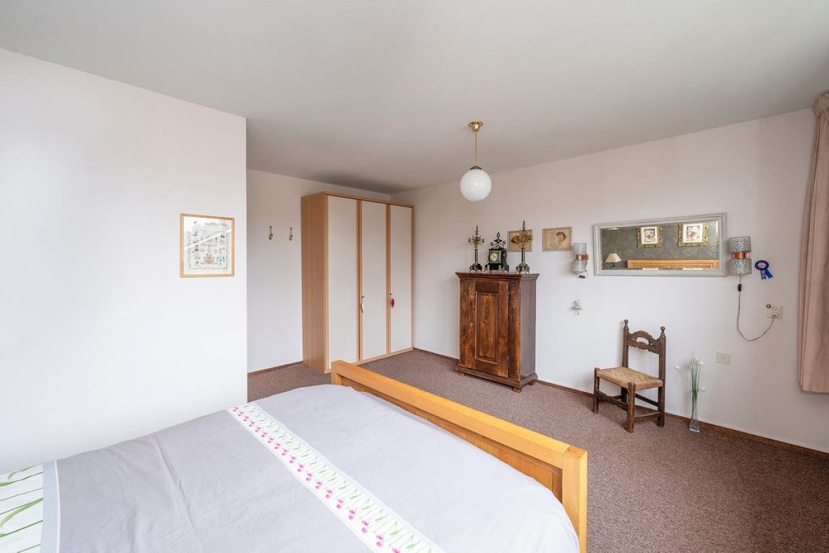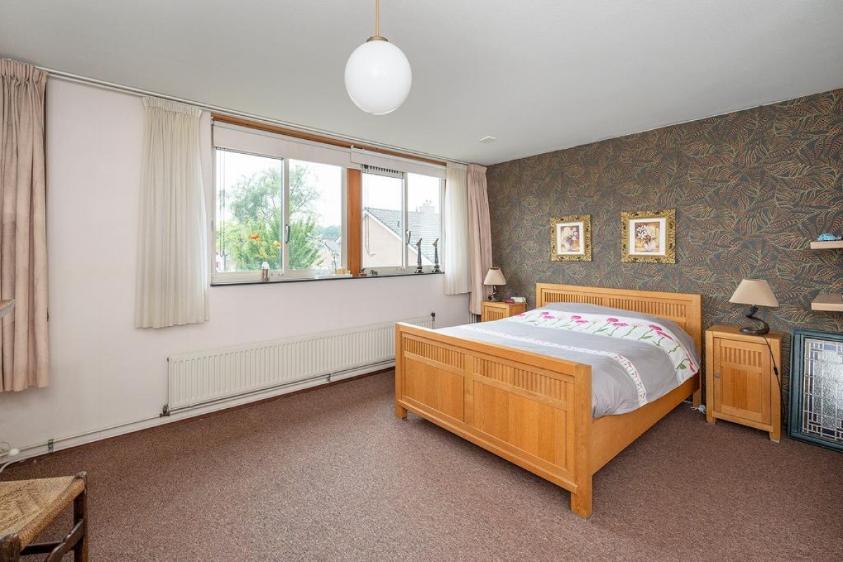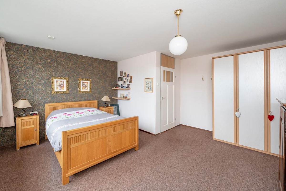 Ruime overloop met toegang tot de slaapkamers, oorspronkelijk zijn er drie slaapkamers aanwezig. Momenteel zijn de twee slaapkamers aan de achterzijde bij elkaar getrokken. De royale ouderslaapkamer van ca. 20 m2 bevindt zich aan de achterzijde. De badkamer is voorzien van een douche, wastafel, aansluiting voor de wasmachine en een 2e toilet. Aan de voorzijde bevindt zich de andere slaapkamer.