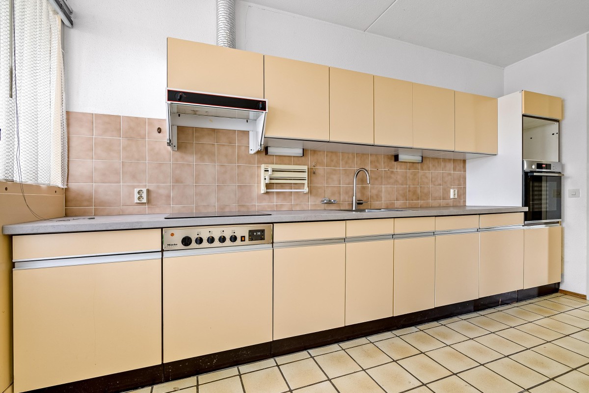 De royale woonkamer van 38 m² biedt alle ruimte voor een gezellige zithoek en een ruime eethoek. De halfopen keuken van tien vierkante meter sluit hier mooi op aan en heeft toegang tot het balkon.