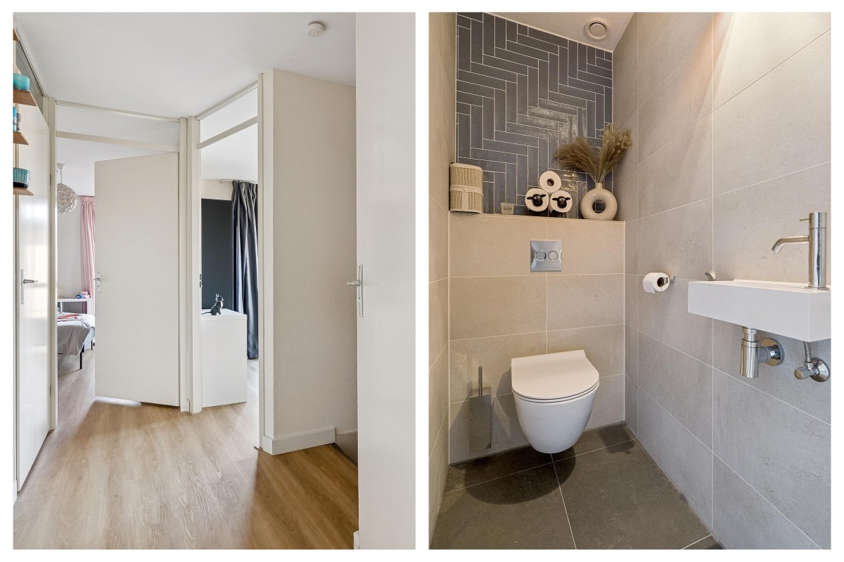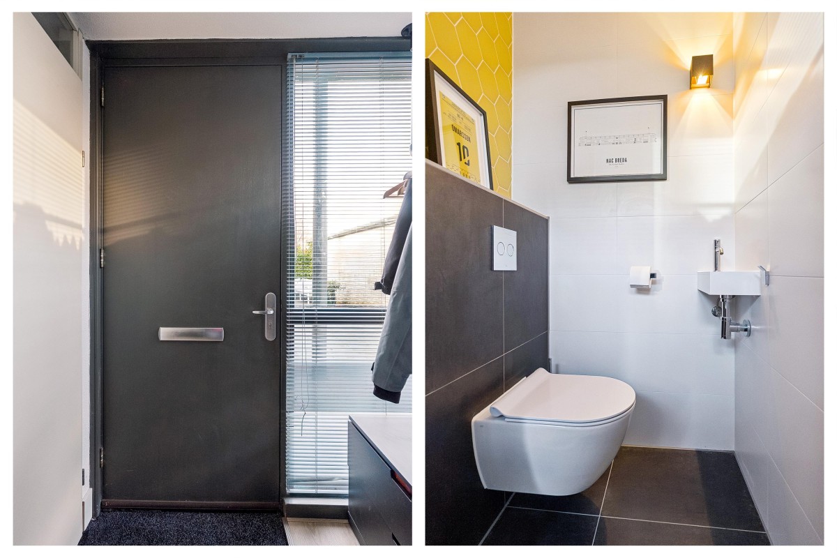 Bij aankomst is er voldoende parkeerruimte voor twee auto's op eigen terrein. Via de voortuin bereikt u de entree van de woning. In de hal heeft u toegang tot alle vertrekken, waaronder een vernieuwd (2025) vrijhangend toilet met fonteintje en de trap naar de bovenverdieping..