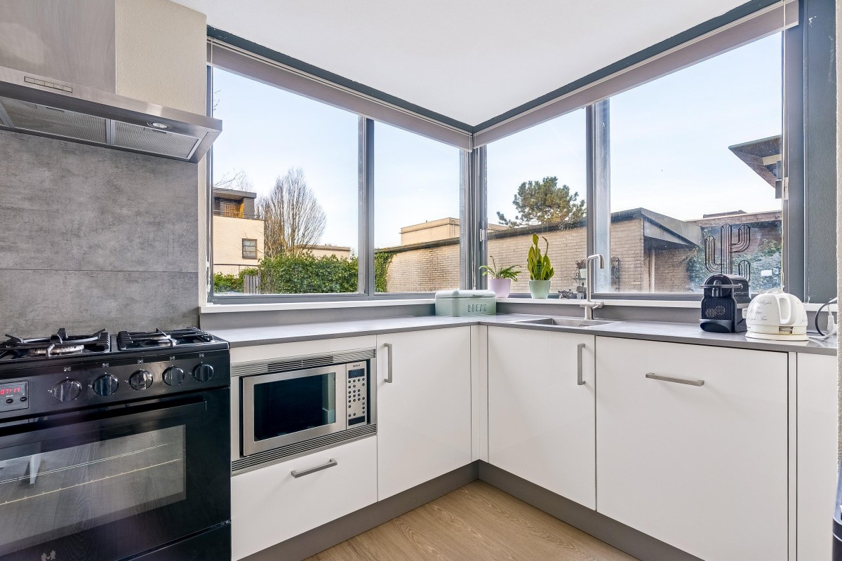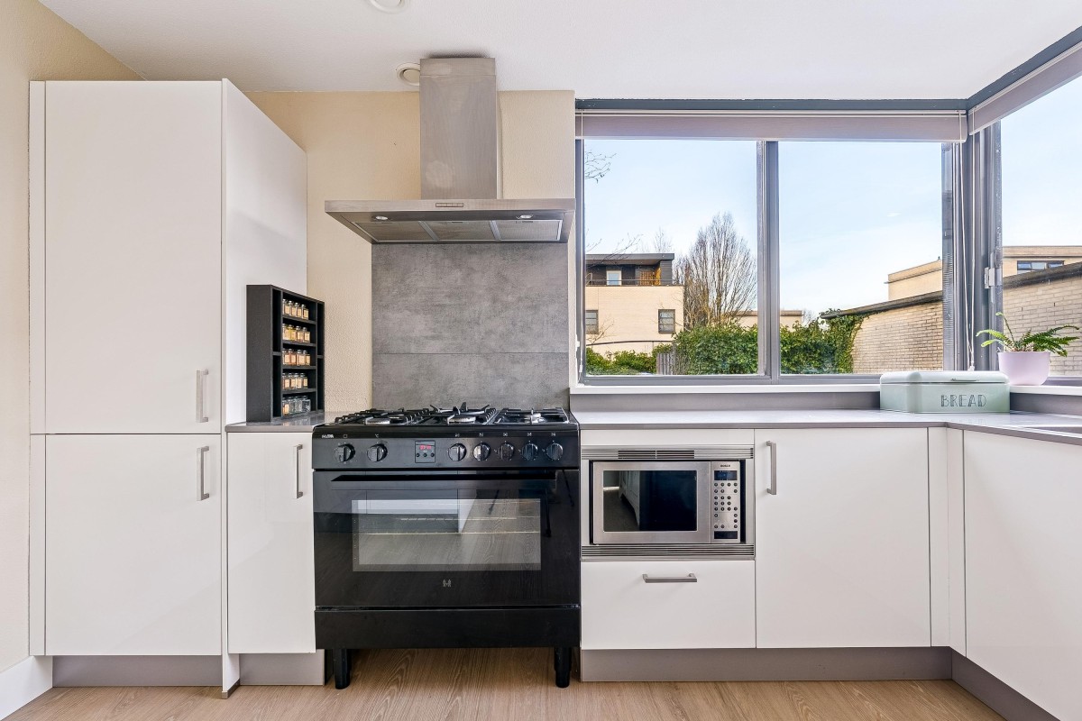 De woonkamer bevindt zich aan de achterzijde en is zeer licht door de vele raampartijen in de woning. Vanaf de bank kunt u heerlijk staren naar het water. Via een schuifpui heeft u direct toegang tot het zonnige balkon aan het water. De keuken is volledig ingericht en biedt uitzicht op de tuin. Deze is voorzien van een koelkast, vriezer, oven, aparte magnetron, afzuigkap, vaatwasser en een gasfornuis met wokbrander. De gehele begane grond is afgewerkt met een nieuwe PVC-vloer, inclusief vloerverwarming (ter ondersteuning van de hoofdverwarming).