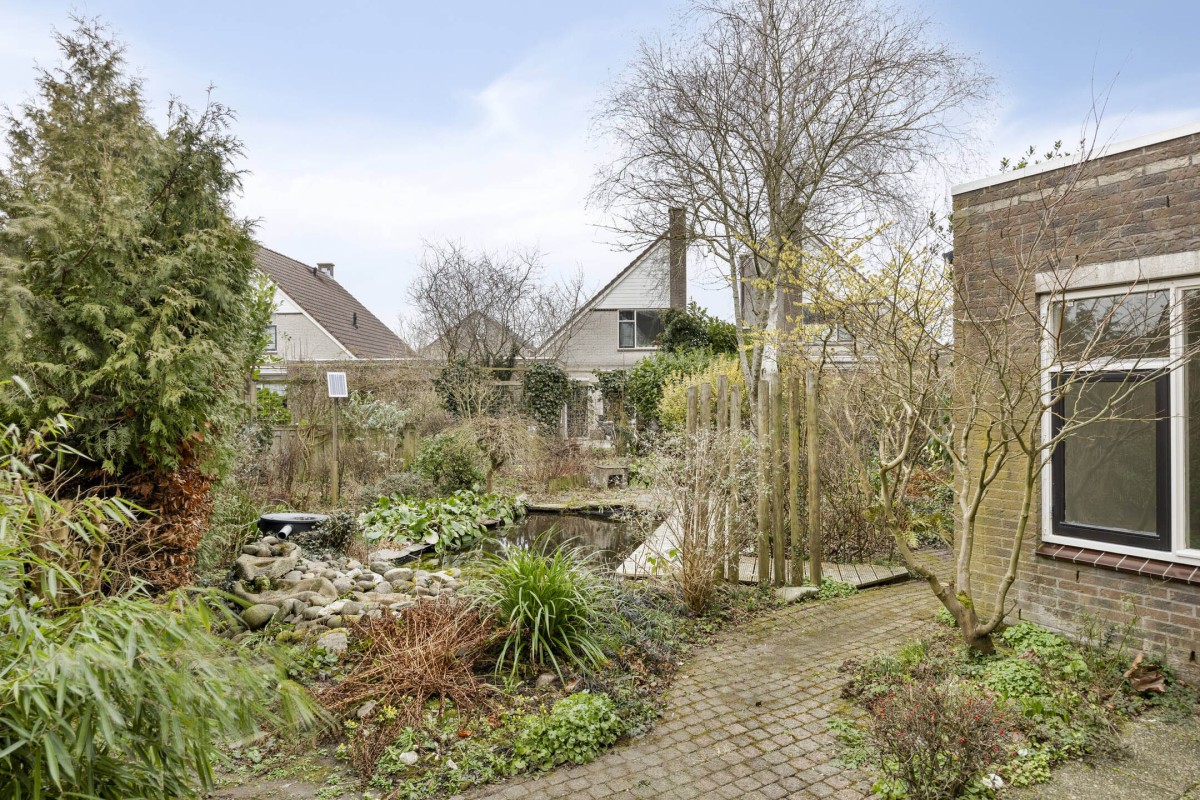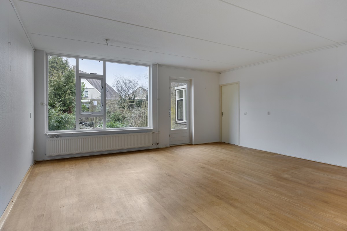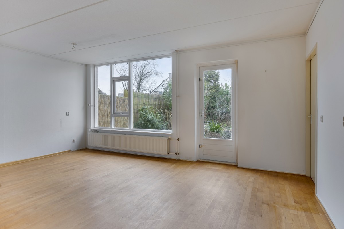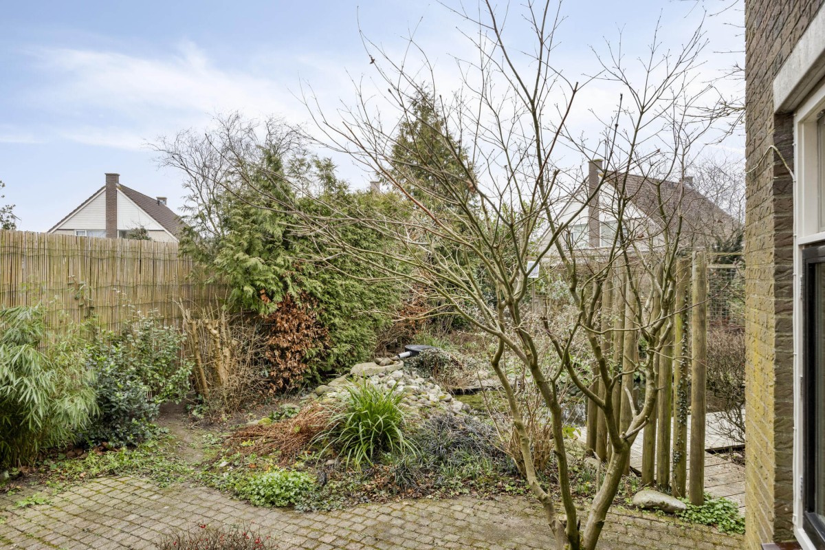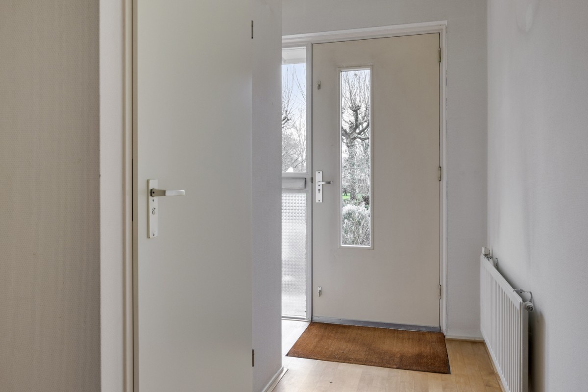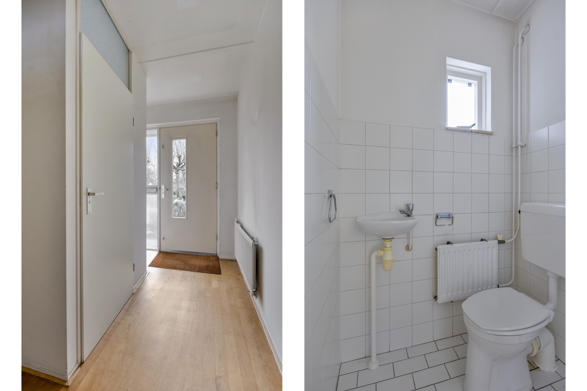 Entree, toilet met fonteintje, toegang tot de extra brede garage. De woonkamer (ca. 30 m2) is tuingericht en is gelegen op het noordwesten.