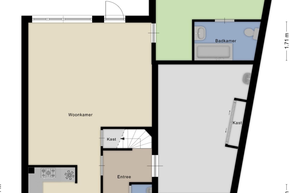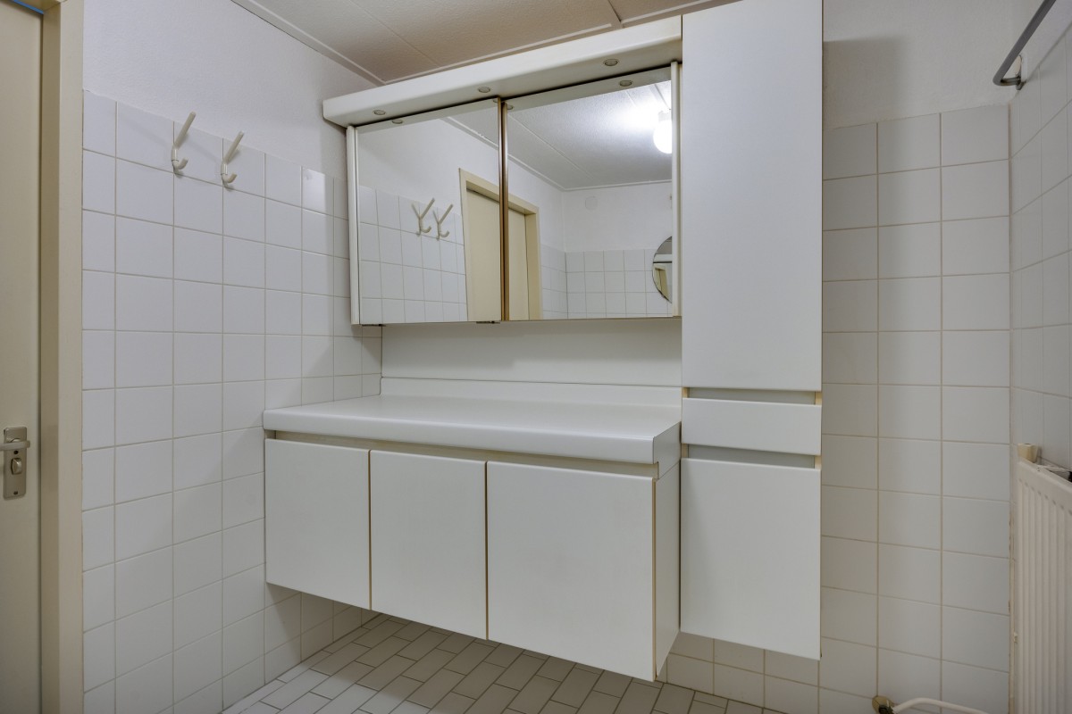 Vanuit de woonkamer komt u in de slaapkamer met badkamer. Deze is voorzien van ligbad, douche, toilet en wastafel. De keuken is eenvoudig uitgevoerd en is gesitueerd aan de voorzijde.