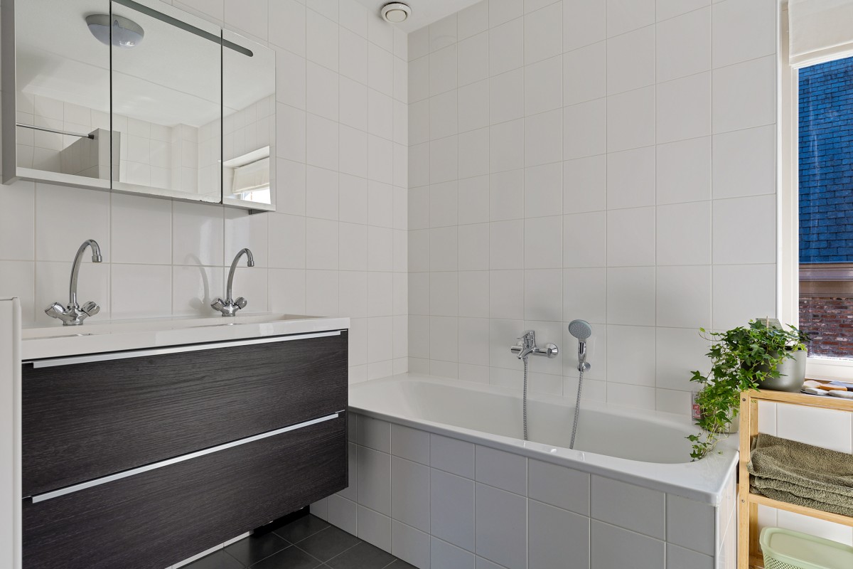De badkamer is uitgerust met een ligbad, inloopdouche, wastafelmeubel met dubbele kraan en een vrij-hangend toilet.