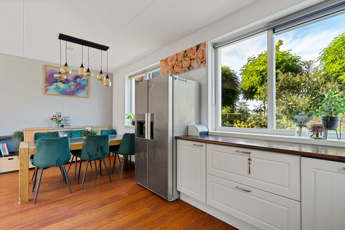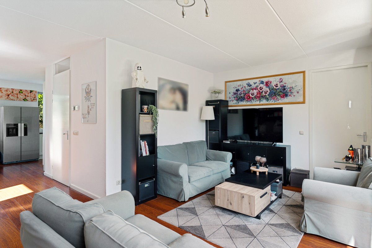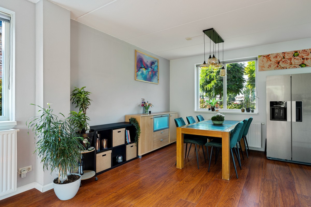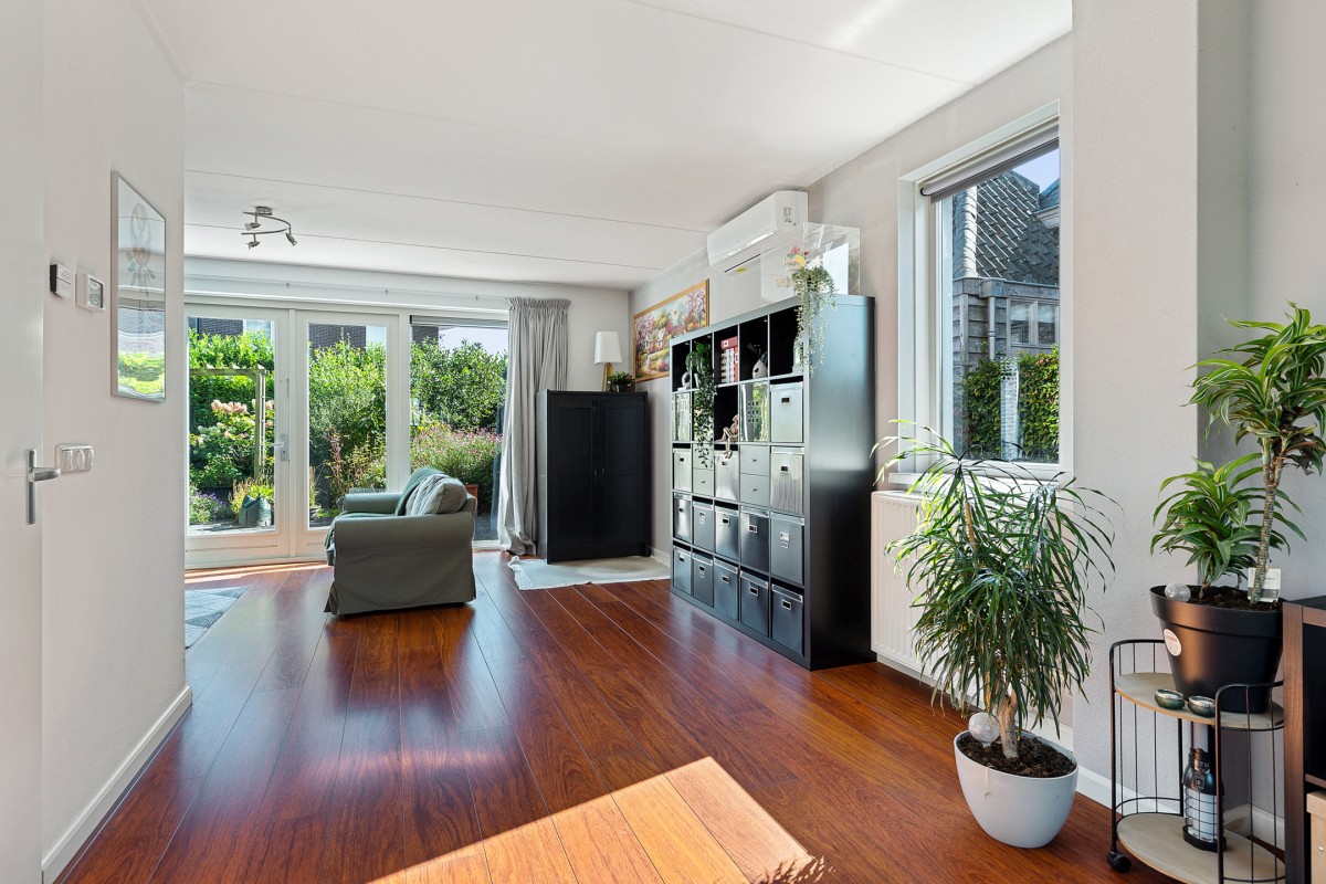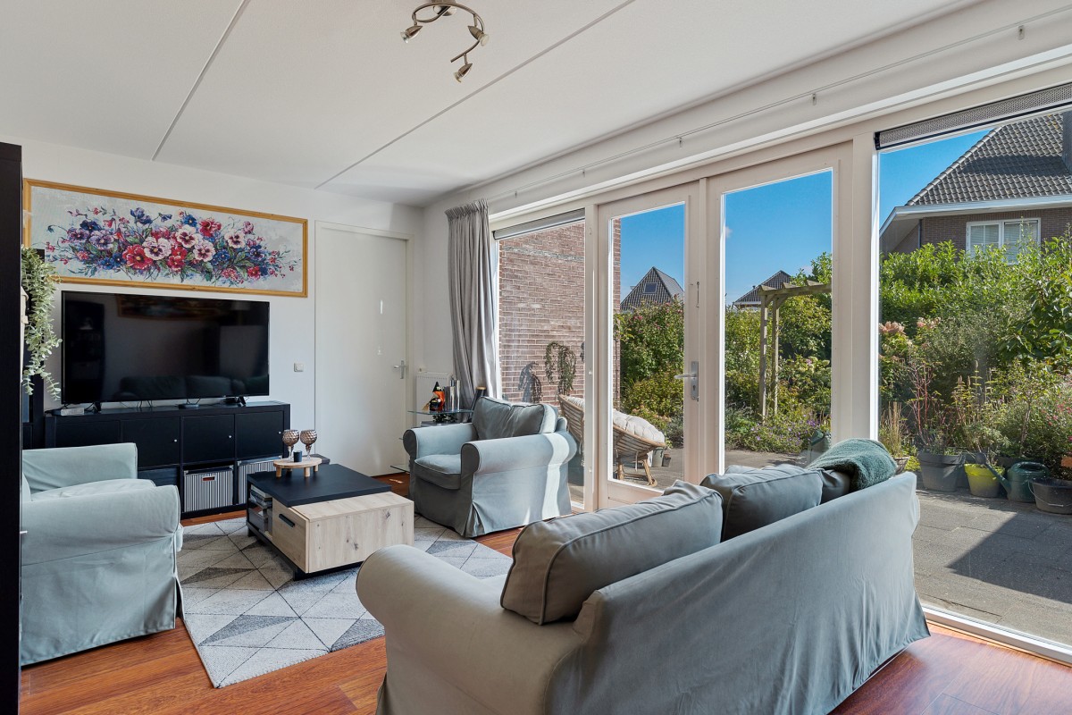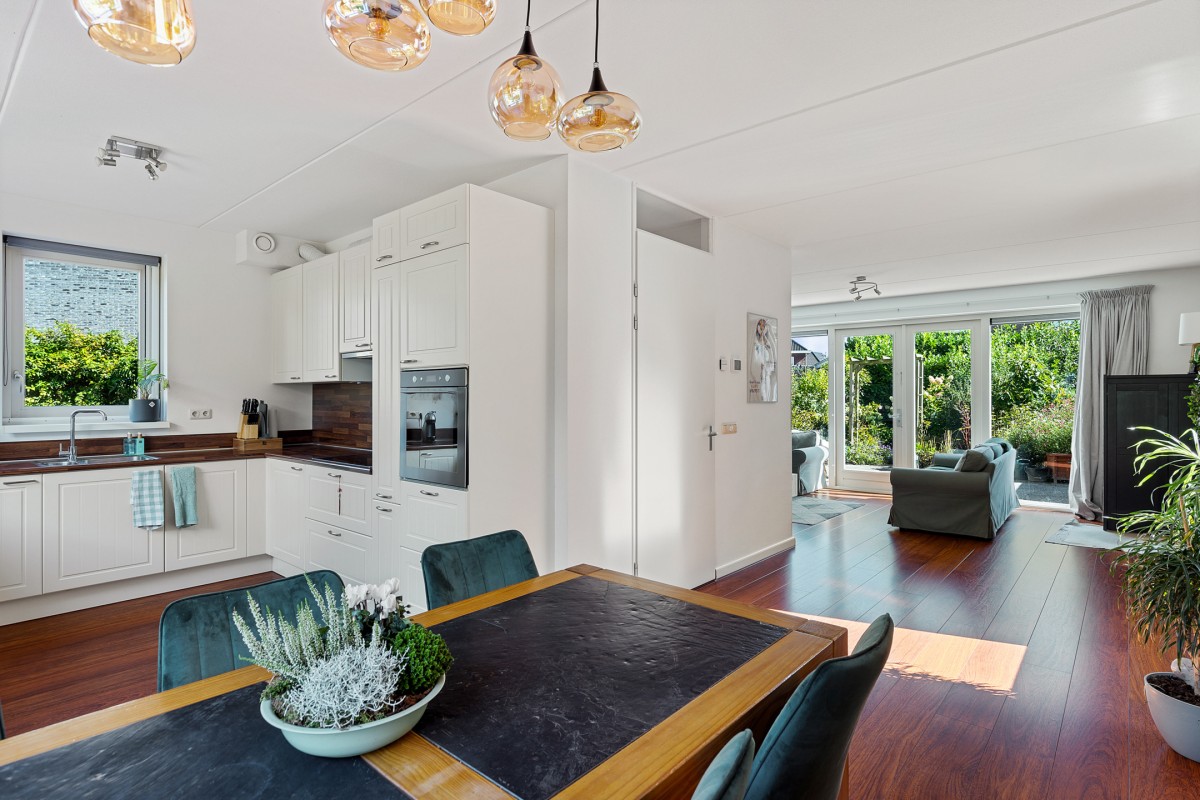 De woning beschikt over een heerlijke woonkamer waarin ruimte en licht perfect samenkomen. Dankzij de grote raampartijen stroomt het natuurlijke daglicht naar binnen, wat zorgt voor een aangename en open sfeer. De indeling biedt volop mogelijkheden voor een comfortabele zithoek. Via de dubbele openslaande deuren is de achtergelegen verzorgde tuin bereikbaar.