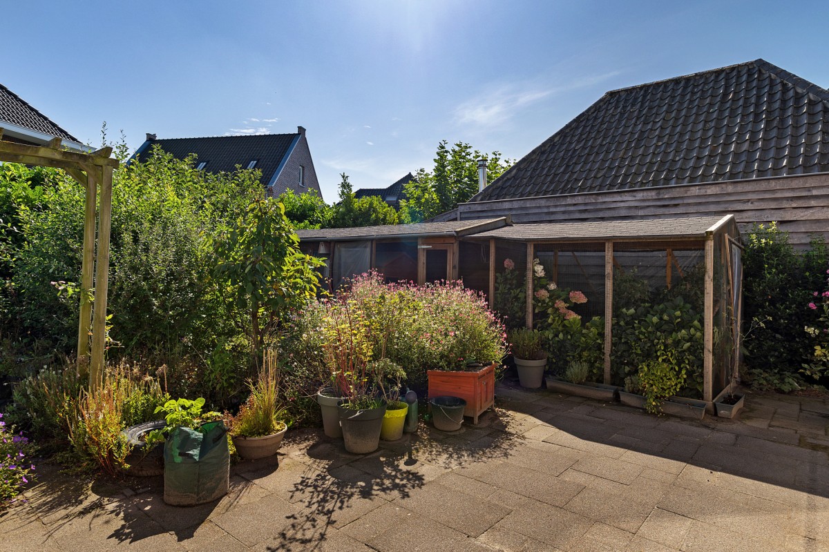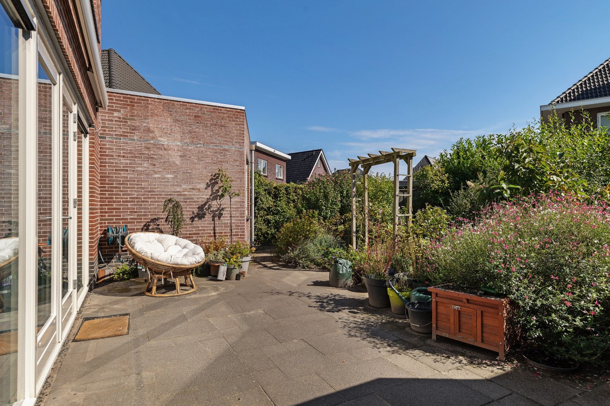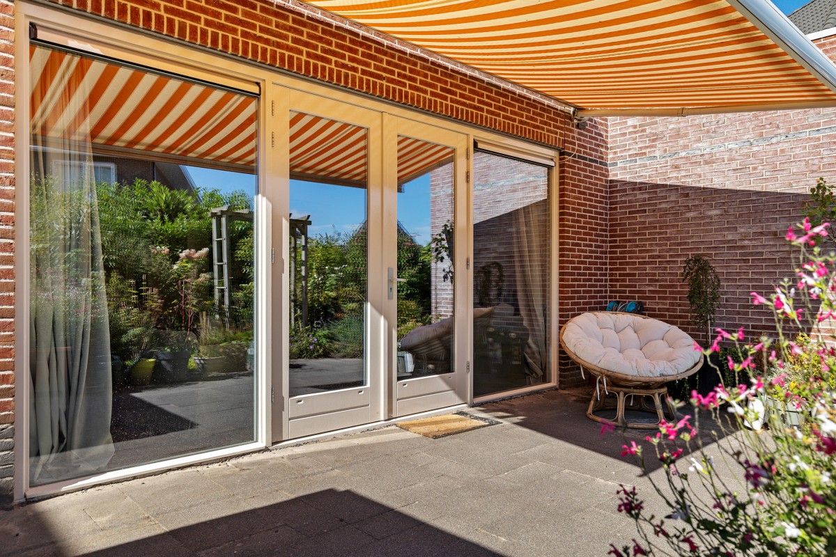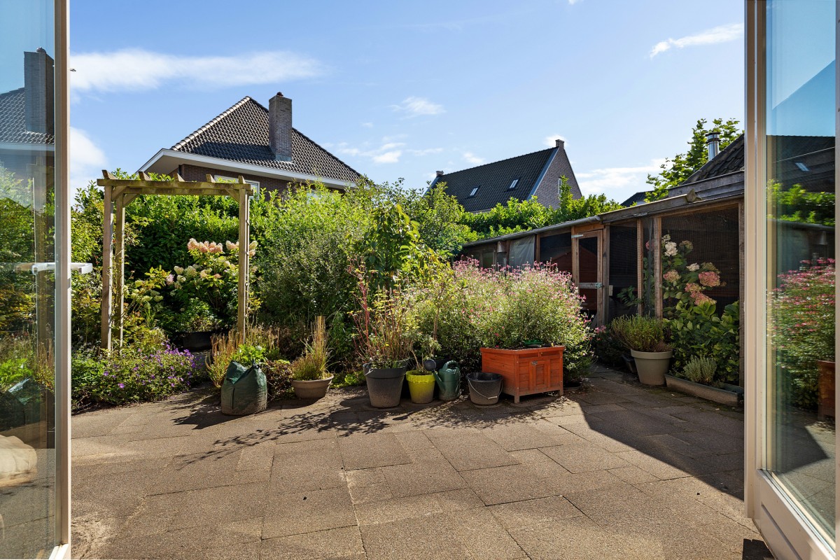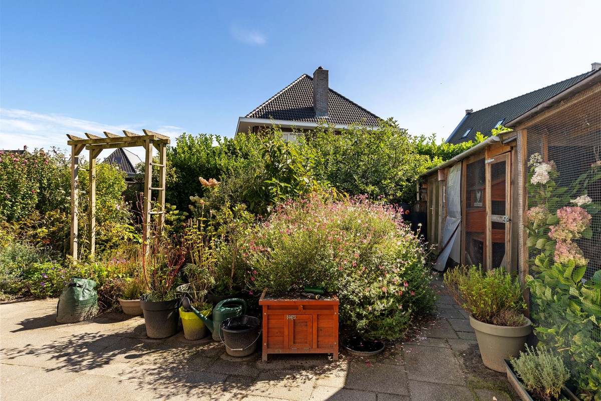 De zonnige achtertuin is gelegen op het zuidoosten en biedt daarmee vrijwel de hele dag zon. Direct aan de woning bevindt zich een ruim terras, ideaal om te genieten van lange zomerse avonden. De tuin is sfeervol aangelegd met een variatie aan planten en struiken, waardoor er altijd iets in bloei staat en u kunt genieten van groen en privacy. Voor extra comfort is aan de gevel een elektrisch bedienbaar zonnescherm geplaatst, zodat u desgewenst ook een fijne schaduwrijke plek creëert
