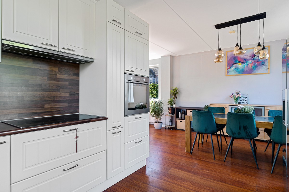 De keuken is aan de voorzijde van de woning gesitueerd en is voorzien van een vaatwasser, een Amerikaanse koelkast, een brede inductie kookplaat en een afzuigkap.